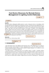 Fast Device Discovery for Remote Device Management in Lighting Control Networks Arial, Bold 16pt Arial, Bold 9pt Abstract The Remote Device Management (RDM) protocol is used to manage the devices in the lighting control networks. RDM provides bi-directional communications between a controller and many lighting devices over the DMX512-A network. In RDM, using a simple binary search scheme, which is based on the 48-bit unique ID (UID) of each device, discovers the lighting devices. However, the existing binary search scheme tends to require a large delay in the device discovery process. In this paper, we propose a novel partition-based discovery scheme for fast device discovery in RDM. In the proposed scheme, all devices are divided into several partitions as per the device UID, and the controller performs device discovery for each partition by configuring a response timer that each device will use. From numerical simulations, we can see that there is an optimal number of partitions to minimize the device discovery time for a given number of devices in the proposed scheme, and also that the proposed partition-based scheme can reduce the device discovery time, as Arial, Bold 9pt compared to the existing binary search scheme. Times New Roman, 9pt Keywords Device Discovery, Partition-Based, RDM Arial, Bold 14pt 1. Introduction Times New Roman, 9.5pt One of the primary issues in the lighting control network is how to effectively manage a lot of devices within the network. Some protocols for device management have so far been made in the PLASA Technical Standards Program (TSP) [1], which includes the Digital Multiplex 512-A (DMX512-A) [2] and Remote Device Management (RDM) [3]. The RDM protocol is performed based on the polling system, in which a controller initiates communication and the devices will respond to the request of controller. RDM is used for the discovery and management of devices that are connected through the DMX512-A link. For device discovery, the controller uses a simple binary search scheme, based on the 48-bit unique ID (UID). However, this device discovery scheme tends to require a lengthy discovery time due to exploring the 248 theoretically www.kips.or.kr Copyright© XXXX KIPS Aria, 6pt Fast Device Discovery for Remote Device Management in Lighting Control Networks possible devices, even though a controller is usually able to handle only tens of thousands. In this paper, we propose a partition-based discovery scheme for fast device discovery in RDM. In the proposed scheme, all devices in the RDM network are divided into several partitions as per the device UID, and the controller performs the device discovery for each partition by using a suitable response timer for the devices. This paper is organized as follows: Section 2 discusses the existing device discovery scheme. In Section 3, we propose the fast device discovery scheme for RDM. In Section 4, we analyze and compare the existing and proposed schemes in terms of device discovery times. Section 5 concludes this paper. Arial, Bold 14pt 2. Existing Device Discovery Scheme In RDM [3], a simple binary search scheme is used for device discovery, which is based on the 48-bit UID of each device. Fig. 1 shows the existing device discovery scheme, in which a controller performs a binary search for devices with the UIDs ranging from 0 to 2 48. Arial 12pt 2.1 Wavelet Filterbank Theory Initially, the controller sets the UID search range with (lower, upper) and sends a discovery message to all of the devices in the RDM network. If the controller responds to a single response message, the corresponding device will be successfully found. Otherwise, if two or more devices have responded at the same time, the controller cannot process the multiple response messages due to the characteristics of the DMX512-A link [2]. This is because the DMX512-A link does not use the packet scheduling functionality and thus, multiple response messages will be simply corrupted and discarded by the controller. In this case, the controller will further divide the UID search range into the two parts. Start: Search Range (0, 248) Search Range (lower, upper) Send discovery message Found Single Search Range (mid+1, upper) Response? None Times New Roman , Bold 9.5pt End: Search Range Complete Multiple Search Range (lower, mid) Times New Roman, 9.5pt Fig. 1. Existing device discovery in Remote Device Management (RDM). 2 | J Inf Process Syst, 3. Proposed Device Discovery Scheme Arial, Bold 14pt The existing device discovery scheme gives a lengthy device discovery time because the 48-bit UID search range (248) tends to induce very deep tree levels along the binary search tree. Thus, we propose a new device discovery scheme, called partition-based device discovery. In the proposed scheme, all devices in the network will be grouped into Np partitions, as shown in Fig. Arial, 7pt 2. Partition 0 Partition Np-1 Partition 1 Fig. 2. Partitions of devices in Remote Device Management (RDM). Given the number of partitions (Np), the partition of a device (0, 1, .., Np-1) is determined by using the modulo (%) operator and the device UID, as follows: Partition of device UID = UID % Np. Arial, Italic 9.5pt Then, the proposed scheme is performed for each partition, as shown in Fig. 3. Start: Set Np k=0 Stop: Complete Yes k >= Np No Set MRT(t=0) Send discovery t = t+1 MRT(t) = MRT(t-1)+DII Fail Response? Success Some devices are found No Response k=k+1 (Next Partition) Fig. 3. Proposed partition-based device discovery. For each partition k, the controller first sends a discovery message to all devices. Then, all of the J Inf Process Syst, | 3 Fast Device Discovery for Remote Device Management in Lighting Control Networks devices that belong to the partition shall respond to the controller. If two or more response messages are generated at the same time, the controller will fail to discover those devices due to collisions. Thus, to reduce the possibility of multiple responses, 