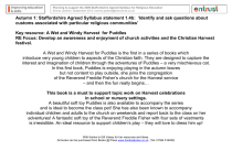 Planning to support the 2009 Staffordshire Agreed Syllabus for Religious Education Emma Jardine | September 2013 | emma.jardine@entrust-ed.co.uk Autumn 1: Staffordshire Agreed Syllabus statement 1.4b: ‘Identify and ask questions about customs associated with particular religious communities’ Key resource: A Wet and Windy Harvest for Puddles RE Focus: Develop an awareness and enjoyment of church activities and the Christian Harvest festival. A Wet and Windy Harvest for Puddles is the first in a series of books which introduce very young children to aspects of the Christian faith. They are designed to capture the interest and imagination of children through the adventures of Puddles – a very mischievous cat. In this first book, Puddles is enjoying playing in the autumn leaves but not content to play outside, she joins the congregation of the Reverend Freddie Fisher’s church for the Harvest service – and then the fun really begins… This book is a must to support topic work on Harvest celebrations in school or nursery settings. A beautiful soft toy Puddles is also available to accompany the series and is ideal to become the class pet! She has also been known to accompany individual children and adults to the church on weekends and report back to the class on her adventures! A fantastic soft toy of the Reverend Freddie Fisher with four sets of vestments is irresistible. An ideal resource to support children’s play – they will love to dress him up! With thanks to Gill Vaisey for her resources and ideas. All books can be purchased from Books @ Press www.booksatpress.co.uk. (Tel: 01594 516490) Activity Suggestions for Early Years Foundation Stage focussing on People and Communities and Religious Education Possible General Themes: Festivals; Food; Autumn; Colours RE Theme: Special Places and Festivals Key Resource: A Wet And Windy Harvest For Puddles RE Focus: Develop an awareness and enjoyment of church activities and the Christian Harvest festival. Activities relate to the book: A Wet And Windy Harvest For Puddles, by Gill Vaisey Suggested Activities Collect autumn leaves with the children. Look at the colours, shapes and textures. Provide opportunities for the children to be creative with paints and crayons to produce their own leaves. Make an autumn display. If possible, take the children outside on a windy day to have first hand experience of leaves blowing in the wind. Read the book A Wet And Windy Harvest For Puddles. Encourage the children to talk about the story and in particular the Reverend Freddie Fisher’s explanation of Harvest. Encourage the children to reflect on why it is important to share food with others less fortunate. Encourage the children to think about how Freddie responded to Puddles knocking down the fruit and vegetables and spilling the flowers (laughter rather than anger). RE and Early Learning Goals (2012) Mathematics: Children use everyday language to talk about size, weight, to compare quantities and objects. They recognise, create and describe patterns. They explore characteristics of everyday objects and shapes and use mathematical language to describe them. Understanding The World: The world know about similarities and differences in relation to places, objects, materials and living things. They talk about the features of their own immediate environment and how environments might vary from one another. They make observations of animals and plants and explain why some things occur, and talk about changes. Expressive arts and design: experiment with colour, design, texture, form and function. Expressive arts and design: experiment with colour, design, texture, form and function. Understanding The World: The world explain why some things occur, and talk about changes. Communication and Language: listen to stories, accurately anticipating key events and respond to what they hear with relevant comments, questions or actions. Personal, Social and Emotional: They show sensitivity to others’ needs and feelings Understanding the World: People and Communities They know about similarities and differences between themselves and others, and among families, communities and traditions. RE: Explore similarities and differences in people’s festivals. Explore how and why people in the local community help others. Find out about what happens in places of worship and why people go to these places. If possible visit a church and explore the special features noted in the book. Encourage them to appreciate that some objects in the church are special and should be treated with respect. Create a church role-play area which includes some of the features mentioned in the story e.g. a ‘lectern’ for the Bible, a pulpit, a harvest display. Include the soft toy Puddles and the Reverend Freddie Fisher so that the children can re-enact the story. Learn and sing Harvest songs. Make different types of bread that reflect different families and cultures. Share some food with each other. Encourage the children to say ‘please’ and ‘thank you’. Understanding the World: People and Communities They know about similarities and differences between themselves and others, and among families, communities and traditions. RE: Find out about what happens in places of worship and why people go to these places. Show curiosity and develop positive attitudes when learning about people from other religions and cultures. Explore and experiment with new learning opportunities. Expressive arts and design: They represent their own ideas, thoughts and feelings through design and technology, art, music, dance, role-play and stories. Expressive arts and design: Sing songs, make music and dance. Understanding the World: People and Communities They know about similarities and differences between themselves and others, and among families, communities and traditions. Personal, Social and Emotional: They show sensitivity to others’ needs and feelings, and form positive relationships with adult