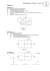 Applied Electronics – Outcome 1 - Transistor Theory Outcome 1: Homework – 1.1 For the conditions in figure 1.1.1 below calculate; (a) the combined resistance of R1 and R2. (b) the total resistance of the network R1, R2 and R3 (c) the current ‘I’ supplied by the battery. (d) the P.D. (potential difference) Vp across the parallel resistors R1 and R2 and the P.D. V3 across R3. (e) the current I1 flowing in R1 and I2 flowing in R2. 3 P Figure 1.1.1 Homework – 1.2 (a) state Kirchhoff’s 1st and 2nd laws. (b) For the circuit below calculate; (i) the total effective resistance between points A and B in the network. (ii) the P.D. across R2 and the P.D. across R3. (iii) the current flowing in each resistor I1, I2 and I3. A B Figure 1.2.1 Homework – 1.3 (a) Calculate the output voltage for each of the potential divider circuits shown below (i) (ii) (iii) 1 Your High School Badge Applied Electronics – Outcome 1 - Transistor Theory (b) Calculate the variable resistor setting in the potential divider shown. Homework – 1.4 A 2.5k linear potentiometer is used as a potential divider for a 9V supply figure 1.4.1. The ‘wiper’ on the ‘pot’ is set at B, a point four fifths of the way along the track from point C at the end of the potentiometer. Figure 1.4.1 (a) (b) (c) Figure 1.4.2 What is the resistance of length B, C of the track. What is the output voltage Vout at this setting. If a resistor is now connected as a ‘load’ across the output as shown in figure 1.4.2, what effect will this have on the output voltage when (i) the load resistance is 20k and, (ii) when the load resistance is 2k. (iii) Comment on your findings. Homework – 1.5 The figure 1.5.1 below shows a diagramatic sketch of a simple bi-polar (junction transistor) configuration. (a) Copy the diagram and complete the transistor symbol to represent an N.P.N device and identify. (i) the emitter (ii) the base (iii) the collector. Figure 1.5.1 2 Your High School Badge Applied Electronics – Outcome 1 - Transistor Theory (b) (c) (d) (e) (f) Label the diagram showing (i) Vb – base voltage relative to ground. (ii) Ve – emitter voltage relative to ground. (iii) Vce – voltage between collector and emitter junctions. (iv) Vbe – voltage between base and emitter junctions. (v) Vl – voltage across load resistor. On the diagram clearly show the conventional current flow for; (i) Ic – collector current. (ii) Ib – base current. (iii) Ie – emitter current. Indicate the output when connected in “common emitter mode”. Explain the term current gain as applied to the transistor. Clearly descibe the operation of the transistor explaining what is meant by ‘saturation’. Homework – 1.6 In the circuit shown below state whether the transistor will be switched on if, (a) R1 = 10k ; R2 = 1k ; Vcc = +4.5V (b) R1 = 10k ; R2 = 100k ; Vcc = +4.5V (c) R1 = 4k7 ; R2 = 10k ; Vcc = +15V (d) R1 = 2k2 ; R2 = 10k ; Vcc = +24V Figure 1.6.1 Homework – 1.7 In the circuit shown below the base emitter junction voltage V be is 0.7V. 3 Your High School Badge Applied Electronics – Outcome 1 - Transistor Theory Figure 1.7.1 (a) If Vcc = +4.5V, Ic = 25mA and R1 = 3k9, calculate (i) the base current Ib. (ii) the current gain AI. (b) If Ib = 20μA and Ic = 2mA and Vcc = 9V, calculate; (i) R1 (ii) R2 (iii) AI (c) If Vcc = 6V, R1 = 100k, R2 = 1k, calculate (i) the P.D. across R1 (ii) Ib (iii) Ic if hfe = 60 (iv) The P.D across R2 (d) If Vcc = 6V and Ib = 20μA, calculate the value of R1 Homework – 1.8 In the circuit shown below calculate the value of Rb if the base current is 10µA. Figure 1.8.1 Determine also the output voltage Vc. Homework – 1.9 Figure 1.9.1 In the circuit above determine the value of Ic, Ib and Vi which will result in saturation of the transistor. 4 Your High School Badge Applied Electronics – Outcome 1 - Transistor Theory Your High School Badge Homework – 1.10 In the circuit shown below calculate the output voltage and the voltage gain of the circuit for the conditions shown. State any assumptions you make. Figure 1.10.1 Homework – 1.11 For each of the six simple transistor circuits shown below, figure 1.11.1, calculate; (a) the emitter voltage; (Ve) (b) the emitter current (Ie); (d) the base current (Ib). (i) Figure 1.11.1 (iii) Figure 1.11.3 (V) Figure 1.11.5 (ii) Figure 1.11.2 (iV) Figure 1.11.4 (Vi) Figure 1.11.6 5 Applied Electronics – Outcome 1 - Transistor Theory Your High School Badge Homework – 1.12 In the circuit shown, figure 1.12.1, the transistor has a gain of 50 (hfe). Complete the table, fig.Q8b by calculating the values of; (i) base current, Ib; (ii) the collector current, Ic; (iii) V out, for each value of Vin given. hfe = 50 Figure 1.12.1 Input Circuit Homework – 1.13 The diagram below is part of a circuit which is suitable for processing the input from various types of sensors and providing an appropriate output. (a) (b) (c) (i) Name the switching circuit shown and describe its operation and advantage. (iii) State the overall gain hfe for the arrangement. State the purpose of the diode D1 in the circuit. For each of the applications given below, sketch the input part of the circuit diagram that would be suitable and the output device which would be appropriate. (i) Thermostat for the aquarium. (ii) A rain detector to automatically close skylights. (iii) A window “open” alarm. (iv) Automatic window shades for bright sunlight. 6 Applied Electronics – Outcome 1 - Transistor Theory Homework – 1.14 The figure 1.14.1 below shows a partly completed circuit diagram of an alarm circuit which is used to detect an increase in light level on a piece of laboratory equipment. (i) Complete the diagram by inserting the components between points X, Y and Y, Z which will allow it to perform this function. (ii) Describe how this circuit operates explaining the function of each component. Figure 1.14.1 Homework – 1.15 Figure 1.15.1 is an incomplete circuit diagram of a frost alarm. (i) Name 