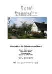 Information for Crematorium Users Gwent Crematorium Treherbert Road Croesyceiliog Cwmbran, NP44 2BZ Tel/Fax: 01633 482784 Web: www.gwentcrematorium.org.uk Introduction Welcome to Gwent crematorium, serving the communities of the South East of Wales and surrounding areas. At Gwent we aim to offer a service of the highest possible quality, whilst maintaining our prices at the lowest possible levels – over £100 lower than the national average. Recently we have been featured on BBC Television’s “How to Have a Good Death”, and have been received five major awards Wales in Bloom 2006 – Merit Award (public buildings) Wales in Bloom 2007 – First Prize (public buildings) Cemetery of the Year 2006 – National Runner-Up Cemetery of the Year 2007 – Honourable Mention & Special Award for best floral displays Wales in Bloom 2008 – Runner-up (public buildings) All members of staff are professionally qualified and will assist you in any way possible. Hopefully, this booklet should provide all the information you need. However, if you have any further queries, please feel free to contact either me or any of my staff. Paul Dundon, B.A.(Hons.), M.I.C.C.M. (Dip.) Manager & Registrar Cremations Cremation services are booked at 30 minute intervals. However, the time in the chapel is restricted to 20 minutes to allow for preparation for subsequent funerals. It is possible to book a second time slot, giving a total time in the chapel of 50 minutes. An extra fee is charged for this. Service times Monday - Friday 9.00-9.20, 9.30-9.50, 10.00-10.20, 10.30-10.50, 11.00-11.20, 11.30-11.50, 12.00-12.20, 12.30-12.50, 1.00-1.20, 1.30-1.50, 2.00-2.20, 2.30-2.50, 3.003.20, 3.30-3.50, 4.00-4.20 Cremation booking service It is possible to book a cremation service by telephone Monday- Friday 8.30am to 4.30pm Saturday, Sunday & Bank Holidays 1.30pm-4.30pm Provision of music An organ is available for use in the chapel. You can arrange to use any organist of your choice. Please note that we do not employ a resident organist. Our standard hymn list is included in this brochure. Additionally, we have a computerised system that can be used to deliver any commercially available piece of music, whether sacred or secular, given 24 hours notice. Your own compact discs can also be uploaded onto our system for use in the chapel. These discs must be provided a minimum of 24 hours prior to the scheduled service time. Please note that we will not accept “bootlegged” or home copied compact discs under any circumstances, due to copyright restrictions. Cassette tapes are not normally acceptable except in special circumstances (e.g. recordings made by members of the deceased’s family where no other format is available.) If musicians are to play at a funeral service, this is only permitted strictly within the time slot booked. On no account are musicians to play in the covered flower display area, because the sound travels back into the chapel and disturbs other funerals. Monetary collections When monetary collections are to be taken in aid of charities etc., you will need to supply a suitable receptacle. However, staff at the crematorium are expressly forbidden from handling any monies received. Bearing The funeral director is responsible for arranging bearers to convey the coffin onto the catafalque. The crematorium staff are not permitted to act as bearers. A wheeled bier is provided to minimise the amount of manual handling involved for the bearing party. Please note that the entrance doors to the chapel are not designed to accommodate coffins borne on shoulders. We strongly advise you to use the bier provided for the convenience and safety of the bearers. Coffin Size The maximum coffin size that can be accommodated is as follows: Length: 83 inches (2110mm) Width: 31 inches (790mm) Depth: 20 inches (510mm) Cremated remains For collection Remains for collection will be available on the normal working day following the cremation. We will only allow collection by the funeral director, the applicant for cremation (with identification) or family members by prior arrangement and with letter of authorisation from the applicant for cremation. Please note that, with a view to reducing consumption of fossil fuels and to reduce greenhouse emissions, we commonly delay the cremation of coffins received in the late afternoon on any given day until the morning of the following day. This is in line with government guidelines, and the Code of Cremation Practise issued by the Federation of British Cremation Authorities. Any coffins kept on the premises overnight will be kept in a purpose designed refrigerated and secure room. Our preferred option is to place cremated remains in a purpose made biodegradable cardboard container, which is included in the cost of cremation. However, it is possible to have them placed in a plastic urn suitable for longer term storage or transport by courier at no extra cost. We can provide oak caskets designed to take our standard containers without further disturbance of the cremated remains for a small fee. In cases where funeral directors wish to supply their own caskets or urns, we will normally place the cremated remains in them at no additional expense. However, we do reserve the right to refuse to use containers from external suppliers where they are considered unsuitable by size, design or construction. For interment in the Garden of Remembrance The crematorium has a lawned Garden of Remembrance split up into 60 numbered sections marked by a selection of trees and shrubs. Remains are scattered loosely beneath the turf on a weekly basis. No individual plots are available, nor is it possible to reserve a space in any given section. Because remains are scattered loosely in the grounds, it is not possible to disinter them later for any purpose. Witnessed interments are not available. Remains are normally interred in the second week following the funeral service; the delay being introduced in order to a