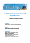ChinaNANO 2015 www.chinanano.org The 6th International Conference on Nanoscience & Technology, China 2015 The Second Announcement Organizer National Center for Nanoscience and Technology, China Sponsor National Steering Committee for Nanotechnology Supported by Ministry of Science and Technology of China Ministry of Education of China National Natural Science Foundation of China Chinese Academy of Sciences China Association for Science and Technology -1- ChinaNANO 2015 www.chinanano.org WELCOME ADDRESS FROM THE CHAIRMAN Dear friends and colleagues, On behalf of the organizing committee, I would like to invite you to participate in the 6th International Conference on Nanoscience and Technology, China 2015 (ChinaNANO 2015) which will be held between September 3-5, 2015 in Beijing, China. This is the sixth conference following the successful ChinaNANO 2005, ChinaNANO 2007, ChinaNANO 2009, ChinaNANO 2011 and ChinaNANO 2013 events held in Beijing. ChinaNANO 2015 is intended to stimulate discussions on the forefront of research in nanoscience and nanotechnology. The conference will focus on carbon nanomaterials, inorganic nanomaterials and MOFs, self-assembly and supramolecules, nanocomposites and applications, energy and environmental nanotechnology, nanophotonics and optoelectronics, nanodevices and nanosystems, nanobiotechnology and nanomedicine, nanocharacterization and metrology, modeling and simulation of nanostructures, as well as environment, safety and health of nanomaterials. We sincerely hope that the scope of the conference will serve the interest of the scientific community, as well as the industry and the general public. I wish to extend a warm welcome to all participants and sponsors of the event. Looking forward to meeting you in Beijing in 2015. Chunli Bai Chairman, Organizing Committee of ChinaNANO 2015 President, Chinese Academy of Sciences President, Council of National Center for Nanoscience and Technology, China INTERNATIONAL ADVISORY COMMITTEE Sishen Xie Institute of Physics, Chinese Academy of Sciences, China Flemming Besenbacher Aarhus University, Denmark Hongjie Dai Stanford University, USA Harald Fuchs Münster University, Germany Chihming Ho University of California, Los Angeles, USA Charles M. Lieber Harvard University, USA Haiwon Lee Hanyang University, Korea Yiu-Wing Mai University of Sydney, Australia -2- ChinaNANO 2015 www.chinanano.org Lars Samuelson Lund University, Sweden Paul S. Weiss University of California, Los Angeles, USA Paul Alivisatos Lawrence Berkeley National Laboratory, USA Younan Xia Georgia Institute of Technology, USA Peidong Yang University of California, Berkeley, USA Xing Zhu Peking University, China CONFERENCE COMMITTEE Chairman: Chunli Bai Chinese Academy of Sciences (CAS), China Co-Chairs: Minghua Liu National Center for Nanoscience and Technology, China Chen Wang National Center for Nanoscience and Technology, China Zhonglin Wang Georgia Institute of Technology, USA Secretary-General: Zhiyong Tang National Center for Nanoscience and Technology, China Deputy Secretary-General: Xingyu Jiang National Center for Nanoscience and Technology, China Xiaohui Qiu National Center for Nanoscience and Technology, China Zhixiang Wei National Center for Nanoscience and Technology, China Zhong Zhang National Center for Nanoscience and Technology, China DATES AND VENUE Date September 3-5, 2015 Important Dates Deadline for abstract submission April 30, 2015 Deadline for early bird registration June 30, 2015 Deadline for paper submission July 31, 2015 On-site registration September 2-5, 2015 Venue Beijing International Convention Center (BICC) Beijing International Convention Center is a 5 star tourist service unit with 48 different conference rooms. The exhibition hall is 5,000 square meters large. It’s the ideal place to conduct international and domestic -3- ChinaNANO 2015 www.chinanano.org conferences, display cultural exchange and hold business meetings. The center is located in Asian Games Village, a flourishing area of Beijing which has a collection of hotels, businesses, shopping centers and entertainment venues, it is easily accessible by public transportation. PROGRAM OVERVIEW Preliminary Program Sept. 2 Sept. 3 Sept. 4 Sept. 5 Wednesday Thursday Friday Saturday Registration Opening Morning Ceremony Keynote Speech & Oral Presentation Plenary Talks Lunch Keynote Speech & Afternoon Registration Oral Presentation Plenary Talks Closing Ceremony Evening Reception Poster Poster Session Session Topical Sessions and Chairpersons 1. Carbon nanomaterials Chairpersons: Jin Zhang, Linjie Zhi 2. Inorganic nanomaterials and MOFs Chairpersons: Xun Wang, Tierui Zhang 3. Self-Assembly and supramolecules Chairpersons: Dongsheng Liu, Baoquan Ding 4. Nanocomposites and applications Chairpersons: Zhong Zhang, Fei Wei 5. Energy and environmental nanotechnology Chairpersons: Dan Wang, Weiguo Song, Baohang Han 6. Nanophotonics and optoelectronics Chairpersons: Yongsheng Zhao, Zheyu Fang, Tao He 7. Nanodevices and nanosystems Chairpersons: Wenping Hu, Jun He -4- ChinaNANO 2015 www.chinanano.org 8. Nanobiotechnology and nanomedicine Chairpersons: Xing-Jie Liang, YanglongHou 9. Nanocharacterization and metrology Chairpersons: Dong Wang, Guanglu Ge 10. Modeling and simulation of nanostructures Chairpersons: Wei Ji, Shixuan Du 11. Environment, safety and health of nanomaterials Chairpersons: Xueyun Gao, Chunying Chen Confirmed Speakers (In alphabetic order) Plenary Speakers: Jillian Buriak University of Alberta, Canada Lei Jiang Institute of Chemistry, CAS, China Klause Kern Max-Planck-Institute for Solid State Research, Germany Kam W. Leong Columbia University, USA Charles M. Lieber Harvard University, USA Rodney S. Ruoff Ulsan National Institute of Science and Technology, Korea Keynote & Invited Speakers: Javier Garcia de Abajo The Institute of Photonic Sciences, Spain Nicholas Abbott University of Wisconsin Madison, USA Gang Bao Georgia Institute of Technology, USA Fle