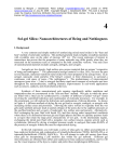 Created by Margret J. Geselbracht, Reed College (mgeselbr@reed.edu) and posted on VIPEr (www.ionicviper.org) on July 29, 2009. Copyright Margret J. Geselbracht 2009. This work is licensed under the Creative Commons Attribution Non-commercial Share Alike License. To view a copy of this license visit http://creativecommons.org/about/license/. 4 Sol-gel Silica: Nanoarchitectures of Being and Nothingness I. Background A very common and simple method of synthesizing mixed metal oxides is the “heat and beat” method of solid state synthesis. This method generally leads to highly crystalline materials with crystallite sizes on the order of microns (10-6 m). The recent explosion of interest in nanoscience has proven that the properties of many materials may differ greatly when they are structured on the nanometer scale as compared to the bulk crystalline versions. One such class of nanostructured materials includes aerogels, ambigels, and xerogels. Aerogels are low density, high surface area, porous materials that are unique “composites of being and nothingness.”i The quintessential aerogel material is silica, SiO2, but over the past several decades, numerous transition metal oxides have been prepared in the aerogel form. In an aerogel, nanoscale oxide particles (“the being”) connect in three dimensions to surround a continuous void space of pores, (“the nothingness”). The predominance of interconnected mesopores (pore sizes > 2 nm) in aerogels facilitates rapid mass transport of molecules and ions throughout the nanoarchitecture, enabling dramatic improvements in real-world applications such as sensors, catalysts, and electrochemical devices. Synthesis of these nanostructured gels requires significantly milder conditions and temperatures than we encountered in the “heat and beat” method. Wet gels in which the pores are filled with a fluid can be synthesized by a number of different so-called “sol-gel” routes involving the controlled hydrolysis and condensation of molecular precursors. For example, in this experiment, we will explore the hydrolysis and condensation of silicon alkoxides. As shown in Figure 4.1, different methods of drying the wet gel lead to xerogels, ambigels, or aerogels with increasing surface areas and porosities. Allowing the native solvent to evaporate from the wet gels under ambient pressure leads to partial collapse of the pores due to the capillary pressures at the gas/fluid interface and xerogels of moderately low surface area and porosity. Alternatively, first exchanging the pore fluid with liquid CO2 and then drying under supercritical conditions where there is no distinction between gas and liquid phases and thus no capillary pressure leads to aerogels that retain the large pores characteristic of wet gels. In the intermediate regime, exchanging the initial pore fluid with a nonpolar, low surface tension, organic solvent such as cyclohexane, followed by drying at ambient pressure results in ambigels that retain 80-90% of the porosity of aerogels without the need for supercritical drying. In this lab experiment, you will make a series of silica gels via either acid-catlalyzed or base-catalyzed hydrolysis and condensation of tetraethylorthosilicate (TEOS), Si(OCH2CH3)4 or tetramethylorthosilicate (TMOS), Si(OCH3)4. We will attempt to make pH sensors from these silica gels by incorporating a pH sensitive dye within the gel network. Different gel microstructures are obtained from either acid-catalyzed or base-catalyzed conditions, and we will use the visual response of the dyes to explore and probe these morphological differences. Created by Margret J. Geselbracht, Reed College (mgeselbr@reed.edu) and posted on VIPEr (www.ionicviper.org) on August 6, 2009. Copyright Margret J. Geselbracht 2009. This work is licensed under the Creative Commons Attribution Non-commercial Share Alike License. To view a copy of this license visit http://creativecommons.org/about/license/. Xerogel Ambigel Aerogel Wet gel Figure 4.1. Hydrolysis and condensation of molecular precursors results in a wet gel (shown on left) composed of a three-dimensional network of nanometer-scale oxide particles surrounding an interconnected network of pores that are filled with fluid, typically the solvent. Allowing the pore fluid to evaporate under ambient pressure leads to pore collapse and a highly densified xerogel (top, right). Exchange of the pore fluid with a low polarity solvent followed by evaporation leads to minimal pore collapse and an ambigel (middle, right) that retains 80-90% of the porosity of the wet gel. Exchange of the pore fluid with liquid CO 2 followed by supercritical drying leads to an ultra high porosity, low density material known as an aerogel (bottom, right). II. Sol-gel synthesis of silica Silicon alkoxides are quite prone to hydrolysis reactions and subsequent formation of silica, SiO2. For example, equation 4.1 shows the hydrolysis of tetraethylorthosilicate (TEOS), Si(OCH2CH3)4 to initially form a silanol (molecule containing Si–OH). Si(OCH2CH3)4 + H2O –––––> Si(OCH2CH3)3OH + CH3CH2OH (4.1) Hydrolysis of the silanol can continue further, or more likely, condensation reactions of two silanols (or a silanol plus an alkoxide) will occur resulting in a bridging oxygen that links two silicon atoms together. Equation 4.2 shows an example of a condensation reaction between two silanol molecules. Si(OCH2CH3)3OH + Si(OCH2CH3)3OH –––> (CH3 CH2O)3Si–O–Si(OCH2CH3)3 + H2O (4.2) Further hydrolysis and condensation reactions continue to add silicon atoms and grow the polymer chain. In solution, these reactions begin simultaneously at many different locations leading to the formation of numerous growing silicon oxide/alkoxide particles. The so-called sol stage consists of a dispersion of these colloidal particles in the solvent, where the particles range from 1-100 nm in size. Over time, the particles continue to grow until they finally link in three