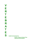 V E R T E B R A T E S GLAD Unit developed by Norma Lovelace & Sylvia Price Earlimart School District PROJECT G.L.A.D. Earlimart School District VERTEBRATES IDEA PAGES I. UNIT THEME - Include cross cultural sensitivity theme - - II. Classification of Vertebrates All living things affect the environment, changing habitats that animals live in. Survival – When habitats are destroyed, animals adapt, die (become extinct), or move away. Through the study of vertebrates students will learn that appearances can be deceiving. They will learn we should not judge others on their appearance. FOCUS/MOTIVATION - Super Scientist Awards – Cognitive dictionary Inquiry Chart Poetry/Raps/Songs Realia Read Aloud Play The Important Book About Vertebrates Observation Charts III. CLOSURE - IV. Student generated text Focused Reading Portfolios Inquiry Charts Artwork Projects/presentations on different animal classification Team exploration – Big Book CONCEPTS - - - - All animals are classified into two groups: Vertebrates and Invertebrates. Vertebrates have a backbone, invertebrates do not. Vertebrates are classified into five different groups: birds, mammals, amphibians, reptiles and fish. Each classification has characteristics of its own that help us identify animals. Animal characteristics relate to growth, survival and reproduction Living things cause changes in the environments in which they live. Some of these changes are detrimental to the organism and some are beneficial. All animals share the need to be respected for what they are. Appearances can be deceiving. Example: A monkey looks like fun but makes a terrible pet! - - Myths, fears, and misunderstandings are dissolved when knowledge is discovered and respected. Respect for a culture or a creature is developed through the knowledge and understanding of the differences and similarities of the culture or creature. Life Sciences Standards a. Students know plants and animals have structures that serve different functions in growth, survival, and reproduction. b. Students know examples of diverse life forms in different environments, such as oceans, deserts, tundra, forests, grasslands, and wetlands. c. Students know living things cause changes in the environment in which they live: some of these changes are detrimental to the organism or other organisms, and some are beneficial. d. Students know when the environment changes, some plants and animals survive and reproduce; others die or move to new locations. e. Students know that some kinds of organisms that once lived on Earth have completely disappeared and that some of those resembled others that are alive today.ELA STANDARDS - GRADE 3 Reading 1.0 Word Analysis, Fluency, and Systematic Vocabulary Development 1.2 Decode regular multisyllabic words. 1.3 Read aloud narrative and expository text fluently and accurately and with appropriate pacing, intonation, and expression. 1.6 Use sentences and words context to find the meaning of unknown words. 1.7 Use a dictionary to learn the meaning and other features of unknown words. 2.0 Reading Comprehension 2.1 2.2 2.3 2.4 2.5 2.6 Use titles tables of contents, chapter headings, glossaries, and indexes to locate information in text. Ask questions and support answers by connecting prior knowledge with literal information found in, and inferred from, the text. Demonstrate comprehension by identifying answers in the text. Recall major points in the text and make and modify predictions about forthcoming information. Distinguish the main idea and supporting details expository text. Extract appropriate and significant information from the text, including problems and solutions. 3.0 Literary Response and Analysis 1.1 3.5 Distinguish common forms of literature. Recognize the similarities of sounds in words Rhythmic patterns in a selection. Writing 1.0 Writing Strategies 1.1 1.2 1.3 1.4 2.0 Create a single paragraph: a. Develop a topic sentence. b. Include simple supporting facts and details. Write legibly in cursive or joined italic, allowing margins and correct spacing between letters in a word and words in a sentence. Understand the structure and organization of various reference materials. Revise drafts to improve the coherence and logical progression of ideas by using an established rubric. Writing Applications 2.1 Write narratives: a. b. c. 2.2 Provide a context within which an action takes place. Include well-chosen details to develop the plot. Provide insight into why the selected incident is memorable. Write descriptions that use concrete sensory details to present and support unified impressions of people, places, things, or experiences. Written and Oral English Language Conventions 1.0 Written and oral English language Conventions 1.1 1.2 1.3 1.4 1.5 1.6 1.7 Understand and be able to use complete and correct declarative, interrogative, imperative and exclamatory sentences in writing and speaking. Identify subjects and verbs that are in agreement and identify and use pronouns, adjectives, compound words, and articles correctly in writing and speaking. Identify and use past, present, and future verb tenses properly in writing and speaking. Identify and use subjects and verbs correctly in speaking and writing simple sentences. Punctuate dates, city and state, and titles of books correctly. Use commas in dates, locations, and addresses and for items in a series. Capitalize geographical names, holidays, historical periods, and for items in a series. Listening and speaking 1.0 Listening and Speaking Strategies 1.1 1.2 1.3 1.7 1.8 1.9 2.0 Retell, paraphrase, and explain what has been said by a speaker. Connect and relate prior experiences, insights, and ideas to those of a speaker. Respond to questions with appropriate elaboration. Use clear and specific vocabulary to Communicate and establish the tone. Clarify and enhance oral presentations through the use of appropriate props. Read prose and poetry aloud with fluency, rhythm, and pace, using appropriate into