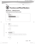 Date: P H A TE R C Name: 6 Fractions and Mixed Numbers Worksheet 1 Adding Fractions Find the equivalent fraction. Shade the models. Example 2 _ 3 ? 6 2 — — 3 © 2009 Marshall Cavendish International (Singapore) Private Limited. Copying is permitted; see page ii. 9 1. 1 _ 2 ? 1 — — 2 2. 3 — 5 ? 3 — — 5 Reteach 4A MS_Reteach 4A_Ch06_139-194.indd 139 139 3/9/09 6:03:48 PM Name: Date: Find the equivalent fractions. Example 5 1 5 5 25 To get the equivalent fraction, multiply both the numerator and the denominator by the same number. 5 5 4. 7 9 9 12 3 5. 6. 16 24 4 140 2 3 12 18 © 2009 Marshall Cavendish International (Singapore) Private Limited. Copying is permitted; see page ii. 3 3. Chapter 6 Lesson 6.1 MS_Reteach 4A_Ch06_139-194.indd 140 11/5/09 9:19:24 AM Name: Date: Find the equivalent fractions. Complete the model by shading the correct number of parts. Then add the fractions. Example 1 2 _ _ 9 3 ? Step 1 1 Change the denominator of _ to 9. 3 3 1 _ — 3 9 3 1 3 3 9 3 Add the like fractions. Step 2 5 9 © 2009 Marshall Cavendish International (Singapore) Private Limited. Copying is permitted; see page ii. 1 2 _ _ 9 3 3 9 7. 3 2 _ — 9 9 5 _ 9 2 9 3 1 _ _ 4 8 1 4 1 _ 4 2 3 3 1 _ _ _ 4 8 8 Reteach 4A MS_Reteach 4A_Ch06_139-194.indd 141 141 3/10/09 1:47:19 PM Name: 8. Date: 1 1 _ _ 12 3 1 3 1 _ 3 1 1 _ _ 12 3 Example 3 3 1 2 _ _ _ ? 9 9 3 1 _ 3 1 3 3 — 9 3 9 3 9 3 2 9 8 9 142 3 9 3 1 2 — — — 9 9 3 3 — 9 3 2 — — 9 9 8 — 9 3 8 1 2 _ _ — So, _ . 9 9 9 3 © 2009 Marshall Cavendish International (Singapore) Private Limited. Copying is permitted; see page ii. Complete the models. Then add the fractions. Chapter 6 Lesson 6.1 MS_Reteach 4A_Ch06_139-194.indd 142 11/5/09 12:19:45 PM Name: 9. Date: 3 1 1 _ _ _ 2 8 8 4 1 2 1 _ 2 4 1 8 3 8 3 1 1 1 — — — — 2 8 8 8 3 — 8 © 2009 Marshall Cavendish International (Singapore) Private Limited. Copying is permitted; see page ii. 10. 5 1 1 _ _ _ 4 12 12 1 _ 4 5 1 1 — — — 4 12 12 Reteach 4A MS_Reteach 4A_Ch06_139-194.indd 143 143 3/9/09 6:03:50 PM Name: Date: Express each fraction in simplest form. Example 8 3 4 24 32 To simplify a fraction, divide both the numerator and the denominator by the same number. 8 3 24 _ — 32 11. 12 _ _ 34 12. 18 _ _ 42 13. 21 _ _ 63 144 A fraction is in its simplest form when the numerator and the denominator cannot both be divided by the same number. © 2009 Marshall Cavendish International (Singapore) Private Limited. Copying is permitted; see page ii. 4 Chapter 6 Lesson 6.1 MS_Reteach 4A_Ch06_139-194.indd 144 11/5/09 9:19:49 AM Name: Date: Add. Express each answer in simplest form. Example 2 1 _ _ ? 5 5 To add like fractions, add the numerators. 2 5 1 5 3 2 1 So, _ _ —. 5 5 5 © 2009 Marshall Cavendish International (Singapore) Private Limited. Copying is permitted; see page ii. ? 14. 2 7 3 2 _ _ _ 7 7 3 7 ? 15. 2 4 _ _ _ 9 9 2 9 4 9 ? _ 16. 5 7 _ _ _ 12 12 Reteach 4A MS_Reteach 4A_Ch06_139-194.indd 145 145 3/9/09 6:03:52 PM Name: 17. Date: 3 2 1 _ _ _ 5 10 10 3 _ 10 1 _ 10 2 5 1 4 5 1 1 _ _ _ 4 6 12 146 5 _ 12 1 6 © 2009 Marshall Cavendish International (Singapore) Private Limited. Copying is permitted; see page ii. 18. Chapter 6 Lesson 6.1 MS_Reteach 4A_Ch06_139-194.indd 146 11/5/09 9:20:25 AM Name: Date: Worksheet 2 Subtracting Fractions Find the equivalent fraction. Complete the model by shading the correct number of parts. Example 2 3 6 2 _ — ⫽ 3 9 6 9 3 4 © 2009 Marshall Cavendish International (Singapore) Private Limited. Copying is permitted; see page ii. 1. 3 _ — ⫽ 4 2 5 2. 2 — ⫽_ 5 Reteach 4A MS_Reteach 4A_Ch06_139-194.indd 147 147 11/10/09 9:04:59 AM Name: Date: Subtract. Express each answer in simplest form. Example 3 5 _ _ 6 6 1 — 3 2 — 6 3 6 ? 5 6 3 8 3. 3 5 _ _ 8 8 ? 5 8 7 10 4. 9 7 _ _ 10 10 ? 9 10 5. 148 4 7 _ _ 12 12 © 2009 Marshall Cavendish International (Singapore) Private Limited. Copying is permitted; see page ii. To subtract like fractions, subtract the numerators. Chapter 6 Lesson 6.2 MS_Reteach 4A_Ch06_139-194.indd 148 11/5/09 2:51:06 PM Name: Date: Complete the models by shading the correct number of parts. Then subtract the fractions. Example 3 7 _ _ 4 8 Step 1 ? 2 3 Change the denominator of _ to 8, 4 3 4 7 . so that it has the same denominator as _ 8 Step 2 2 Subtract the like fractions. 6 3 1 7 7 — — — — — 4 8 8 8 8 © 2009 Marshall Cavendish International (Singapore) Private Limited. Copying is permitted; see page ii. 1 8 6 8 3 7 1 _ — . So, _ 4 8 8 6. 6 8 7 8 3 11 _ _ 4 12 3 _ 4 3 11 11 _ _ _ 4 12 12 11 12 Reteach 4A MS_Reteach 4A_Ch06_139-194.indd 149 149 3/9/09 6:03:54 PM Name: 7. Date: 5 1_ 9 1 5 1_ 9 5 _ 9 Find the equivalent fractions. Then subtract. Example ? 7 2 7 _ _ _ 9 9 3 3 6 9 2 3 3 1 — 9 7 2 1 _ _ So, _ . 9 9 3 10 8. 7 1_ 10 7 _ 10 1 1 10 150 6 9 © 2009 Marshall Cavendish International (Singapore) Private Limited. Copying is permitted; see page ii. 7 2 _ _ 9 3 Chapter 6 Lesson 6.2 MS_Reteach 4A_Ch06_139-194.indd 150 11/5/09 9:21:43 AM Name: 9. Date: 1 7 7 _ _ _ 4 12 12 1 4 1 6 © 2009 Marshall Cavendish International (Singapore) Private Limited. Copying is permitted; see page ii. 10. 1 11 11 _ _ _ 6 12 12 Reteach 4A MS_Reteach 4A_Ch06_139-194.indd 151 151 3/9/09 6:03:55 PM Name: Date: Complete the models. Then subtract. Example 2 1 _ 1_ ? 9 3 3 1 3 2 1 — 1— 9 3 2 9 3 9 4 9 3 9 3 2 3 — 9 — 4 — — 9 9 9 9 9 9 2 1 4 So, 1 _ _ — . 9 9 3 4 1 1_ _ 4 12 1 4 4 1 — 1— 4 12 12. 4 — 12 3 2 _ 1_ 5 10 3 5 3 2 — 1— 5 10 152 © 2009 Marshall Cavendish International (Singapore) Private Limited. Copying is permitted; see page ii. 11. Chapter 6 Lesson 6.2 MS_Reteach 4A_Ch06_139-194.indd 152 11/5/09 9:22:01 AM Name: Date: Find each difference. Express your answer in simplest form. Example 2 1 _ 1_ ? 9 3 2 1 1_ _ 9 3 9 — 9 2 — 9 3 3 — 9 1 3 3 9 3 4 — 9 © 2009 Marshall Cavendish International (Singapore) Private Limited. Copying is permitted; see page ii. 2 1 4 _ _ . So, 1 _ 9 9 3 13. 2 