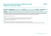 Year 3 and 4 unit overview for multiple year levels Australian Curriculum: History DRAFT Source: Australian Curriculum, Assessment and Reporting Authority (ACARA), Australian Curriculum v3.0: Science for Foundation–10, <www.australiancurriculum.edu.au/Science/Curriculum/F-10>. School name Conceptual thread Unit title Year levels Duration of unit Our school Examining the experiences of people in the past Exploring experiences of the local community Years 3 and 4 20 hours Unit outline Students identify the significance of people with diverse backgrounds and the roles they play in local communities. They examine the importance of Country and Place to Aboriginal peoples and Torres Strait Islander peoples who belong to a particular area. They investigate change and continuity over time in local, regional and state contexts, for example in relation to transport, work, education, entertainment, daily life, and natural and built environments. The key inquiry questions for the unit are: Year 3 • How has our community changed? What features have been lost and what features have been retained? • • What is the nature of the contribution made by different groups and individuals in the community? Who lived here first and how do we know? Year 4 • What was life like for Aboriginal and/or Torres Strait Islander Peoples before the arrival of the Europeans? • What was the nature and consequence of contact between Aboriginal and/or Torres Strait Islander Peoples and early traders, explorers and settlers? Queensland Studies Authority October 2012 | 1 Identify curriculum Content descriptions to be taught 2 | Historical Knowledge and Understanding Historical Skills Year 3 The importance of Country and Place to Aboriginal and/or Torres Strait Islander peoples who belong to a local area. (This is intended to be a local area study with a focus on one Language group; however, if information or sources are not readily available, another representative area may be studied) (ACHHK060) ONE important example of change and ONE important example of continuity over time in the local community, region or state/territory; for example, in relation to the areas of transport, work, education, natural and built environments, entertainment, daily life (ACHHK061) The role that people of diverse backgrounds have played in the development and character of the local community (ACHHK062) Year 3 and 4 Year 4 The diversity and longevity of Australia’s first peoples and the ways Aboriginal and/or Torres Strait Islander peoples are connected to Country and Place (land, sea, waterways and skies) and the implications for their daily lives (ACHHK077) The nature of contact between Aboriginal people and/or Torres Strait Islanders and others, for example, the Macassans and the Europeans, and the effects of these interactions on, for example families and the environment (ACHHK080) Explanation and communication Develop texts, particularly narratives (ACHHS070) (ACHHS086) Use a range of communication forms (oral, graphic, written) and digital technologies (ACHHS071) (ACHHS087) Chronology, terms and concepts Sequence historical people and events (ACHHS065) (ACHHS081) Use historical terms (ACHHS066) (ACHHS082) General capabilities and cross-curriculum priorities Literacy Use appropriate historical language specific to the unit Numeracy Understand and interpret associated maps, tables and graphs that add meaning to written text Historical questions and research Pose a range of questions about the past (ACHHS067) (ACHHS083) Identify sources (ACHHS215) (ACHHS216) Analysis and use of sources Locate relevant information from sources provided (ACHHS068) (ACHHS084) ICT capability Use a range of digital technologies to assist with investigating concepts Critical and creative thinking Use thinking skills to complete group activities and undertake inquiry Personal and social capability Work together to participate in learning experiences and historical inquiry Perspectives and interpretations Identify different points of view (ACHHS069) (ACHHS085) Year 3 and Year 4 unit overview for multiple year levels Australian Curriculum: History Ethical behaviour Explore the interactions between Europeans and Aboriginal and Torres Strait Islander peoples and the positive or negative effects Intercultural understanding Identify cultural groups within the local community and their influence over time Identify curriculum Aboriginal and Torres Strait Islander histories and cultures Explore the importance of Country and Place to Aboriginal and/or Torres Strait Islander peoples Asia and Australia’s engagement with Asia Identify and explore key individuals or groups who established contact with Asia during the age of discovery Sustainability Explore the impact that British colonisation had on the lives of Aboriginal people (e.g. loss of food sources and medicines) Historical Understandings This unit provides opportunities for students to develop historical understandings particularly focused on the key concepts of: ☒ Sources Written or non-written materials that can be used to investigate the past. A source becomes “evidence” if it is of value to a particular inquiry. ☒ Cause and effect ☒ Continuity and ☒ Perspectives ☒ Empathy ☒ Significance The relationship between a factor or set of factors (cause/s) and consequence/s (effect/s). These form sequences of events and developments over time. change Continuities are aspects of the past that have remained the same over certain periods of time. Changes are events or developments from the past that represent modifications, alterations and transformations. A point of view or position from which events are seen and understood, and influenced by age, gender, culture, social position and beliefs and values. An understanding of the past from the point of view of the participant/s, including an appreciation of the circumstances faced, and the motivations, values and attitudes behind actions. The importance