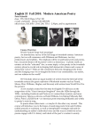 English 53 Fall 2010: Modern American Poetry Peter Schmidt class: TTh 2:40-3:55pm, LPAC 301 e-mail: pschmid1 phone: 610-328-8156 office hours, Fall 2010: LPAC 206, TTh 1 - 2:30pm, and by appointment Course Overview Words! Action! Song! And meanings! An introductory survey of the full range of twentieth-century American poetry, but we will commence with Whitman and Dickinson, two key predecessors and enablers. The emphasis will be on particular poets and poems, but a recurrent theme will be poetry’s role in a democracy: is poetry really an esoteric art for the “educated” few, as some imply, or has poetry in the twentieth century played a crucial role in shaping both democratic citizens and a sense of democratic culture? What are the connections between changing poetic forms and the changing ways we re-imagine the form of our communities, our nation, and our relation to the world? We’ll include about an equal number of writers from the first half of the twentieth century (the great explosion of Modernist masters such as Pound, Moore, Eliot, Williams, Hughes, and Stevens) with writers from World War II to the present. A new module created for first time for English 53 will focus on the songwriters of the “Great American Songbook” from the 1920s through the 1950s—including Gershwin and Porter et al, various blues lyricists, and more contemporary figures as diverse as Hank Williams, Lin-Manuel Miranda, Bob Dylan, Prince, and Jill Scott—as American poets returning brilliantly and wittily to poetry’s roots in song. In poems ideas make music—or maybe it’s the other way around. This course will introduce you to the basics of analyzing poetic form and rhythms (called prosody or scansion), as well as interpretative strategies relevant for understanding an author’s individual voice and the ways in which his or her poems engage with U.S. history and ideals of the poet’s vocation in society. 1 This is a Core Course in the English Department’s curriculum, which means it is an appropriate introductory course for any student who has had a W (Writing) course from any department on campus. The course will also be very appropriate for English majors and possible majors. The primary textbook for English 53 is Cary Nelson’s Anthology of Modern American Poetry, from Oxford. In addition to the anthology, we will use its excellent accompanying website material at http://www.english.uiuc.edu/maps. Other required readings will include in-class handouts and the use of materials (including mp3s) posted on the English 53 site on Blackboard; and blog posts and comments on the English 53 Blog at http://swat-english53.blogspot.com]. English 53 Requirements • Regular attendance: This class meets just twice a week. More than 2 unexcused absences over the course of the semester will hurt your grade. • Come to class prepared, having studied the materials assigned for that day, with questions and ideas and passages from the poetry you’d like to discuss. This often means doing assignments on the anthology’s website or other online sources, not just readings in the book itself. The course will feature some lecturing but many classes will include discussion in either large or small groups. It is thus crucial to come to class having done the reading and prepared to participate in discussion. • Each student will lead part of a class discussion once during the semester, usually with a few others from the class. More details on these assignments will be given in class. Students will sign up to join a particular discussion group, then will meet ahead of time with me to discuss their approach to that class’s materials and to prepare discussion questions for the class. Discussion leaders must post their discussion questions and topics by 8pm the night before class on the English 53 Blackboard Discussion Board site. There will be grade deductions for late postings. • All students will also be required occasionally to post blog responses to a poem—or to comment on another’s blog post—on the English 53 blog, available at http://swat-english53.blogspot.com [.] Posts must be made by 8pm on the evening before class, so that students can check these out as part of their preparation for class. Students will be assigned to small groups for posting, so that you’ll have to post approximately every other week. Each student will get feedback from the professor on some (not all) of your posts. We’ll use blog posts sometimes in class. Posts and comments may also cover the secondary materials assigned. As well as being a good way to prepare for class, posts and responses can be excellent seeds for a paper, as can be your in-class presentation and the discussion that follows. • Two short papers that will be WA’d will be assigned. All students must participate in assigned WA (Writing Associate) conferences for their two papers. Students will submit drafts of both their first and second papers to the WA’s (Writing Associates) assigned to this course; they must then attend a meeting with the WA’s to discuss suggested revisions, incorporating those as they see fit into the final versions of their papers. Both WA’d drafts and final papers must be turned in together, the first batch on Oct. 5 and the second on Nov. 22: see syllabus below for more details. Any failure to follow these procedures regarding required WA work—and/or missed or late WA deadlines and conferences—will result in a grade penalty. 2 • Each student must complete the final exam, which will be scheduled by the Registrar. It will be an open-book and –notes in-class 3-hour exam. Grading: 25%: leading part of one class discussion, plus English 53 blog participation and general in-class discussion contributions all semester; First paper, 25%; second paper, 25%; Final Exam 25%. Poor attendance, poor class participation, and/or late assignments will negatively affect your grade. 3 A note about honesty and coursework in Engli