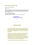 STAR WARS: EMPIRE‘S END AUDIO ADAPTATION TRANSCRIPT By Brandon Frost Based on an audio adaptation of “Star Wars: Empire’s End,” a two-issue comic book miniseries published by Dark Horse Comics in 1995. Audio Adaptation produced by Highbridge Audio, Inc. From Dark Empire: The Collection, a five-CD set containing audio dramas of Dark Empire, Dark Empire II, and Empire’s End. Comic version written by Tom Veitch Audio version adapted by John Whitman Opening and “Epilogue” scrawl adapted from the comic by Christopher McElroy A long time ago, in a galaxy far, far away...... EMPIRE’S END Six years after the battle of Endor, a reborn Emperor Palpatine resurrected the Empire and brought the Rebel Alliance to its knees. But with the birth of Anakin Solo, the third child of Han Solo and Princess Leia, Luke Skywalker feels a surge of new hope for the Jedi Knights. Using his new terror weapon, the Galaxy Gun, the Emperor has once again reasserted his technological dominance over the rest of the galaxy. No planet, no space fleet, is safe from the destructive power of the Galaxy Gun’s hyperdrive propelled supermissiles. In a demonstration of its power, the Pinnacle moon and the Rebel base on it was destroyed. The Alliance was forced into hiding, and numerous systems sympathetic to the Rebels have surrendered rather than face total annihilation. Secreted on the space city of Nespis VIII, Mon Mothma and her generals vow to fight on. Troopships and heavy armor are directed against Imperial supply ports and shipyards....and, without success, against the Galaxy Gun itself. Meanwhile, Luke Skywalker and his small band of new Jedi have the critical task of protecting Leia’s children, who are the future of the Jedi. More urgently, Luke and the Jedi hope to draw the Emperor out of hiding on his capital on Byss, and into a face-to-face confrontation of light vs. darkness that will end his dark reign, and restore peace to the galaxy for all time to come.... DISC ONE/TRACK ONE NARRATOR: Part 3: Empire’s End. SCENE 1-1 THE REBEL GROUP SHIP PELAGIA, IN DEEP SPACE Music: Dagobah Swamp Music from TESB. Sound: An X-Wing flying by. GREEN LEADER: (over intercom) Group Ship Pelagia, request docking instructions. REBEL COMM OFFICER #1: (intercom) All X-Wing squadrons, report to hanger bay four. REBEL COMM OFFICER #2: (intercom) Ground assault commanders to the briefing room, repeat: ground assault commanders to the briefing room. Sound: A comm signal being turned on. GREEN LEADER: (intercom) Group ship Pelagia, this is Green Leader. Green Squadron is ready to come aboard. Sound: Comm signal being turned off. SCENE 1-2 BRIDGE OF THE GROUP SHIP PELAGIA CAPTAIN TEKBA: Lieutenant, bring us alongside those X-Wing fighters and prepare to take them aboard. LIEUTENANT: Affirmative, sir. Docking procedures initiated, Green Leader. You may begin the sequence... Sound: A computer beeping. LIEUTENANT: Captain Tekba, we’re receiving a priority signal from Alliance Command! Sound: Captain Tekba turns on the comm signal. TEKBA: This is Captain Tekba, go ahead Alliance Command. MON MOTHMA: (over intercom) Captain, this is Mon Mothma, long-range scans have picked up a hyperspace missile headed your way. You’ve got to move! LIEUTENANT: But Admiral, we haven’t finished docking procedures. These X-Wings are needed for the mission against the Imperial Shipyards. MON MOTHMA: (urgently) You must understand, Captain. This is the same kind of missile that destroyed Pinnacle Base. It has hyperdrive capabilities and full shields. You have about ten minutes to jump to hyperspace. TEKBA: But Mon Mothma, it takes half an hour to get this old hulk up to lightspeed. MON MOTHMA: Then hit the missile with everything you’ve got. And may the Force be with you. Sound: A proximity alarm sounds. LIEUTENANT: Sir, there’s an object coming out of hyperspace. TEKBA: Green Leader, this is the Pelagia. We could use some help. GREEN LEADER: (over intercom) We’re on it, Pelagia. Sound: The X-Wings fly out to intercept the missile. LIEUTENANT: (spotting the missile) There it is! TEKBA: Battle stations! (battle alarm being sounded) Tactical, bring all weapons to bear on that missile. Sound: Heavy blasters being fired at missile. GREEN LEADER: (over intercom) Pelagia, this is Green Leader. We have acquired the target. Say goodbye... Sound: The X-wings fire at missile. GREEN LEADER: What? Impossible! Our fire doesn’t penetrate those shields! Let’s hope your shields are as good, Captain Tekba. TEKBA: TAKE EVASIVE ACTION! TAKE EVAS... Sound: A monstrous, rumbling explosion as the giant ship is blown to bits. SCENE 1-3 INT. BYSS PALACE -- THRONE ROOM EMPEROR: (watching the destruction of the Pelagia on a viewscreen) Heh heh ha ha ha ha!!!! Excellent! Another Rebel troopship has returned to the void. The Rebel Alliance will know their day is over! Do you not agree, Xecr Nist? XECR NIST: My Emperor, your Galaxy Gun is the ultimate terror weapon. It has given you absolute control. It has only been fired four times, and yet planets all over the galaxy are capitulating to your rule. EMPEROR: (contempt) Capitulating! Of course! But why should I accept their surrender? Perhaps I should destroy them all, and leave...koff, koff, as I destroyed the...koff… (violent coughing) NIST: The Emperor is ill! Physician! PHYSICIAN: (running up) Here, my Lord. Emperor Palpatine, I must advise you to control your emotions! Your clone body is aging far too fast. We need to take cell scrapings to test your lifespan. EMPEROR: (breathing heavily and with much effort) Curse that Skywalker...koff, koff.... he destroyed all my best clones. I was forced to take one that was genetically unstable. NIST: Emperor! Our spies within the Rebel Alliance have just reported the location of the Rebel Command Base—the derelict Nespis VIII space city near the Cron Drift. PHYSICIAN: The Emperor must not be disturbed! EMPEROR: SILENCE, YOU FOOL! koff, koff...Xecr Nist, arm my ga