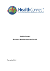 HealthConnect Business Architecture version 1.9 November 2004 Foreword We have already seen one revolution in health, as computers have become used in all areas of healthcare. We are now on the verge of a second revolution, as improved communication technology makes it possible to share data between computer systems. Information vital to a patient’s care can now be made available when and where it is needed. HealthConnect is a cooperative venture between the Australian, state and territory governments. The core of HealthConnect is a national system of sharable electronic health records, established to collect, store and exchange consumer health information. Information will be transferred using a secure network with strict privacy safeguards. Summaries of health events such as community consultations, hospital interventions, prescribing history and recent test results can be made available when and where they are needed – to the advantage of both consumers and health professionals. For the past three years HealthConnect has conducted research, trials and extensive community consultations. The business architecture is based on that work; it defines a workable and achievable solution for stage 1 of HealthConnect and provides a framework for future development, implementation and operational activities. HealthConnect is moving closer to becoming a national reality with whole of state implementations underway in Tasmania and South Australia. Significant development projects are underway in several states. The business architecture and other technical documents to be released shortly are providing the basis for this work to proceed. Another important development is the establishment of the National e-Health Transition Authority (NEHTA) to drive the national IM&ICT strategic priorities such as clinical data standards, identification standards and provider directories. These will provide important national components to HealthConnect. This draft business architecture is being made available to provide the basis for comment. Feedback from consumers and the broader health community will guide the preparation of version 2.0 of the business architecture and also guide its ongoing development. There are important new elements of this version of the business architecture that are designed to support the everyday operation of HealthConnect such as the introduction of the eHealth Message Bank service for communication of referrals, prescriptions and diagnostic tests between providers. Nowhere else in the world has an extensive, truly national electronic health record system been established. We are embarking on a long journey that we know will be complex and challenging. HealthConnect will evolve substantially during this journey, but we are confident the destination will provide significant benefits in improved health care and health status for all Australians. On behalf of the HealthConnect Board, I look forward to receiving your comments. Dr Robert Wooding Chair, HealthConnect Board 22 October 2004 i Contacts and Further Information If you require further information, or wish to comment on this document or any other aspect of HealthConnect, please contact the HealthConnect Program Office at: The HealthConnect Program Office Australian Government Department of Health and Ageing MDP 25 GPO Box 9848 CANBERRA ACT 2601 Fax: (02) 6289 8295 Email: healthconnect@health.gov.au Alternatively, please contact your nearest interstate HealthConnect office, as follows: Joanna Kelly New South Wales Ph: (02) 9391 9090 Fax: (02) 9391 9015 Ernest Higgs Victoria Ph: (03) 9616 2083 Fax: (03) 9616 8559 Karen Gibson Queensland Ph: (07) 3131 1679 Fax: (07) 3131 1687 Alan Nankivell South Australia Ph: (08) 8237 8276 Fax: (08) 8237 8070 Des Hutchinson Western Australia Ph: (08) 9222 4379 Fax: (08) 9222 2449 Garry Hulme Tasmania Ph: (03) 6233 2483 Fax: (03) 6233 2899 Gloria Baillee Northern Territory Ph: (08) 8999 2629 Fax: (08) 8999 2419 Wendy Mossman Australian Capital Territory Ph: (02) 6244 3870 Fax: (02) 6285 2099 ii Business Architecture V1.9 - Table of Contents Business Architecture V1.9 - Table of Contents ............................................................. iii HealthConnect Business Architecture version 1.9 - An Overview .................................. 1 Part A – Introduction to the HealthConnect Business Architecture version 1.9 .............. 9 1. Introduction ............................................................................................................ 11 1.1 The HealthConnect Project............................................................................. 11 1.2 Phase 1 & 2 Achievements ............................................................................. 12 1.3 HealthConnect Business Architecture ............................................................ 14 1.4 Finding Your Way around the Business Architecture .................................... 15 Part B – HealthConnect Business Context ..................................................................... 19 2. The HealthConnect Business Drivers ..................................................................... 21 2.1 The Business Need ......................................................................................... 21 2.2 HealthConnect Objectives .............................................................................. 22 2.3 The HealthConnect Concept........................................................................... 23 2.4 The Business Case .......................................................................................... 26 3. HealthConnect Principles ....................................................................................... 29 3.1 Scope of HealthConnect ................................................................................. 29 3.2 Participation in HealthConnect ....................................................................... 30 3.3 Information Man