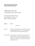 The University of Hull 2010/2011 Public Lecture Series ‘ Philip Larkin, Life or Art’ The University of Hull’s Larkin 25 Lecture Date: Monday 22 November 2010, 6pm Venue: Middleton Hall, Campus, Hull Speaker: Professor James Booth Duration: 0:54:24 START AUDIO Announcer: Welcome to the fourth lecture in the University of Hull’s Larkin 25 series of podcasts; ‘Philip Larkin, Life or Art’, given by Professor James Booth from the University’s Department of English. Prof James Booth: ‘Philip Larkin, Life or Art’; Aristotle, as we all know, wrote that art imitates life and this is a pretty solid commonsensical way of looking at it. The poet lives and the incidence of his or her life give the occasions for the poems; a visit to a cathedral, falling in love, the death of a loved one. However there is also the hardcore decadent version. This comes in two variants. In the first, and the more familiar of these, the poet lives deliberately or subconsciously in accordance with an artistic myth. In extreme cases the myth dictates the literal events of the life. Byron invents himself as a cursed glamorous hero in his writings and to prove the point throws his life away fighting for a romantic cause in Greece. Sylvia Plath, with a deliberation that shocked Larkin, dictated the myth of her victimhood at the hands of Ted Hughes; “There is a panther stalks me down, one day I’ll have my death of him.” She then lived out this myth by committing suicide when Hughes deserted her. Byron and Plath, if you like, paid with their lives for their self-image as artists. WB Yeats did not go to that extreme but he did see the artist as fundamentally abnormal, antisocial, as we’ve just heard. And David anticipated, uncannily I think, several of the elements of my talk here. But as we’ve just heard “The intellect of man is forced to choose perfection of the life or of the work. And if it take the second, must refuse a heavenly mansion raging in the dark.” The artist, like a Christian saint, a kind of anti-saint perhaps, renounces the rules and decorums of ordinary life in order to achieve the perfection of art. In Yeats’s dramatic phrase “The poet rages in the dark” while others fulfil their social commitments and take the road to their heavenly mansions. Following his own principles Yeats made his life into the glamorous myth of a sage in a tower, buying himself ‘Thoor Ballylee’ and then writing his poems in the symbolic isolation of this tower. 2 This is no simple matter of metaphorical art versus literal life. ‘Thoor Ballylee’ is both literal and a symbol. The process of living involves a continual metaphorical transfer between literal and figurative, concrete and abstract. We’re all literally here in the Middleton Hall but what makes sense to each individual one of us of being here will be something profoundly subjective and imaginative in each one of our heads. In TS Elliots’ words you can hardly say where the metaphorical and literal meet. Christopher Ricks adds: “The concept of the literal is itself stubbornly resistant to clarification.” Although we use the word all the time and we think we know what it means, don’t we? Larkin’s poetry is distinctive for teasing intense figurative meaning from literal description. Instead of metaphor “My love is like a red red rose”, “The evening spread out against the sky like a patient etherised upon a table”, he prefers metonym, a description of reality which suggests some larger, more abstract concept. That vase representing the sadness of home, a glimpse from a train of someone running up to bowl invoking transience. Since there is nothing which is purely literal, the more innocently real an image the greater perhaps is its metaphorical potential. Someone running up to bowl, though an empirical visual observation, is a more highly charged metaphor than the familiar comparison of one’s love to a rose. In his last great poem ‘Aubade’, Larkin experiences his final epiphany as the light of dawn gradually fills his room. This revelation takes the form of a wardrobe; “It stands plain as a wardrobe what we know.” A wardrobe is, of course, a man sized wooden box. Get it? 3 Is this an image from life or from art? It is, of course, just a wardrobe and he sees it. You could make a very lame image out of it but obviously it resonates. Is it excruciatingly literal or is it equally excruciatingly a really subtle metaphor? Larkin too had his towers like Yeats, vantage points from which he viewed life at a safe or perhaps an unsafe distance. Frequently they take the form of a bohemian attic or garret. In January 1946 at the age of 23 he moved into new lodgings in Wellington, Shropshire and found that his window faced east towards the rising son. As the days lengthened he was woken earlier and earlier in the morning. The impact of this experience went deep. In many of his poems a light-filled room figures as the sight of a revelation, either an epiphany of transcendent or, as in ‘Dry Point’ or Livings II’, the lighthouse keeper poem or of less deceived reality and disappointment of tragedy as in ‘Deceptions’ or, as we’ve just seen, in ‘Aubade’. Another tower was provided by the new rooms in Belfast into which Larkin moved five years later in 1951. “Romantic attics and delightful they are”, he wrote to his friend Winifred Arnott. Here he would be able to write his poems and play his records of jazz and of Monteverdi. He was into Monteverdi even at that stage interestingly. And here also he wrote his poem ‘Best Society’ alluding to Eve’s words as she leaves Adam in Milton’s ‘Paradise Lost’, ‘For solitude is sometimes best society.’ Our virtues, he complains, are all social and consequently he makes his choice for antisocial vice. “Viciously then I lock my door, the gas fire breathes, the wind outside ushers in evening rain. Once 4 more uncontradicting solitude supports me on its gia