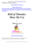 Roll of Thunder, Hear My Cry by Mildred D. Taylor - MonkeyNotes by PinkMonkey.com The full study guide is available for download at: http://monkeynote.stores.yahoo.net/ PinkMonkey Literature Notes on . . . http://monkeynote.stores.yahoo.net/ Sample MonkeyNotes Note: this sample contains only excerpts and does not represent the full contents of the booknote. This will give you an idea of the format and content. Roll of Thunder, Hear My Cry by Mildred D. Taylor 1976 MonkeyNotes Study Guide by Dr. Karen Ruff http://monkeynote.stores.yahoo.net/ Reprinted with permission from TheBestNotes.com Copyright 2003, All Rights Reserved Distribution without the written consent of TheBestNotes.com is strictly prohibited. 1 TheBestNotes.com Copyright 2003, All Rights Reserved. No further distribution without written consent. Roll of Thunder, Hear My Cry by Mildred D. Taylor - MonkeyNotes by PinkMonkey.com The full study guide is available for download at: http://monkeynote.stores.yahoo.net/ KEY LITERARY ELEMENTS SETTING The story is set in Mississippi during the depression. It is an area where former plantation owners and their descendants have been forced to resort to sharecropping their land in order to continue some semblance of their preCivil War way of life. The Black families who had been freed by the war have had no where to go and no means of survival off the plantations. Thus they became the tenant farmers or sharecroppers, planting acres of cotton or other crops. The landowner took a percentage of the crop as his share, and the tenant farmer tried …… CHARACTER LIST Major Characters Cassie Logan - protagonist. Nine year old daughter of David and Mary Logan. First person narrator. Faces problems of racism. She is the second oldest child in her family. T.J. Avery - son of a black sharecropper family who is farming on the Granger land. Obnoxious know-it-all who commits serious errors in judgment in choosing his friends. Cheats on tests, makes fun of his friends, tries to get the Logan children to disobey their parents. Stacey Logan - Cassie’s older brother. Reasonably mature 13 year old. Cassie looks up to him for explanations on things she doesn’t know yet. The oldest child in the Logan family. Mr. Morrison - a guest who moves into a little shack on the Logan land. David brings him under the pretense of giving Mr. Morrison a job, but he really is there to protect the family when David is away ….. Minor Characters Mama - Mary Logan, school teacher and mother to the Logan children. Soft spoken but not afraid to …… Big Ma - Grandmother of the Logan children on the father’s side. She actually owns the land but has it ….. Many additional characters are outlined in the complete study guide. CONFLICT Protagonist - Cassie Logan, a 9 year old girl in the Logan family wants to be able to go to school, choose her own friends, have nice books to read, and in general enjoy the rights and privileges–and receive the respect–that ought to belong to any human being. However, Cassie and her brothers live in the deep south during the depression in an area that suffers from racist attitudes in spite of the abolition of slavery nearly 75 years earlier. Although there….. Antagonists - The antagonists are the white landowners, shopkeepers and their children with whom Cassie and her siblings must interact. If the Blacks do not behave as required, they can ….. Climax - The climax occurs when T.J. Avery gets involved in robbery and assault along with two white boys whom he regards as friends. When the boys go too far and T.J. tries to get out of it, they beat him up. The boys, who wear masks to conceal their identity, put the blame for the robbery all onto T.J. A group of….. Outcome - The landowners and Logan family work together to put out the fire. The Logans are able to come up with the tax money and continue holding on to their land, but T.J. Avery is most likely going to….. SHORT PLOT / CHAPTER SUMMARY (Synopsis) The story begins with the Logan children on their way to school. They walk to an all-black school and have to play a 2 TheBestNotes.com Copyright 2003, All Rights Reserved. No further distribution without written consent. Roll of Thunder, Hear My Cry by Mildred D. Taylor - MonkeyNotes by PinkMonkey.com cruel game every day as the driver of the bus of white children enjoys racing the bus past the Logans just to see them get covered with dust or mud, depending on the weather. The children try to time their walk so they can get up on a bank before the bus goes by, but usually they fail and are trapped between steep banks and the ditch. This year is Little Man’s first year of school. He is a very intelligent little six year old with a fetish for cleanliness and is frustrated from day one when the bus races by and sprays dust all over his best clothes. He will start out in the same room as his 4th grade sister Cassie as the first grade teacher has not returned yet. The children start the year by getting new books for the first time–only the books aren’t new, but are beat up cast-offs that have been labeled as suitable for the “nigra” children. Little Man first complains that the book is dirty, then sees the cover label and throws the book on the floor and stomps on it rebels. He refuses to pick it up at the teacher’s order. Cassie sticks up for him and both children get a whipping. Their mother, also a teacher, sticks up for them and pastes brown paper over the school district label of the books for her own students as well as those of her children. The Logan children are more fortunate than the rest of the children as their parents own the land which they farm rather than having to sharecrop the land as most of the area farmers do. As the school year progresses, other little complications occur among the children. Stacey finds a way to get even with the bus, and T.J. Avery, an obnoxious 14 year old, entices the Logan children into disobedient things that get them in trou
