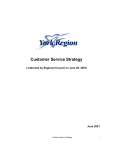 Customer Service Strategy ( endorsed by Regional Council on June 28, 2001) June 2001 Customer Service Strategy i REGION OF YORK TABLE OF CONTENTS CHAPTER 1. 2. 3. 4. PAGE Introduction 1 1.1 Background 1 1.2 Objectives 1 1.3 Process 2 Customer Service in York Region Today 4 2.1 Building on a Strong Foundation 4 2.2 Key Opportunities for Improvement 9 Strategic Directions for the Future 17 3.1 Customer Service Mission and Values 17 3.2 Customer Service Strategic Directions 19 • Leadership 19 • Customer Voice 22 • Staff Development 24 • Access & Information Systems 27 • Service Standards & Consistency 31 Moving Towards Implementation 35 4.1 Summary of Recommendations 35 4.2 Next Steps 38 APPENDICES A. Customer Service Strategy Employee Survey B. Employee Survey Results C. Selected Findings from Customer Service Research - page ii - 1. INTRODUCTION 1.1 Background 1.2 Objectives 1.3 Process Customer Service Strategy i 1. INTRODUCTION 1.1 Background We are here to serve our customers. Customer service is at the root of everything York Region does in providing a variety of services to meet the needs of its communities and customers. This strategy has been developed as part of the Regional Municipality of York’s commitment to implementation of its Multi-Year Corporate Plan. (The Multi-Year Corporate Plan was approved by Regional Council on March 11, 1999.) One of the eight strategic directions in the Multi-Year Corporate Plan is “Developing an effective communications and customer service strategy”. In 2000, Regional Council received the Communications Strategy. This initiative addresses the Customer Service Strategy. In Fall 2000 the Region retained The Randolph Group to develop a Customer Service Strategy in cooperation with the Senior Management Group and the Customer Service Strategy Team. This document represents the first component of this Strategy – the overall strategic directions for the future. A “toolkit” which will assist staff in the Region with developing and delivering effective customer service will be completed by September 2001. 1.2 Objectives The overall objectives of the Customer Service Strategy Project include: • Understanding customer service in York Region today • Developing future directions for customer service • Building the capacity to implement a customer service strategy Customer Service Strategy 1 REGION OF YORK 1.3 Process The work on the Customer Service Strategy Project has involved the following major activities: • Meetings with departmental management teams in all 7 departments to introduce the project and to conduct an overall strategic assessment of customer service (November - December 2000) • Departmental inventory of customer service practices – data collection and analysis (November - December 2000) • Interviews with the Regional Chair and Chief Administrative Officer (January – February 2001) • Consultation session with Council (February 2001) • Customer Service Strategy Employee Survey (February – March 2001). The survey of Regional employees conducted in February-March 2001 was designed to: - Understand the level of commitment to customer service - Identify barriers to strengthening customer service - Identify the level of support for change, and highlight areas where special implementation support will be required - Provide a baseline for ongoing evaluation of customer service - Provide a benchmark self-evaluation by Regional employees which can be compared in the future with customer evaluation A total of 687 employees responded – representing a very good response rate of 44%. This response rate provides a high rate of statistical validity – overall findings are accurate plus or minus 3.8% 19 times out of 20. • Four focus groups with front-line employees (April 2001). The focus groups were designed to: - Develop a more detailed understanding of the customer service realities experienced by “front-line” or “first contact” staff (e.g. challenges, barriers to effective customer service) Customer Service Strategy Introduction 2 REGION OF YORK - Help to develop strategies for how best to equip employees to deal with these realities (e.g. priority needs and tools that would help employees strengthen customer service) - Probe results from the recently administered Customer Service Strategy Employee Survey and develop a better understanding of the underlying reasons for the data results A total of 37 staff participated in these focus groups. • Collection and analysis of information from the private and public sectors on best practices in customer service including a review of the latest customer service research and service standards being used by public sector service providers • Discussions with the MYCP Customer Service Strategy Team in November 2000, January 2001 and April 2001 Customer Service Strategy Introduction 3 2. CUSTOMER SERVICE IN YORK REGION TODAY 2.1 Building on a Strong Foundation 2.2 Key Opportunities for Improvement Customer Service Strategy 1 2. CUSTOMER SERVICE IN YORK REGION TODAY 2.1 Building on a Strong Foundation York Region’s Customer Service Strategy has a strong foundation upon which to build. The foundation is based on corporate commitment from Council and Senior Management and staff commitment to excellence in customer service. There is broad-based recognition of the need to continuously improve the Region’s customer service, an understanding of the range of customers, and numerous examples of customer service commitment and innovation. Each of these elements of the foundation is described below: • Corporate commitment: The concept of quality service is built right into York Region’s Mission Statement: York Region Mission Statement York Region staff are committed to providing cost effective, quality services that respond to the needs of our rapidly growing communities. The commitment to quality customer service has been a strong feature of many of the Region