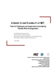A GUIDE TO JOB FLEXIBILITY AT MIT: Tools for Employees and Supervisors Considering Flexible Work Arrangements A Collaborative Project of the MIT Council on Family and Work MIT Human Resources Department Job Flexibility Team MIT Center for Work, Family & Personal Life June 2004 Contact: Center for Work, Family & Personal Life Room 16-151 Massachusetts Institute of Technology 77 Massachusetts Avenue Cambridge, MA 02139 Telephone: 617-253-1592 Fax: 617-253-2609 Email: worklife@mit.edu Web Site: http://web.mit.edu/hr/worklife ACKNOWLEDGEMENTS This guide to flexible work arrangements emerged from the work of the Task Force on Workplace Flexibility, established in September 2000 under the auspices of the MIT Council on Family and Work. The Task Force, led by its chair, Elizabeth Reed, created a first draft of guidelines as part of its final report to the Council. The guidelines were based on the task force’s training and consultation materials developed by Kathy Simons in the Center for Work, Family & Personal Life, as well as extensive study of the issue of job flexibility, including interviews and focus groups on campus and a review of national trends. Listed below are the names of the Task Force members. At the recommendation of the Council, a Job Flexibility Team was then established within MIT’s Human Resources Department to revise, publish, and disseminate these guidelines. Members of this team are also listed below. Both groups acknowledge gratefully the many individuals and organizations within MIT that contributed information and reviewed drafts of the guidelines. In particular, we thank Marsha Orent of the Provost’s Office for writing the first complete draft of this guide. Other key contributors are noted below, with appreciation to all who made this important project possible. MIT Council on Family and Work, Task Force on Workplace Flexibility Human Resources Department, Job Flexibility Team Richard Perling Elizabeth Reed, Chair Kathy Simons Thomas Zgambo Francine Crystal Barbara Peacock-Coady Richard Perling Lianne Shields Erika Simmons Kathy Simons Rae Simpson, Chair Barbara Jablon and Wendy Williams, Advisory Members Additional Contributors and Reviewers David Achenbach Sharon Bridburg James Chansky Kelvin Chin Ron Fleming Margaret Ann Gray Marianne Howard Doreen Morris Marsha Orent Barbara Roberts Toni Robinson Mary Rowe Melissa Speros Ellen Williams Administrator’s Advisory Group Lincoln Laboratory Human Resources Office Personnel Administrators Group Working Group on Support Staff Issues MIT Center for Work, Family & Personal Life 1 CONTENTS Acknowledgements…………………………………………………………………………………………1 INTRODUCTION...................................................................................................................................... 3 Why Flexibility? ........................................................................................................................................... 3 Eligibility at MIT .......................................................................................................................................... 5 Flexibility Options ....................................................................................................................................... 6 GUIDELINES FOR FLEXIBLE WORK ARRANGEMENTS ............................................................. 7 Principles of Effective Flexible Work Practice............................................................................................. 7 How Employees Can Develop a Proposal: Elements to Include .................................................................. 8 Table 1: Questions to Consider..................................................................................................................... 9 REQUEST AND REVIEW PROCESS FOR EMPLOYEES AND SUPERVISORS/MANAGERS .10 Steps for the Employee to Follow............................................................................................................... 10 Steps for the Supervisor/Manager to Follow .............................................................................................. 10 Modification or Termination of a Flexible Work Arrangement ................................................................ 11 CONCLUSION ......................................................................................................................................... 12 APPENDIX A: MIT Policy Regarding Hours of Work and Flexible Work Schedules for Support, Administrative, and Sponsored Research Staff .......................................................................................... 13 APPENDIX B.1–6: Examples of Different Flexible Work Arrangements................................................ 14 B.1 Flex Schedule (“Flex-Time”) ......................................................................................................... 14 B.2 Compressed Work Week............................................................................................................... 15 B.3 Part-Time Hours............................................................................................................................. 16 B.4 Job Share ...................................................................................................................................... 17 B.5 Personal and Family Leaves........................................................................................................... 18 B.6 Telecommuting (“Flex-Place”) ...................................................................................................... 19 APPENDIX C.1–2: Sample Proposal Forms............................................................................................. 20 C.1 Flexible Work Arrangement Proposal Form .................................................................................. 20 C.2 S
