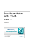 Bank Reconciliation WalkThrough Write-Up CS™ version 2008.x.x TL 18915 (04/25/08) Copyright Information © Text copyright 1998 - 2008 by Thomson Tax & Accounting. All rights reserved. © Video display images copyright 1998 - 2008 by Thomson Tax & Accounting. All rights reserved. Thomson Tax & Accounting hereby grants licensees of CS Professional Suite™ software the right to reprint this document solely for their internal use. Trademark Information The trademarks used herein are trademarks and registered trademarks used under license. All other brand and product names mentioned in this guide are trademarks or registered trademarks of their respective holders. . Contents WalkThrough Exercises ................................................................... 1 Introduction ........................................................................................................................ 1 Opening the Bank Reconciliation sample client ............................................................ 1 Making a copy of the sample client ............................................................................... 4 Setting up information required for bank reconciliation ..................................................... 5 Checkbook information.................................................................................................. 5 Data entry considerations ............................................................................................... 7 Deposits ..................................................................................................................... 7 Checks ....................................................................................................................... 8 Transactions between checkbooks ............................................................................ 9 Bank statement and account information ..................................................................... 10 Summary Information ............................................................................................. 10 Deposits and Credit Memos .................................................................................... 10 Checks and Debit Memos ....................................................................................... 10 Initiating the bank reconciliation ...................................................................................... 11 Recurring adjustments.................................................................................................. 13 Non-recurring adjustments ........................................................................................... 14 Initial open items.......................................................................................................... 15 Bank statement summary information ......................................................................... 16 Clearing entries ................................................................................................................. 18 Deposits and other credits ............................................................................................ 19 Checks and other debits ............................................................................................... 21 Adjustment distributions .............................................................................................. 26 Printing reports ................................................................................................................. 28 Posting to the general ledger............................................................................................. 33 Using other tabs in the Bank Reconciliation window ....................................................... 34 Direct Deposit tab ........................................................................................................ 34 Other Bank Items tab ................................................................................................... 34 Checkbook Adjustment tab .......................................................................................... 34 Using other bank reconciliation features .......................................................................... 34 Assigning orphan checks ............................................................................................. 34 Combining checks with the same check number ......................................................... 35 Using the check number (rather than bank reconciliation reference) for adjustments to checks........................................................................................................................... 35 Bank Reconciliation WalkThrough iii Contents Displaying multiple distributions to the checkbook GL account in a single transaction separately ..................................................................................................................... 35 Using the quarterly statement summary ....................................................................... 36 Viewing prior bank reconciliation worksheets............................................................. 36 Deleting transactions .................................................................................................... 36 Rebuilding uncleared transactions ............................................................................... 36 Completing the bank reconciliation and advancing to the next statement ........................ 37 Bank Statement Import .................................................................. 39 Import exercise ................................................................................................................. 39 Opening the bank reconciliation sample client ............................................................ 39 Making a copy of the sample client ...................................................................