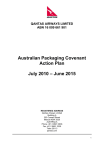 QANTAS AIRWAYS LIMITED ABN 16 009 661 901 Australian Packaging Covenant Action Plan July 2010 – June 2015 REGISTERED ADDRESS Qantas Airways Limited Building A 203 Coward Street Mascot NSW 2020 AUSTRALIA Phone +61 2 9691 3636 Fax +61 2 9691 3339 Telex 20113 qantas.com 1 Contents 1 Executive summary ......................................................................................................................... 3 2 Period of the Action Plan ................................................................................................................. 4 3 Australian Packaging Covenant contact ......................................................................................... 4 4 Company profile .............................................................................................................................. 4 5 6 7 8 9 4.1 Company history ..................................................................................................................... 4 4.2 Business and investments ...................................................................................................... 4 Place in the supply chain, and packaging materials used .............................................................. 5 5.1 Qantas licensed products ........................................................................................................ 5 5.2 Snap Fresh ready-to-eat meals............................................................................................... 5 Qantas Group Sustainability Strategy ............................................................................................. 6 6.1 The Qantas Management System .......................................................................................... 6 6.2 Sustainability reporting ............................................................................................................ 6 6.3 The Qantas begreen program ................................................................................................. 7 Implementation of the Sustainable Packaging Guidelines .............................................................. 8 7.1 Licensed products ................................................................................................................... 8 7.2 Ready-to-eat meals ................................................................................................................. 8 Existing initiatives ............................................................................................................................ 9 8.1 Airport terminal initiatives ........................................................................................................ 9 8.2 Operations, engineering and office initiatives ......................................................................... 9 8.3 In-flight initiatives ................................................................................................................... 10 8.4 Environmental management systems ................................................................................... 10 Action Plan 2010-2015 .................................................................................................................. 11 Appendix A: Snap Fresh SPG Checklist ............................................................................................... 14 2 1 Executive summary The Qantas Group (Qantas) is a signatory to the Australian Packaging Covenant („Covenant‟) and is committed to its objectives. Qantas was previously a signatory to the National Packaging Covenant (NPC) from 2007 and continues its association with the Australian Packaging Covenant which came into effect in July 2010. As of 1st July, 2010 signatories to the Covenant are required to submit an Action Plan for a five year period. This Action Plan has been prepared in accordance with the Covenant‟s guidelines. Under the Covenant, Qantas is a „brand owner‟ of packaged goods. For the purposes of this Action Plan, these goods comprise two main types: Qantas, Jetstar and Frequent Flyer licensed products that are sold online, onboard and in Australian airports. Packaged ready-to-eat meals, prepared by the Snap Fresh business. Qantas is committed to actively managing its operations and growth in an environmentally sustainable manner and to reducing its environmental footprint. Waste minimisation and resource efficiency are important elements of the Qantas‟ overall environmental strategy. Although packaging is just a small part of Qantas‟ total environmental impact, the philosophy underpinning the Covenant is in line with this strategy. The Qantas Head of Environment is responsible for delivering environmental performance improvement and resources have been committed to waste minimisation, including packaging waste. This Action Plan is just one part of Qantas‟ overall waste reduction strategy. It presents a summary of achievements to date and outlines planned initiatives to achieve an overall waste reduction over the next five years. To integrate commitments to the Covenant in day-to-day practices, the initiatives will be aligned with the environmental module of the Group-wide Qantas Management System (QMS). Qantas will actively seek to educate and influence the supply chain to minimise the environmental impacts of packaging, and to implement “buy recycled” procurement policies where practicable. Qantas is committed to specific actions to minimise the impact of its branded product packaging. In accordance with the Qantas Sustainability Strategy, the company is committed to demonstrating its performance over the life of the Action Plan. Signed: Name: Position: Date: 3 2 Period of the Action Plan In accordance with the Covenant‟s requirements, Qantas submits this five year Action Plan which covers the period from July 2010 to June 2015. As a specific initiative within the Action Plan, a review of the Action Plan will