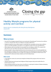 Closing the gap clearinghouse Healthy lifestyle programs for physical activity and nutrition Resource sheet no. 9 produced by the Closing the Gap Clearinghouse January 2012 Summary What we know • Over half (51%) of Indigenous people living in non-remote parts of Australia aged 15 and over do very little or no exercise, compared with 33% of non-Indigenous Australians (AIHW 2011a). • Indigenous people are twice as likely to report no usual daily fruit consumption and seven times as likely to report no usual daily vegetable consumption as non-Indigenous people of the same age (AIHW 2011a). • While Indigenous adults are less likely to be overweight than non-Indigenous adults (31% compared with 36%), they are much more likely to be obese (34% compared with 18%) (AIHW 2011a). • Being overweight or obese, being physically inactive and consuming a diet low in fruit and vegetables have been estimated to contribute 16%, 12% and 5% respectively to the health gap observed between Indigenous and non-Indigenous Australians (Vos et al. 2009). This is largely due to the influence of these factors on the development of cardiovascular disease, diabetes and chronic kidney disease. What works • In the Indigenous context, the community managed and initiated all the programs which were shown to be effective. • Individual, family-based and group-based Indigenous lifestyle programs had positive health effects for periods of up to two years. • Intensive lifestyle programs have been shown to be effective in reducing the incidence of diabetes developing among overweight non-Indigenous people with pre-diabetes. www.aihw.gov.au/closingthegap What doesn’t work • Programs that do not have a high level of community ownership and support. • Programs that operate in isolation from, or do not address, broader structural issues, such as poverty and lack of access to a healthy food supply. What we don’t know • What is required for a program that is successful in one community or setting to be successfully implemented in other communities or settings. • Whether intensive lifestyle programs that are effective in reducing the incidence of diabetes among overweight non-Indigenous people with pre-diabetes would also be effective for Indigenous pre-diabetic Australians. • Whether individual, family and group programs that show promising results in the short term (up to two years) are effective in the longer term (over five years). • Whether sport promotion programs increase participation in sport among Indigenous children and adults. • What strategies are effective to promote participation in sport by older men, and adult and older women. Introduction This resource sheet focuses on physical activity and nutrition. Although smoking and excessive alcohol consumption are also important causal factors in the development of chronic diseases, they are not considered here as other Closing the Gap Clearinghouse resource sheets are available on these topics: • Reducing alcohol and other drug related harm (Resource sheet no. 3) • Anti-tobacco programs for Aboriginal and Torres Strait Islander people (Resource sheet no. 4). This resource sheet describes the burden of lifestyle-related chronic diseases affecting Indigenous Australians. It assesses the evidence regarding the effectiveness of physical activity and nutrition programs and identifies strategies that have been demonstrated to be effective. It also reviews strategies that have the potential to be effective, based on their short-term effect or their effectiveness in non-Indigenous populations. Healthy lifestyle programs must be considered in a broader context that incorporates the social determinants of health, and population-based approaches to health improvement. This approach recognises that the risk of developing chronic disease is not only directly influenced by an individual’s behaviours but also by cultural, historical, social, geographical, economic and community factors, and government health policies and services. Chronic disease burden and risk Indigenous Australians suffer the worst health of any population group in Australia, having a burden of disease that is estimated to be two and a half times that of the total Australian population. This is reflected in a worse life expectancy for Indigenous Australians—12 and 10 years less for males and females respectively than that of the non-Indigenous population (AIHW 2010). It is estimated that chronic diseases are responsible for 80% of the mortality gap between Indigenous and other Australians aged 35–74. These include cardiovascular disease (largely heart attack and stroke), diabetes, liver disease and lower respiratory tract disease, as well as cancers, mental conditions and renal failure (a result of chronic kidney disease) (AIHW 2011c). 2 Healthy lifestyle programs for physical activity and nutrition There are complex causal relationships between cardiovascular disease, diabetes and chronic kidney disease. Each of these diseases may be caused by, or be a complication of, one or both of the others. As a result they are likely to occur together. They also have shared risk factors, including being overweight and obese, poor nutrition and physical inactivity (AIHW: Tong & Stevenson 2007). In 2007–08, Indigenous Australians were 12 times as likely as other Australians to be hospitalised with all three diseases. Furthermore, over the period 2003–07 Indigenous Australians having these three diseases died at 13 times the rate of non-Indigenous Australians (AIHW 2010, 2011b). Socioeconomic disadvantage with its links to poor living conditions and inequitable distribution of power, money and resources is also associated with an unhealthier lifestyle, higher chronic disease risk status and poorer health outcomes (Commission on Social Determinants of Health 2008). Healthy lifestyle programs The value of lifestyle programs depends on how successfully they lead to sustained improvements in