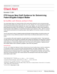 Client Alert December 17, 2014 PTO Issues New Draft Guidance for Determining Patent-Eligible Subject Matter By Cary Miller, Lisa N. Silverman, and Aaron S. Parker The United States Patent and Trademark Office (PTO) issued interim guidance for use by its personnel when determining patent-eligible subject matter under 35 U.S.C. § 101 (“Section 101”). The new guidance will alter the way patent examiners assess patent applications for subject matter eligibility, and may provide some relief to patent applicants and holders in the life sciences. The new guidance attempts to create a uniform approach to 1 2 3 analyzing subject matter eligibility by incorporating the Supreme Court’s decisions in Mayo, Myriad, and Alice, which collectively addressed the law regarding subject matter eligibility for life sciences, software, and business methods. The PTO also issued a series of updated examples that illustrate the latest guidance for natural products, and announced plans to issue additional examples for abstract ideas and software-related patents in the coming weeks. The new guidance offers patent applicants new opportunities for pursuing patent protection. Patent applicants can begin referring to the new guidance immediately when drafting new applications and responding to rejections under Section 101. Where possible, applicants may also wish to file claim amendments or additional continuing patent applications to recoup subject matter ceded in view of the previous PTO guidelines. Applicants should also consider whether to file or maintain any appeals in view of this new guidance. BACKGROUND 35 U.S.C. § 101 states that “[w]hoever invents or discovers any new and useful process, machine, manufacture, or composition of matter, or any new and useful improvement thereof, may obtain a patent therefor…” The Supreme Court has long held that this section of the Patent Act contains important exceptions: “laws of nature, 4 natural phenomena, and abstract ideas” are not patent eligible. The Supreme Court has been very active in this area of law in the past few years, and its recent decisions have attempted to further refine what constitutes 5 patent-eligible subject matter. 1 Mayo Collaborative Serv. v. Prometheus Labs., Inc., 566 U.S. ___, 132 S. Ct. 1289 (2012). 2 Association for Molecular Pathology v. Myriad Genetics, Inc., 569 U.S. ___, 133 S. Ct. 2107 (2013). 3 Alice Corp. Pty. Ltd. v. CLS Bank, Int’l, 573 U.S. ___, 143 S. Ct. 2347 (2014). 4 See Diamond v. Chakrabarty, 447 U.S. 303, 309 (1980); O'Reilly v. Morse, 56 U.S. 62 (1853); Diamond v. Diehr, 450 U.S. 175, 185 (1981); Bilski v. Kappos, 561 U.S. 593, 594 (2010). 5 See Client Alerts for Mayo, Myriad, and Alice. 1 © 2014 Morrison & Foerster LLP | mofo.com Attorney Advertising Client Alert The PTO issued the new guidelines, entitled “2014 Interim Guidance on Patent Subject Matter Eligibility,” to provide patent examiners with specific procedures for determining subject matter eligibility in view of the latest judicial decisions. The new guidance supplements the June 25, 2014 “Preliminary Examination Instructions in view of the Supreme Court decision in Alice Corp” and supersedes the March 4, 2014 “Procedure For Subject Matter Eligibility Analysis Of Claims Reciting Or Involving Laws Of Nature/Natural Principles, Natural Phenomena, And/Or Natural Products.” The PTO noted that many of the changes presented in the new guidelines were made in response to public comments concerning the original March 2014 procedure. The PTO published the new guidance, which is effective immediately, in the Federal Register on December 16, 6 2014. THE NEW PROCEDURE The new guidance alters the process of determining subject matter eligibility previously established in March 2014. As with the previous procedure, an examiner must begin by determining a claim’s broadest reasonable interpretation. The examiner can then proceed to the first step in the analysis, which asks whether the claim is directed to one of the four categories recited in Section 101: processes, machines, manufactures, or compositions of matter. A claim that is not directed to one of these categories is not patent eligible under the statute, and the examiner can stop the analysis here. If the claim is directed to one of these categories, the examiner next proceeds to analyze the claim’s eligibility 7 using the two-part test announced in Alice (also called the Mayo test). In the first part, the examiner determines 8 whether the claim is directed to a judicially recognized exception. Judicially recognized exceptions include abstract ideas, laws of nature, natural phenomena, and natural products. A claim that does not include a judicially recognized exception is patent eligible and the analysis is complete. Furthermore, for any claim that includes one or more nature-based product limitations, the examiner must determine whether the nature-based product limitation(s) exhibit “markedly different characteristics” from their 9 closest naturally occurring counterpart(s). The markedly-different-characteristics analysis should be applied only to the nature-based product limitations themselves. While the previous guidance relied on structural differences 10 for this analysis, examiners can now also consider functional differences or other properties when determining 11 whether a product is markedly different. 6 2014 Interim Guidance on Patent Subject Matter Eligibility, 79 Fed. Reg. 74618 (Dec. 16, 2014). 7 Alice Corp., 134 S. Ct. at 2355. 8 Guidance, 79 Fed. Reg. at 74621. 9 Id. at 74623. 10 11 2 2014 Procedure For Subject Matter Eligibility Analysis Of Claims Reciting Or Involving Laws Of Nature/Natural Principles, Natural Phenomena, And/Or Natural Products, THE UNITED STATES PATENT AND TRADEMARK OFFICE (Mar. 4, 2014), http://www.uspto.gov/patents/law/exam/myriad-mayo_guidance.pdf, at 4-5. Guidance, 79 Fed. Reg at 74623. © 2014 Morrison & Foerster LLP | mofo.com Attorney Adver