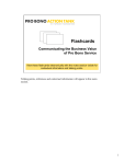 Flashcards Communicating the Business Value of Pro Bono Service View these flashcards electronically with the notes section visible for contextual information and talking points. Talking points, references and contextual information will appear in this notes section. 1 Using These Flashcards This series of flashcards is intended to provide content and usage tips to help you effectively communicate the business value of pro bono service within your company. Use the slide as a flashcard to provide you with benefits and proof points from which to pick and choose in crafting your business case Refer to the notes section for context and comments on usage and speaking points While there are many benefits to realize from pro bono service, most stakeholders have only one or two that truly resonate for them. These flashcards are designed to help you to tailor the most appropriate message for your audience, enabling you to cut and paste the relevant messages that meet your needs. 2 v.1.28 These slides are intended to provide you with a range of messaging that can be used to best communicate the business value of pro bono service to your target internal audience. With this information, a helpful next step could be to set up a meeting with key stakeholders to walk them through the relevant value propositions so you can gain buy-in and support for your pro bono program. 2 Outline An effective pro bono program maximizes both business value and social impact. The following flashcards highlight five critical business benefits to support any company’s business case for pro bono service: A. Leveraged Impact – “Multiplier Effect” B. Enhanced Corporate Citizenship and Reputation C. Human Resources Benefits D. Improved Collaboration and Communication E. Opportunity for Innovation 3 v.1.28 While pro bono service has been an integrated part of the legal profession for years, it is a relatively new concept for the rest of the business community. As companies begin to explore this opportunity, it is helpful to understand the business benefits that justifies investing in a pro bono program. The following flashcards highlight and provide data points to communicate these benefits. These business benefits will be of different priority to each stakeholder, so we recommend that you select and rank them according to your audience’s interests. 3 Leveraged Impact – “the multiplier effect” Pro bono service helps ensure your community partners have access to the expertise they need to achieve their missions serving your communities • Increase the value of your support to community partners while also increasing the magnitude of impact that your community partners have – “the multiplier effect” • Enable your community partners to expand their impact by building their organizational capacity, lowering operating costs and increasing efficiencies1 • Grow your support of community partners outside of fiscal donations • Exemplify “strategic philanthropy” by supporting your community partners through leveraging all of your corporate assets: funding, pro bono service and “extra-hands” activities • Increase your community investment efforts through high-impact volunteerism vs. high head-count volunteerism By the numbers: • 77% of nonprofits believe skilled volunteers could significantly improve their organization’s business practices, but only 12% have been able to put volunteers to use in that way2 • 86% of nonprofit executives said it is a top priority for them to improve their organization’s ability to run effectively3. • Pro bono service is considered a cash-equivalent donation and is valued at an average of $120/hour, as compared to $19.51 for traditional volunteer activities4 4 v.1.28 Leveraged impact means enabling your community partners to be more effective at helping even more constituents, and getting a greater social return on your investment of resources. Pro bono service allows you to have a “multiplier effect” – both by increasing the value of your support to community partners by leveraging more valuable volunteer time, and increasing the amount and magnitude of impact that your community partners have as a result of capacity-building projects. Sources: 1. “Can Corporate Volunteering Support the Bottom Line? The Challenge.The Opportunity.The Case for Investment,” LBG Associates, The Case Foundation and Hands on Network, 2005. 2. “2006 Volunteer IMPACT Study”, Deloitte & Touche USA LLP and the Points of Light Foundation, 2006. 3. “Taproot Foundation Survey of Nonprofits”, The Taproot Foundation, 2008. 4. “The Dollar Valuation for Pro Bono Service”, CECP and The Taproot Foundation, 2009. 4 Enhanced Corporate Citizenship and Reputation Pro bono service deepens your reputation as a good corporate citizen Why does this matter? “Playing to core competencies while meeting beneficiaries’ needs is the most effective form of corporate philanthropy.” Stanford Social Innovation Review • Surveys show that corporate citizenship is now the top driver of reputation1 • Companies engaged in corporate social responsibility had a 10-year return on equity that was 10% higher than their counterparts and a 10 year relative return to shareholders that was 65% higher2 How does pro bono service make this possible? • Most Americans regard the donation of products and employee time more favorably than financial support3 • The dollar valuation of an hour of pro bono service is nearly 10x that of traditional volunteer activities, adding significantly to your annual total community giving and impact4 • Pro bono service helps companies stay visible in the community, even in the face of cutbacks • Pro bono service demonstrates the value of your company’s core competencies 5 v.1.28 Good corporate citizenship is increasingly recognized as a critical component of the sustainable business. Pro bono service is a particularly efficient and effective way to improve
