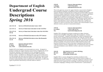 Department of English Undergrad Course Descriptions Spring 2016 222: 01-­‐18 Survey of World Literature since 1650 223: 01-­‐12 Survey of American Literature to the Civil War 224: 07-­‐24, Survey of American Literature since the Civil War 39-­‐50 225: 01-­‐06, Survey of British Literature to the 18th Century 226: 01-­‐12, Survey of British Literature since the Romantic 14-­‐25 Period 299:01 Literary Interpretation E. Drew MW 2:30-­‐3:45 Ext. 2783 eedrew@olemiss.edu English 299 is the English curriculum gateway course. Designed to prepare students for upper-­‐division coursework in English, the course introduces students to the methods of close reading and textual analysis and develops the writing and research skills required of literary studies. In addition to studying the major genres of literature, we will examine the aims and conventions of the literary critical essay and extend this inquiry to literary studies more generally. Our goal is to better understand the nature and function of literature as well as the types of questions that literary criticism seeks to answer. Updated 11/11/15 299:02 Literary Interpretation I. Kamps T TH 9:30-­‐10:45 Ext. 7439 egkamps@olemiss.edu This is the gateway course for upper-­‐division coursework in English that introduces students to methods of close reading and textual analysis. Students will develop the writing and research skills required of literary studies, build their critical vocabularies, and gain experience analyzing the formal features of fiction, poetry, drama and their subgenres. In addition to studying the major genres of literature, we will examine the aims and conventions of the literary critical essay and extend this inquiry to literary studies more generally. The goal is to better understand the nature and function of literature and literary criticism as well as to become more creative and critical thinkers, more effective writers, and more resourceful scholars. 299:03 Literary Interpretation K. Lechler T TH 11:00-­‐12:15 Ext. katelechler@gmail.com English 299 is designed to prepare students for upper-­‐division coursework in English. Using three major literary genres—fiction, poetry, and drama-­‐-­‐ students will build their critical vocabularies and practice close reading and textual analysis. We will also examine the aims and conventions of the literary critical essay. The three associated paper assignments will develop the writing and research skills required of literary studies. Our goal is to better understand the nature and function of literature as well as the types of questions that literary criticism seeks to answer. Along the way, we will become more creative and critical thinkers, more effective writers, and more resourceful scholars. 302:05 Introduction to Creative Writing M. Cain MWF 11:00-­‐11:50 Ext. mcain@go.olemiss.edu English 302 is a course designed to introduce students to the fundamentals of creative writing, both as writers and as readers of contemporary poetry and prose. A specific emphasis is placed on how different writers approach the challenge of subverting narrative and normative language, evoking a sense of lawlessness—particularly in 1 the context of our postmodern Digital Age. This course is structured around the assumption that good writers are also good readers; accordingly, students will study poetry, fiction, nonfiction, graphic narrative, and hybrid/experimental texts by a variety of authors, most of whom are contemporary. This is a three-­‐genre course (comprising poetry, fiction, and nonfiction), and we will discuss ways in which various texts defy and adhere to these labels. 302:04 Introduction to Creative Writing V. Henry MWF 9:00-­‐9:50 Ext. vhenry@go.olemiss.edu This class is designed to introduce students to three genres: poetry, short stories, and creative nonfiction. Students will examine aspects of craft and engage in exercises that improve their ability to create meaningful works of literature. Students will leave the class with a portfolio of original work and an ability to productively participate in conversations about creative texts. In this course, you will learn the foundational techniques of creative writing and read works such as short stories, essays, and poems like writers do with an eye for craft, for the way the thing was made. You will use the readings as inspiration to create your own original works. We will focus on how to make words work for you, answering questions like: How might I critique and explore another’s work? and How can writing be relevant in my life? 302:01 Introduction to Creative Writing M. Woodward MWF 10:00-­‐10:50 Ext. mwoodwar@go.olemiss.edu Creative writing often flirts with or scorns established literary traditions. At its most seductive, it accomplishes both, using the artifices of craft to highlight the individual voice. In this course, we will study the foundational techniques of fiction, poetry & creative non-­‐ fiction, while paying equal attention to the contemporary voices who push hardest against these traditions. In doing so, we will look to find the pockets of our literary landscape where you can begin to find your voice as an emerging writer. We will also take advantage of our location in Oxford to participate in one of the country’s most thriving writing communities. Authors studied will include both canonical voices & Updated 11/11/15 contemporary standouts. This balance of writing & reading will strengthen your own voice, as well as your understanding of genre & craft. By the end of the semester, you will submit a revised essay, short story, or packet of poems to a literary journal to be considered for publication. 302:02 Introduction to Creative Writing J. Harrington TTH 1:00-­‐2:15 Ext. jeharrin@go.olemiss.edu This course introduces students to the formal elements of writing poetry, creative nonfiction and fiction. We will read a variety of work in these three for