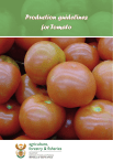 Production guidelines for Tomato agriculture, forestry & fisheries Department: Agriculture, Forestry and Fisheries REPUBLIC OF SOUTH AFRICA Production guidelines for Tomato DEPARTMENT OF AGRICULTURE FORESTRY AND FISHERIES Directorate Plant Production Obtainable from Resource Centre Directorate Agricultural Information Services Private Bag X144, Pretoria, 0001 South Africa The web: www.daff.gov.za/publications Published by Directorate Agricultural Information Services Department of Agriculture, Forestry and Fisheries Private Bag X144, Pretoria, 0001 South Africa For further information please contacts Directorate Plant Production, Division Vegetable Crops Tel: 012 319 6072 Fax: 012 319 6372 E-mail: DPP@daff.gov.za Disclaimer This document has been compiled by the Department of Agriculture, Forestry and Fisheries and every effort has been made to ensure accuracy and thoroughness of the information contained herein and all liability for any errors, omissions or inaccuracies in such information and data, whether attributable to inadvertence or otherwise. The Department of Agriculture, Forestry and Fisheries therefore accepts no liability that can be incurred resulting from the use of this information. CONTENTS PART I: 1. 2. 3. 4. 5. 6. 7. 8. General aspects Classification ........................................................................ 1 Origin and distribution .......................................................... 1 Production levels and areas in South Africa ............................ 1 Major production areas in South Africa ................................ 1 Cultivars ................................................................................. 1 Description of plant ............................................................... 2 Climatic requirement ............................................................. 2 Soil requirement ................................................................... 3 Part ii: 1. 2. 3. 4. 5. 6. 7. 8. 9. 10. Cultivation practices Propagation .......................................................................... Soil preparation .................................................................... Planting ................................................................................. Fertilisation ........................................................................... Irrigation ................................................................................ Weed control ........................................................................ Pest control ........................................................................... Disease control ..................................................................... Other cultivation practices .................................................... Harvesting methods ............................................................. 3 3 3 3 4 4 5 6 8 9 Part iii: 1. 2. 3. 4. 5. 6. Post-harvest handling Post-harvest handling............................................................ Grading ................................................................................ Packing ................................................................................. Storage ................................................................................. Transport ............................................................................. Marketing ............................................................................. 10 10 10 10 11 11 Part iv: Production schedules ........................................................... Part v: Utilisation .............................................................................. 13 References ........................................................................................... 13 Part 1: General aspects 1. Classification Scientific name: Lycopersicon esculentum Mill. Common names: Tomato, Tamati, Tamatiso, uTamatisi Family: Solanaceae 2. Origin and distribution Tomato is indigenous to the Peru and Equador region in South America and it probably evolved from Lycopersicon esculentum var. cerasiforme, the cherry form. However, it was domesticated and first cultivated in Central America by early Indian civilisations of Mexico. The Spanish explorers introduced tomato into Spain and it was later taken to Morocco, Turkey and Italy. In Italy and France, it was termed “love apple”. It was widely believed that the tomato was poisonous and its use as a food crop was only accepted in the 18th century. Tomato is now one of the most popular and widely grown vegetables around the world. 3. Production levels and areas 3.1 South Africa Tomatoes are the second most important vegetable commodity after potatoes, planted to about 6 000 hectares. Tomatoes contribute about 24 % of the total vegetable production in South Africa. 4. Major production areas in South Africa Tomatoes are grown all over the country in summer and in winter in frost-free areas, and their production is concentrated in Limpopo, the Mpumalanga Lowveld and Middleveld, the Pongola area of Kwazulu-Natal, the southern parts of the Eastern Cape, and the Western Cape. Growing of tomatoes in tunnels is becoming a popular and important crop production method in South Africa. 1 5. Cultivars The choice of cultivars is based on fruit quality quality, adaptability and reliability reliability, susceptibility to diseases and pests, plant growth habit, the specific market and the planting time. The fresh market cultivars include Florodade, Heinz 1370, Karino, Rodade, Fortress, Hytec, Star 9001, Star 9003, Sundance and Zeal. Baldo, Blockbuster, Disco, P 747 and Shirley are also fresh market cultivars that have a long shelf life. Tomato cultivars suitable for jam or preserving include HTX 14, Legato, Roma VF, Rossol, Star 9056F, Sun 6216 and UC 82B. Cherry tomato cultivars are Bamby and Josephine while those suitable for planting in tunnels are Atletico, Daniella and Gabriella. The Roma VF cultivar can be 