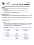 U. OF ILLINOIS BIOLOGY L I B R A RY Tips for Searching Article Databases INTRODUCTION Finding the right article and other materials is not happenstance. Creating a strategy is essential for successful search results. Knowledge about information resources and search strategies will bring your search to a successful conclusion, even when you are not familiar with the topic at hand. General Search Strategy • Create a search statement using keywords • Use bibliographic databases appropriate to your topic. Checking more than one can be very useful to pick up unique titles • Use keywords and controlled language • Use Boolean searching • Change approaches as necessary – gathering information is not a linear process • Continue to identify applicable keywords and controlled vocabulary to go back and check in the selected database(s) and other resources CREATING A SEARCH STATEMENT The most difficult part of conducting a good search is usually not figuring out which buttons to push, but rather in figuring out which terms to use and how to combine them to find literature that is “on topic.” This requires a strategy that will optimize the number of relevant titles that you can find. One component of this strategy is the search statement. A search statement is a query that identifies the information you are searching for in a bibliographic database in a way that can be utilized by the databases search engine for retrieval of records. Many times a topic can be described in many different ways. As there are over 500,000 words in the English language, there are undoubtedly numerous words that could be used to describe the topic. Where to begin? • • • • Break your search (AKA search) statement/question into concepts and keywords. Note other possible natural vocabulary keywords and applicable concept terms while doing background research. Identify synonyms of those keywords. Create concepts of 1-3 words. Example Do not type in “stem cell methodology for changing valine to glutamic acid in hemoglobin” because the database program may search for exactly those words in exactly that order. There may be very relevant materials that do not have this phrase exactly, but have the concepts of that phrase. Break your search statement down into concepts. In the search statement example below, your main concepts would be “sickle cell anemia”, “hemoglobin”, and “stem cell methodology”. The concepts you identify may have other words that mean the same/nearly the same thing (synonyms) or relate. The search statement example below may also have additional concepts of interest to identify synonymous or related concepts (e.g., valine and glutamic acid), upon which you can further develop your strategy. Search Statement: Identify potential stem cell methodology that could be used for changing valine to glutamic acid in hemoglobin of people with sickle cell disease. CONCEPT 1 CONCEPT 2 CONCEPT 3 Sickle cell anemia Hemoglobin Stem cell methodology Identify Related Keywords CONCEPT 1 CONCEPT 2 CONCEPT 3 Sickle cell anemia Hemoglobin Stem cell methodology Sickle cell disease Beta chain Stem cells Hemoglobin S disease Beta-globin gene Gene silencing globulinopathies codon nucleotide 6 Gene splicing (middle) AT Gene transfer techniques Valine Targeted gene repair Glutamic acid Genetic engineering RNA antisense UTILIZE DATABASE FEATURES In order to search effectively it is important to become familiar with the database that is being used. Knowing the shortcuts and quirks of the database will save time by decreasing frustration and understanding the system. Some important characteristics to identify are which element truncates words, how to search for a phrase, and how the Boolean operators are used. To become familiar with the database read the database guides, look at examples in the guides, and take the tutorials. If a search does not give the results anticipated, read the database help pages to determine what the database is doing. The searching methods vary from database to database; however most have a basic search function and an advanced search function. Some databases will also have an intermediate search function. These search functions are also highly variable, which is why it is important to become familiar with the database. Depending upon the goal of the search will depend on which search function to use. Basic Searches Typically, the basic search box only searches one field, which may or may not be predetermined. The basic search is useful to determine how big the collection of articles related to the topic is, which will help in generating search strategies. It is also helpful when doing a known item search, for example when the exact title is known. Advanced Searches The advanced search functions give more control to the user, and allows for a more refined search. Multiple search terms in multiple fields can be searched for simultaneously. The advanced search should be used when the collection of interested articles is large and needs to be narrowed. It is also useful when information from more than one field would help in locating items of interest, such as when looking for an author with a common name, which can be narrowed by combining name with subject. Limits Many databases have limits that control the available articles by specified parameters, for example, by date, format, material type, language, or location. This feature is helpful to eliminate records that are outside the selected limits, such as if only review articles are needed, or if only articles in the last five years are of interest. Controlled Vocabulary Many databases use controlled vocabulary. Some use Library of Congress Subject Headings (LCSH) or Medical Subject Headings (MeSH), but there are also some that create their own controlled vocabulary. It is important to note the controlled vocabulary for the database in use. This will help to refine the search and direct the search into the appropriate area.