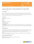 GRADE 11 MATH: TRIGONOMETRIC FUNCTIONS UNIT OVERVIEW Building on their previous work with functions, and on their work with trigonometric ratios and circles in Geometry, students extend trigonometric functions to all (or most) real numbers. To reinforce their understanding of these functions, students begin building fluency with the values of sine, cosine, and tangent at π/6, π/4, π/3, π/2, etc. Students make sense of periodic phenomena as they model with trigonometric functions. TASK DETAILS Task Name: What’s the Weather? Grade: 11 Subject: Algebra II/Trigonometry Depth of Knowledge: 3/4 Task Description: Students apply the Pythagorean Theorem and trigonometric ratios to find the measure of angles on the coordinate plane. They write these measures in degree and radian form. Students also use trigonometric functions to model natural phenomena, reflect on the accuracy of these models, and use them to make predictions about future events. Standards Assessed: F-­‐TF.A.1: Understand radian measure of an angle as the length of the arc on the unit circle subtended by the angle. F-­‐TF.A.2: Explain how the unit circle in the coordinate plane enables the extension of trigonometric functions to all real numbers, interpreted as radian measures of angles traversed counterclockwise around the unit circle. F-­‐TF.B.5: Choose trigonometric functions to model periodic phenomena with specified amplitude, frequency, and midline. F-­‐TF.C.8: Prove the Pythagorean identity sin2(θ) + cos2(θ) = 1 and use it to find sin(θ), cos(θ), or tan(θ), given sin(θ), cos(θ), or tan(θ) and the quadrant of the angle. Standards for Mathematical Practice: MP.3: Construct viable arguments and critique the reasoning of others. MP.4: Model with mathematics. 1 TABLE OF CONTENTS The task and instructional supports in the following pages are designed to help educators understand and implement Common Core–aligned tasks that are embedded in a unit of instruction. We have learned through our pilot work that focusing instruction on units anchored in rigorous Common Core– aligned assessments drives significant shifts in curriculum and pedagogy. PERFORMANCE TASK: TRIGOMETRIC FUNCTIONS…….……….………..…………………………………................3 RUBRIC AND SCORING GUIDE…………………………………………………………………………………………………………7 FORMATIVE ASSESSMENTS……….……………………………………………………………………………………………......13 INSTRUCTIONAL SUPPORTS……………………………………………………………………………………………………......32 UNIT OUTLINE…………………………………………………………………………………………………………………..33 EXTENSIONS……………………………………………………………………………………………………………………..57 GUIDED QUESTIONS……….………………………………….……………………………………………………………..58 VISUALS…………………….……………………………………………………………………………………………………..60 Acknowledgements: This bundle was developed by Alex Sczesnak, Cathleen Cuffie, and Carlos Bermudez from the Metropolitan High School 12X248, in collaboration with the Common Core Fellows. 2 GRADE 11 MATH: TRIGONOMETRIC FUNCTIONS PERFORMANCE TASK 3 What’s the Weather? Algebra II – Module 2: Trigonometric Functions – Performance Task 1. Use two different methods to find the measure of the angle below in standard position, showing your work for both. Express your answer in radians. 2. Given sin (θ ) = 3√5/11, find cos (θ ) and tan (θ ). Justify your answer using the Pythagorean identity. 4 3. The table below displays the average high temperature, by month, in Central Park. Average Monthly Temperature (°F) JAN FEB MAR APR MAY JUN JUL AUG SEP OCT NOV 38 42 50 61 71 79 84 83 75 64 54 DEC 43 a. Use this data to write a function representing the temperature, f(m), in month m, with January = 0. Graph this function on the axes below, labeling any critical values. 5 b. Climate scientists believe that the average high temperature in Central Park for the month of July could increase by as much as 10° by 2050. Assuming that minimum average temperature stays the same, write a second function modeling this change and use it to predict the new average high temperature for the month of October. c. Although only 12 data points are given in the table above, the function modeled above is continuous. Should average monthly temperature be expressed as a continuous function? Why or why not? d. The table below displays the average monthly rainfall, by month, in Central Park. JAN 3.65 FEB 3.21 MAR 2.36 APR 4.50 Average Monthly Rainfall (in.) MAY JUN JUL AUG 4.19 6.41 4.60 4.44 SEP 4.28 OCT 1.40 NOV 4.02 DEC 5.00 Your friend Sam wants to model this data using a function similar to the one you’ve written. Do you think this is a good idea? Why or why not? 6 GRADE 11 MATH: TRIGONOMETRIC FUNCTIONS SCORING GUIDE AND RUBRIC 7 8 9 10 What’s the Weather? Algebra II – Module 2: Trigonometric Functions – Performance Task Rubric What’s the Weather? Rubric The elements of performance required by this task are: • Uses trigonometric ratios and the Pythagorean theorem to find side lengths and angle measures on the coordinate plane • Writes angle measures in radian and degree form • Models phenomena with trigonometric functions Possible Responses Points Section Points 2 1. a) Uses arctan to find the measure of an angle θ in the fourth quadrant b) Uses the Pythagorean theorem to solve for the given side length 2 and uses this side length to find either the cosine or sine of an angle θ in the fourth quadrant 1 c) Writes this angle in radians in standard pos