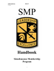 SMP Handbook DRAFT Contents SMP Handbook Simultaneous Membership Program i SMP Handbook DRAFT Contents Simultaneous Membership Program (SMP) Handbook Summary. This handbook has been developed to assist Troop Program Unit (TPU) commanders, ROTC cadre, and participating ROTC cadets in the management of, and participation in, the Reserve Officers Training Corps (ROTC) Simultaneous Membership Program (SMP). It also contains a training template with examples, a Lieutenant Professional Development Book (LPDB), and an SMP SOP that as been modeled after SOPs used by Reserve Component (RC) TPU units with successful SMP programs. Applicability. ROTC Battalions, U.S. Army Reserve (USAR) and Army National Guard (ARNG) TPU commanders, and personnel who supervise, train, administer, or process ROTC/SMP are encouraged to use this handbook. Where this handbook conflicts with official regulations or policies, the official regulation or policy will govern. References. Appendix A lists required and related publications. Explanation of Abbreviations. this handbook. The glossary contains explanation of abbreviations used in Suggested Improvements. Insert appropriate statement Preface This handbook is divided into two sections. The first section provides condensed information that has been extracted from regulations and policies governing SMP; the second section provides guidance and suggestions for managing an SMP program at the user level. It is not meant to dictate operating procedure, but is a tool to assist involved personnel in developing an effective SMP program that meshes with their particular circumstances. Direct coordination between the ROTC and the USAR/ARNG commands/units is essential for the SMP to function as it is designed and intended. CONTENTS Preface SECTION I (General Information) SECTION II (Workbook) Page Page i SMP Handbook DRAFT Contents Page SECTION I Introduction Purpose I-1 General Description SMP Objective Program SMP Cadet I-1 Responsibilities Professor of Military Science (PMS) RC TPU Commander SMP Cadet I-2 Eligibility Criteria SMP Cadet Eligibility/ Ineligibility Student/Cadet Contracting Criteria I-2 Page Administrative SMP Processing I-3 Assignment Priorities I-3 Provisions Governing Size of SMP I-3 SMP Cadet Grade/Rank I-4 Uniform and Subsistance and Billeting I-4 Incentive Programs Status I-4 i Training I-5 Evaluation of SMP Cadets I-6 Scholarships I-6 Guaranteed Reserve Forces Duty (GRFD) I-6 Mobilization/ Call to Active Duty I-7 Necessary Forms I-7 SMP Handbook DRAFT Contents Page SECTION II Preface Introduction II-1 Value of SMP II-2 Mentorship/ Sponsorship II-2 Training II-3 Evaluation II-4 Communication/ Cooperation RC Unit – ROTC II-4 Recruiting/ Retention II-5 Consolidated List of Tips and Suggestions II-7 1 SMP Handbook DRAFT Section I contents Appendixes A. References B. SMP SOP C. Training Methods and Template D. Lieutenant Professional Development Book (LPDB) E. Blank Forms Glossary Abbreviations Endnotes contents I-0 SMP Handbook DRAFT Section I I-1 SMP Handbook DRAFT Section I Section I (General Information) Introduction This section contains selected, condensed extracts from regulations and policies that govern the ROTC/ SMP program. Where appropriate the governing regulation(s) / policy(s) have been noted for further reference. Purpose Provide USAR/ARNG unit commanders, ROTC cadre, ROTC cadets and potential cadets, and other personnel involved with SMP a quick reference guide to the ROTC/ SMP program. contents General Description of SMP Objective The purpose of the SMP Program is to: (1) give eligible enlisted members of the Army National Guard and Army Reserve an opportunity to participate in the Advanced ROTC Program; (2) provide Non-scholarship, Reserve Forces Duty scholarship, Military Junior College scholarship, or Dedicated Army National Guard scholarship students an opportunity to serve in a Reserve Component unit while participating in Advanced ROTC. The intent of the SMP is to increase officer accessions into the Reserve Components by increasing ROTC enrollment from enlisted RC members who are attending college. The SMP also reinforces training on the role of the commissioned officer in the Army and gives Cadets the experience of working with soldiers and Noncommissioned Officers. Upon completion of Basic Training, or equivalent qualification [MSI & MSII, ROTC Basic Camp], a Reserve Component soldier or ROTC cadet, who is an academic junior, can join the Advanced ROTC Program and earn a commission as an officer in the United States Army while completing their college degree. Program The ROTC/SMP is a volunteer officer training program designed to increase the number of ROTC officers available for Reserve Forces Duty (RFD). It encourages enrollment and participation in the ROTC Advanced Military Course and provides the future officer with leadership and reserve unit experience. SMP Cadet Is a reserve officer trainee assigned to a Reserve Component Troop Program Unit (TPU), while simultaneously participating as a contracted cadet in the ROTC Advanced Course at a university or college. contents I-0 SMP Handbook DRAFT Section I Responsibilities References CDT CMD 145-XX Professor of Military Science (PMS) • Interview and Counsel prospective SMP cadets concerning reserve unit assignment and SMP. • Ensure that contracted ROTC cadets belonging to a TPU have SMP status. • Secure the SMP agreement (DA Form 4824-R or NGB Form 594-1) before cadet signs ROTC contract. • Provide TPU commander with copy of ROTC Bn training schedule and obtain copy of unit’s weekend drill schedule. • Conduct visit (at least annually) with TPU commander to observe SMP training. Troop Program Unit (TPU) Commander • Conduct interview with prospective SMP candidates for suitability prior to acceptance into program. • Ensure SMP cadets are supervised and mentored by a commissioned officer. • Develop SMP training plan. • Evaluate and counsel SMP cadets. • Notify 