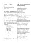 Aralin sa Filipino Mga halimbawa ng mga salitang may kambal-katinig c 2013 Pia Noche, www.samutsamot.com Talâ: katinig - consonant, kambal-katinig - consonant blend/consonant cluster, pantig - syllable, pantigin - syllabicate bl asamblea (a-sam-ble-a; assembly) blangket (blang-ket; blanket) blangko (blangko; blank ) bleyd (bleyd; blade) bloke (blo-ke; block ) blokeo (blo-ke-o; blockade) blusa (blu-sa; blouse) doblado (do-bla-do; doubled ) doble (do-ble; double) doblekara (do-ble-ka-ra; double-faced/reversible) emblema (em-ble-ma; emblem) emperdible/imperdible (em-per-di-ble/ im-per-di-ble; safety pin) imbaryable (im-bar-ya-ble; invariable) imbisible (im-bi-si-ble; invisible) imbulnerable (im-bul-ne-ra-ble; invulnerable) impenetrable (im-pe-ne-tra-ble; impenetrable) impermeable (im-per-me-a-ble; impermeable) implamable (im-pla-ma-ble; inflammable) impleksible (im-plek-si-ble; inflexible) imposible (im-po-si-ble; impossible) impresyonable (im-pres-yo-na-ble; impressionable) ingkompatible (ing-kom-pa-ti-ble; incompatible) inhospitable (in-hos-pi-ta-ble; inhospitable) inseperable (in-se-pe-ra-ble; inseparable) intolerable (in-to-le-ra-ble; intolerable) irebokable (i-re-bo-ka-ble; irrevocable) iresistible (i-re-sis-ti-ble; irresistible) iresponsable (i-res-pon-sa-ble; irresponsible) iritable (i-ri-ta-ble; irritable) kable (ka-ble; cable) komportable (kom-por-ta-ble; comfortable) legumbre (le-gum-bre; legume) miserable (mi-se-ra-ble; miserable) posible (po-si-ble; possible) problema (pro-ble-ma; problem) respetable (res-pe-ta-ble; respectable) responsable (res-pon-sa-ble; responsible) Kambal-katinig Ang salita ay may kambal-katinig kung ito ay may dalawang magkasunod na katinig sa isang pantig. Halimbawa, ang kambal-katinig sa salitang pluma (plu-ma) ay ang pl dahil ito ay nasa unang pantig na plu. Ang salitang petsa ay walang kambal-katinig dahil ang ts ay hindi magkasama sa isang pantig. Kung pantigin ang salitang petsa, ito ay pet-sa. May mga salita na may magkasunod na katinig ngunit walang kambal-katinig ang mga ito kapag ang dalawang katinig ay hindi magkasama sa isang pantig. Ang mga sumusunod ay mga halimbawa ng mga salitang walang kambal-katinig: 1. 2. 3. 4. 5. 6. 7. 8. 9. 10. 11. 12. 13. bl : hibla (hib-la) br : Pebrero (Peb-re-ro) dr : kuwadrado (ku-wad-ra-do) dy: radyo (rad-yo) gr : tigre (tig-re) gl : taglay (tag-lay) kl : saklolo (sak-lo-lo) kr : awtokratiko (aw-tok-ra-ti-ko) ks: liksi (lik-si) pl : daplis (dap-lis) pr : kopra (kop-ra) tr : litro (lit-ro) ts: otso (ot-so) Ang pagpapantig ng mga salitang susunod ay batay sa Bagong Edisyon ng UP Diksiyonaryong Filipino. 1 roble (ro-ble; oak ) terible (te-ri-ble; terrible) dr br alambre (a-lam-bre; wire) alhebra (al-he-bra; algebra) alhebraika (al-he-bra-i-ka; algebraic) alpombra (al-pom-bra; carpet/rug) braket (bra-ket; bracket) brandi (bran-di; brandy) braso (bra-so; arm) breyk (breyk; brake) breyslet (breys-let; bracelet) brigada (bri-ga-da; brigade) brilyante (bril-yan-te; precious stone/ diamond ) brilyo (bril-yo; shine) Britanya (Bri-tan-ya; Great Britain) broas (bro-as; ladyfingers) brodkast (brod-kast; broadcast) brokoli (bro-ko-li; broccoli ) bronse (bron-se; bronze) bruha/bruho (bru-ha; witch) brutal (bru-tal; brutal ) bruto (bru-to; brute) Disyembre (Dis-yem-bre; December ) embriyon (em-bri-yon; embryo) imbertebrado (im-ber-te-bra-do; invertebrate) kobra (ko-bra; cobra) miyembro (mi-yem-bro; member ) Nobyembre (Nob-yem-bre; November ) Oktubre (Ok-tu-bre; October ) pobre (po-bre; poor ) Setyembre (Set-yem-bre; September ) sobra (so-bra; surplus/excess) sobre (so-bre; envelope) sumbrero (sum-bre-ro; hat) vertebra (ver-te-bra; vertebral ) 2 adres (a-dres; address) adresi (a-dre-si; addressee) almendra (al-men-dra; almond ) dendrita (den-dri-ta; dendrite) dragon (dra-gon; dragon) dram (dram; drum) drama (dra-ma; drama) dramatiko (dra-ma-ti-ko; dramatic) dramatisasyon (dra-ma-ti-sas-yon; dramatization) drayber (dray-ber; driver ) drenahe (dre-na-he; drainage) dribol (dri-bol; dribble) droga (dro-ga; drug) drogeriya (dro-ge-ri-ya; pharmacy) dromedaryo (dro-me-dar-yo; dromedary) drowing (dro-wing; drawing) komadre (ko-ma-dre; female sponsor in baptism, confirmation or marriage) komadrona (ko-ma-dro-na; midwife) kompadre (kom-pa-dre; male sponsor in baptism, confirmation or marriage) madrasa (ma-dra-sa; school for teaching Islam) dy adyenda (a-dyen-da; agenda) dyaket (dya-ket; jacket) dyakpat (dyak-pat; jackpot) dyambol (dyam-bol; jumpball ) dyanitor (dya-ni-tor; janitor ) dyey (dyey; pronunciation of the letter J ) dyi (dyi; pronunciation of the letter G) dyip/dyipni (dyip/dyip-ni; jeep/jeepney) mardyin (mar-dyin; margin) gl gripo (gri-po; faucet) Griyego (Gri-ye-go; Greek ) glab (glab; glove) groto (gro-to; grotto/cavern) gladyador (glad-ya-dor; gladiator ) grupo (gru-po; group) glandula (glan-du-la; gland ) ingrato/ingrata (in-gra-to/in-gra-ta; ingrate) glasyal (glas-yal; glacial ) kongratulasyon (kon-gra-tu-las-yon; globo (glo-bo; globe) congratulation) glokoma (glo-ko-ma; glaucoma) kongregasyon (kon-gre-gas-yon; congregation) glosari (glo-sa-ri; glossary) kongresista (kon-gre-sis-ta; congressman) glosaryo (glo-sar-yo; glossary) Kongreso (Kon-gre-so; Congress) glukosa (glu-ko-sa; glucose) koreograpiya (ko-re-o-gra-pi-ya; choreography) koreograpo (ko-re-o-gra-po; choreographer ) krusigrama (kru-si-gra-ma; crossword puzzle) gr miligramo (mi-li-gra-mo; milligram) peregrino (pe-re-gri-no; pilgrim) agresibo (a-gre-si-bo; aggressive) programa (pro-gra-ma; program) anagrama (a-na-gra-ma; anagram) sinematograpiya (si-ne-ma-to-gra-pi-ya; awtograpo (aw-to-gra-po; autograph) cinematography) dekagramo (de-ka-gra-mo; decagram) desgrasya/disgrasya (des-gras-ya/dis-gras-ya; telegrama (te-le-gra-ma; telegram) accident) emigrante (e-mi-gran-te; emigrant) kl emigrasyon (e-mi-gras-yon; emigration) gangrena (gan-gre-na; gangrene) angkla (ang-kla; anchor ) graba (gra-ba; gravel ) eklipse (e-klip-se; eclipse) grabe (gra-be; grave/serious) eksklam