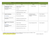 PMP 42 - 9: PROCESS GROUPS, KNOWLEDGE AREAS, AND IOTTs No 1 Process &Process Group Develop Project Charter PG: Initiating KA: Project Integration Management Input 1. Project Statement of Work 2. Business Case Output Tools & Techniques 1. Project Charter 1. Expert judgment 3. Contract 4. Enterprise Environmental Factors 5. Organizational Process Assets 2 Identify Stakeholders 1. Project Charter PG: Initiating 2. Procurement Documents KA: Project Communications Management 3. Enterprise Environmental Factors 1. Stakeholder Register 2. Stakeholder Management Strategy 1. Expert judgment 1. Project Management Plan 1. Expert judgment 2. Stakeholder analysis 4. Organizational Process Assets 3 Develop Project Management Plan PG: Planning KA: Project Integration Management 1. Project Charter 2. Outputs from Planning Processes 3. Enterprise Environmental Factors 4. Organizational Process Assets 1|Page th The PMP 42-9: Process Groups, Knowledge Areas, IOTTs is a compilation of the information presented in the PMBOK 4 Edition. th st The PMBOK 4 Edition is applicable to PMP exams up to the 31 of July 2013. Key: PG – Process Groups, KA – Knowledge Area Prepared by: Meegan Scott PMP 42 - 9: PROCESS GROUPS, KNOWLEDGE AREAS, AND IOTTs No 4 Process &Process Group Collect Requirements PG: Planning Input 1. Project Charter 2. Stakeholder Register KA: Project Scope Management Output Tools & Techniques 1. Requirements Documentation 2. Requirements Management Plan 3. Requirements Traceability Matrix 1. Interviews 2. Focus groups 3. Facilitated Workshops 4. Group Creativity Techniques 5. Group Decision Making Techniques 6. Questionnaires & Surveys 7. Observations 8. Prototypes 5 Define Scope 1. Project Charter 1. Project Scope Statement 1. Expert judgment PG: Planning 2. Requirements Documentation 2. Project Document Updates 2. Product Analysis KA: Project Scope Management 3. Organizational Process Assets 3. Facilitated Workshops 4. Alternatives Identification 2|Page th The PMP 42-9: Process Groups, Knowledge Areas, IOTTs is a compilation of the information presented in the PMBOK 4 Edition. th st The PMBOK 4 Edition is applicable to PMP exams up to the 31 of July 2013. Key: PG – Process Groups, KA – Knowledge Area Prepared by: Meegan Scott PMP 42 - 9: PROCESS GROUPS, KNOWLEDGE AREAS, AND IOTTs No 6 7 Process &Process Group Input Output Tools & Techniques Create WBS 1. Project Scope Statement 1. WBS PG: Planning 2. Requirements Documentation 2. WBS Dictionary KA: Project Scope Management 3. Organizational Process Assets 3. Scope Baseline 4. Project Document Updates Define Activities 1. Scope Baseline 1. Activity List 1. Rolling Wave Planning PG: Planning 2. Enterprise Environmental Factors 2. Activity Attributes 2. Decomposition KA: Project Time Management 3. Organizational Process Assets 3. Milestone List 3. Templates 4. Expert Judgment 1. Project Schedule Network Diagram 2. Project Document Updates 1.Precedence Diagramming Method (PDM) 8 Sequence Activities 1. Decomposition 1. Activity List PG: Planning 2. Activity Attributes KA: Project Time Management 3. Milestone List 4. Project Scope Statement 2. Dependency Determination 3. Applying Leads & Lags 4. Schedule Network Templates 5. Organizational Process Assets 3|Page th The PMP 42-9: Process Groups, Knowledge Areas, IOTTs is a compilation of the information presented in the PMBOK 4 Edition. th st The PMBOK 4 Edition is applicable to PMP exams up to the 31 of July 2013. Key: PG – Process Groups, KA – Knowledge Area Prepared by: Meegan Scott PMP 42 - 9: PROCESS GROUPS, KNOWLEDGE AREAS, AND IOTTs No 9 Process &Process Group Input Estimate Activity Resources 1. Activity List PG: Planning 2. Activity Attributes KA: Project Time Management 3. Resource Calendars Output Tools & Techniques 1. Activity Resource Requirements 1. Expert Judgment 2. Resource Breakdown Structure 3. Project Document Updates 4. Enterprise Environmental Factors 3. Published Estimating Data 4. Bottom-up Estimating 5. Project Management Software 5. Organizational Process Assets 10 2. Alternatives Analysis 1. Activity List 1. Activity Durations Estimate 1. Expert Judgment PG: Planning 2. Activity Attributes 2. Project Document Updates 2. Analogous Estimating KA: Project Time Management 3. Activity Resource Requirements 3. Parametric Estimating 4. Resource Calendars 5. Project Scope Statement 4. Three-Point Estimates 5. Reserve Analysis Estimate Activity Durations 6. Enterprise Environmental Factors 7. Organizational Process Assets 4|Page th The PMP 42-9: Process Groups, Knowledge Areas, IOTTs is a compilation of the information presented in the PMBOK 4 Edition. th st The PMBOK 4 Edition is applicable to PMP exams up to the 31 of July 2013. Key: PG – Process Groups, KA – Knowledge Area Prepared by: Meegan Scott No 11 PMP 42 - 9: PROCESS GROUPS, KNOWLEDGE AREAS, AND IOTTs Process &Process Group Input Develop Schedule PG: Planning KA: Project Time Management Output Tools & Techniques 1. Activity List 2. Activity Attributes 3. Project Schedule Network Diagram 1. Project Schedule 2. Schedule Baseline 1. Schedule Network Analysis 2. Critical Path Method 3. Schedule Data 3. Critical Chain Method 4. Activity Resource Requirements 4. Project Document Updates 4. Resource Leveling 5. Resource Calendars 5. What-If Scenario Analysis 6. Activity Duration Estimates 6. Applying Leads & Lags 7. Project Scope Statement 7. Schedule Compression 8. Enterprise Environmental Factors 8. Scheduling Tool 9. Organizational Process Assets 12 Estimate Costs 1. Scope Baseline 1. Activity Cost Estimates 1. Expert Judgment PG: Planning 2. Project Schedule 2. Basis of Estimates 2. Analogous Estimating KA: Project Cost Management 3. Human Resource Plan 3. Project Document Updates 3. Parametric Estimating 4. Risk Register 4. Three-Point Estimates 5. Enterprise Environmental Factors 5. Reserve Analysis 6. Organizational Process Assets 6. Bottom-up Estimating 7. Cost of Quality (COQ) 8. Project Management Estimating S