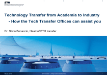 Technology Transfer from Academia to Industry - How the Tech Transfer Offices can assist you Dr. Silvio Bonaccio, Head of ETH transfer May 22, 2013 ETH transfer – Linking Science and Business 1 ETH transfer - Embedment In ETH Zurich May 22, 2013 ETH transfer – Linking Science and Business 2 Technology transfer support at ETH Zurich Dr. Donald Tillman Dr. Silvio Bonaccio Dr. Urs Zuber Head ETH transfer Industrial Relations Officer Director Dr. Niklaus Bühler Honorary Counsel ETHZ Senior Industrial Relations Officer Fundraising Research Agreements Corinna Adler Director Strategic Partnerships NP Dr. Daniel Auerbach As of Sept. 1, 2013 Finance & Organisation NP Dr. Matthias Hölling Dr. Alexa Mundy Dr. Matthias Hölling Dr. Marjan Kraak Head Group, D-CHAB, D-ERDW, D-HEST Mira Krämer, RA Dr. Marjan Kraak Christoph Neubauer, RA Stefan Lux Legal Counsel ETH transfer D-GESS, D-ITET, D-MATH, D-MTEC D-ARCH, D-BAUG, D-MATL, D-MAVT, D-MTEC, D-PHYS, D-HEST Hannah Greiner, RA Dr. Christina Dittrich Legal Counsel ETH transfer D-ARCH, D-BAUG, D-ERDW, D-INFK, Dr. Peter Seitz I&E Lab Coordination Vacant Yvonne Andreoli, RA Legal Counsel ETH transfer General Spin-offs Life Science Technology Commercialization Legal Counsel ETH transfer D-MAVT, D-PHYS, D-USYS ieLabs Head Group D-INFK., D-ITET, D-MATH Software Licenses Industry Relations Alumni Fundraising Lioudmila Thalmann Dr. Silke Meyns D-BIOL, D-HEST, D-MAVT Franziska Juch Spin-off Support Dr. Andreas Klöti Head Group, Industry Partnerships D-BSSE, D-CHAB, D-MATL Nathalie Fontana Director Strategic Partnerships Patents & Licenses Dr. RA lic.iur LL.M. Daniel Ronzani Legal Counsel Dr. Bernhard Hostettler Patents & Licenses D-BIOL, D-BSSE, D-CHAB, D-GESS, D-USYS NP Emanuel Weber As of June 1, 2013 Temporary Support Backoffice Elisabeth Schlegel Research Agreements May 22, 2013 Patricia Huber Research Agreements ETH transfer – Linking Science and Business Patrizia Zuppinger Patent & Licenses Administration 3 Research Collaboration with Industry - Prerequisites § Project is scientifically or technically relevant. § Results can be used afterwards freely for further research and educational purposes. § Publication rights are granted to ETH Zürich (Secrecy ?!). § Reasonable agreement with regard to ownership of IP and rights for commercial use: § IP ownership with industrial partner, restricted to partner‘s field of main interest: Overhead-Cost of 45% § IP ownership with ETH Zürich, industrial partner has an option to an exclusive license against payment: Overhead-Cost 10%, later: acc. to additional license agreement § Freedom with regard to future collaborations with other third parties. May 22, 2013 ETH transfer – Linking Science and Business 4 The 3 problems with the IPR owned by universities 1. How to avoid missing the big opportunity ? 2. So many patents – what now ? 3. Who pays the Bill? With this strategy we will catch a big one! Patent-Bills – Please Dump Your Money Here Adapted from: Gary Larson AND: … it still can take a long time from basic science to products (5 - 40 yrs) May 22, 2013 ETH transfer – Linking Science and Business 5 Patenting and Licensing of Intellectual Property § The Technology Transfer Office supports the researchers with: § Evaluation of ETH Zurich inventions § Advice on patentability § Support with patent applications (incl. funding) and related strategy § Technology Marketing (Presentations, Fact Sheets for industry, Fairs, Tech Alerts, etc.) § Identification and selection of licensees § Negotiation of licensing agreements § Controlling and revenue distribution. SPARK – Award for the best Invention of the Year! May 22, 2013 ETH transfer – Linking Science and Business 6 Patent Guidelines at ETH Zurich (1/5) § ALL inventions / filed patents MUST be communicated to ETH transfer § Inventions made at work and at home (if ETH resources were used in between). § Inventions / Patents must ALWAYS be filed in the name of ETH Zürich § Institutes or professors are no legal entities. § Applications are financed 100% by the VP Research § If ETH Zurich finds the technology interesting, potential licensees and markets are available, and the strategy is aligned with ETH transfer. May 22, 2013 ETH transfer – Linking Science and Business 7 Patent Guidelines at ETH Zurich (2/5) § Distribution of revenues § After deduction of all external cost (mainly legal fees): 1/3 inventor, 1/3 research group, 1/3 global budget ETH Zurich. § Assignment to inventors possible § If ETH Zurich AND the research group have no interest. § Software § Regulated since Jan. 1st, 2002 (OR). § Valorization / commercialization analogous to inventions. May 22, 2013 ETH transfer – Linking Science and Business 8 Patent Guidelines at ETH Zurich (3/5) § Tasks of the inventors: § § § § § Disclose invention to ETH transfer using the Disclosure Form. Perform a preliminary search in patent data bases. Prepare “technical part” of the patent. DO NOT PUBLISH IN ANY WAY! Publication possible immediately after securing IPR. § Role of the technology transfer office § Clarifies the legal situation (e.g. ownership - Contracts with third parties, private inventions). § Estimates market potential. § Performs short research in patent data bases. § Connects to suitable patent attorney. May 22, 2013 ETH transfer – Linking Science and Business 9 Patent Guidelines at ETH Zurich (4/5) § Filing Patents at ETH Zurich: § Decision by ETH transfer in consultancy with inventors, whether and how to file a patent. § If a patent is filed: administration and costs are dealt with by ETH transfer. § If ETH transfer decides not to file a patent, the professor may do so at own cost. § If the professor also declines, rights can be assigned to inventors (as private individuals), if requested. § If no licensee/buyer is found, patent may be permitted to lapse or will be transferred/assigned to inventors. May 22, 2013 ETH transfer – Li