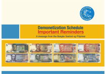 A message from the Bangko Sentral ng Pilipinas 1 What is demonetization? Demonetization is the process of removing the monetary value of a legal tender currency by the issuing authority. Demonetized currency will no longer be accepted to pay for goods and services. 2 Common reasons why central banks demonetize their currency Prevention of counterfeiting Benchmarking with other countries Change in type of currencies used within the country as part of political/ social reform money caused by hyper- Change in type/form of government Reduction to only 1 design series for countries with 2 or more design series of notes in circulation, for 3 Why does BSP need to demonetize? !" Currencies in the world are demonetized because this is one way of safeguarding the integrity of the currency to protect it against counterfeiters. As a matter of practice, central banks around the world change the design of their currencies that have been in circulation for over 10 years. !" In the case of the Philippines, the old banknote series, introduced in 1985 or 30 years ago, is being replaced by the New Generation Currency (NGC) series which was launched in 2010. 4 What is the basis of the BSP for the demonetization of the old banknote series? What are the old banknote series to be demonetized? The New Design Series (NDS) Banknotes 6 Year Issued Year Issued 2001 1987 1991 1987 2001 1986 1987 1997 2002 1985 2001 1985 The Old Banknote Series The New Design Series (NDS) Banknotes Features of the old banknote series that distinguishes it from our new banknote series: tLaunched in 1985 tZFBSTJODJSDVMBUJPO t'FBUVSFTUIFPME#41MPHP tEFOPNJOBUJPOT,,,,BOEQJTP t4FDVSJUZUISFBEJTUIJOOFS t4FSJBMOVNCFSJTDPNQPTFEPGPSQSFýYMFUUFSTBOEUPEJHJUTXIJDIBSF VOJGPSNJOTJ[F t5IFSFWFSTFTJEFPGUIFPMEOPUFTGFBUVSFTTJHOJýDBOUFWFOUTJO1IJMJQQJOFIJTUPSZ JDPOJDCVJMEJOHTBOEIFSJUBHFTJUFT OLD BSP LOGO (1993-2010) 7 When did the BSP start the Demonetization process of the old banknotes series? JANUARY Under Monetary Board Resolution No. 1939, the Monetary Board has approved the commencement of the Old Banknote Series demonetization process on: 1 2015 START Share of current volumes of old series and new series in circulation as of 31 December 2014 Pieces 21% 79% 8 Total BSP Notes Issued (New series) 2,681.00 mpcs Total BSP Notes Issued (Old series) 711.68 mpcs What are the important dates for the Demonetization schedule? JANUARY DECEMBER 1 2015 31 2015 !" The old banknote series can still be used alongside the new banknote series for daily transactions to pay for goods and services. !" The BSP encourages the public to use/exchange the old banknotes in their possession within this period. 9 What are the important dates for the Demonetization schedule? JANUARY 1 2016 Effective January 1, 2016, the old banknote series can no longer be used in daily transactions to pay for goods and services. Only the new banknote series can be used for daily transactions starting January 1, 2016. 10 What are the important dates for the Demonetization schedule? JANUARY DECEMBER 1 2016 31 2016 ex ch an ge you r old !" The old banknote series can only be exchanged at face value, free of charge, in authorized agent banks and at the BSP Cash Department or any of its Regional and Branches. serie s for th e new series 11 2)%("%r#"()#",34*+(%&("$%(#5"6*+"()#"7#3*&#(,-%(,*&"5chedule? JANUARY 1 2017 !" The"old"banknote"series"shall"cease"to"be"a"liability"of"the"BSP"and"shall"be"consider#$" demonetized !" The"old"banknote"series"can"no"longer"be"used"in"daily"transactions"to"pay"for"goods"%&$" services"and"can"no"longer"be"exchanged"at"the"Bangko"Sentral"or"any"BSP"%'()*+,-#$" %.#&("/%&01 12 2015 From January 1 to December 31, 2015 – The old banknote series can still be used for daily transactions 2016 From January 1 to December 31, 2016 – The old banknote series can no longer be used for daily transactions and can only be exchanged in authorized agent banks and BSP Cash Department of any of its Regional 2017 Starting January 1, 2017 Demonetized, no more monetary value. IMPORTANT REMINDERS Only the New Generation Currency banknotes will remain as legal tender in the country 13 What are the New Banknote Series t/($CBOLOPUFTFSJFTXBT MBVODIFEPO%FDFNCFS t'FBUVSFTUIFOFX#41MPHP tEFOPNJOBUJPOT BOEQJTP NEW BSP LOGO t4FDVSJUZUISFBEJTXJEFS (June 2010-Present) t4FSJBMOVNCFSJTDPNQPTFEPGPS QSFýYMFUUFSTBOEPSEJHJUTXIJDIBSFJODSFBTJOHJOTJ[F t5IFSFWFSTFTJEFPGUIFOFXOPUFTGFBUVSFT JDPOJD OBUVSBM XPOEFST BOE TQFDJFT UIBU DBO CFGPVOEJOUIFDPVOUSZ. t6TFTOFXTFDVSJUZGFBUVSFTUPFOTVSFUIFTBGFUZPGUIF QVCMJDBHBJOTUDPVOUFSGFJUFST Level I Level II 14 Security features that can readily be detected by the general public without the use of any equipment Security features that can be detected using simple equipment. Characteristics & security features of the Philippine Banknotes NDS 1st Level NGC Watermark Security Thread Security Fibers Iridescent Band Watermark Security Thread Security Fibers Embossed Prints Serial Number See-Through Mark Concealed Value Optically Variable Ink (OVI) Embossed Prints Serial Number See-Through Mark Concealed Value Optically Variable Ink (OVI) 1st Level Optically Variable Device Patch 2nd Level Micro-printing Fluorescent Features Micro-printing Fluorescent Features 2nd Level 15 What banknote series will now be used in the Philippines? The New Generation Currency Banknotes 20-PISO President Manuel L. Quezon ! Filipino as the National Language 1935 Malacañan Palace ! Seal of the Republic of the Philippines ! New BSP Seal 50-PISO President Sergio Osmeña ! First National Assembly 1907 Leyte Landing ! Seal of the Republic of the Philippines ! New BSP Seal 100-PISO President Manuel A. Roxas ! Central Bank of the Philippines 1949 Inauguration of the Third Republic, 4 July 1946 ! Seal of the Republic of the Philippines ! New BSP Seal 16 200-PISO President Diosdado P. Macapagal ! EDSA People Power II January 2001 Independence House ! Barasoain Church ! Seal of the Republic of the Philippines
