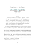 Transformative Policy Change Matt W. Loftis and Peter B. Mortensen mattwloftis@ps.au.dk peter@ps.au.dk∗ Aarhus University April 14, 2015 Abstract Theories of policy change vary in their concepts and explanations. Nevertheless, they all depict a process in which decision makers’ weighting and evaluation of what matters to policy decisions changes over time. That is, relationships between inputs to the policy process and eventual outcomes are not static. Despite the theoretical consensus on dynamic relationships, this expectation has not been systematically empirically tested. This paper sets out to do so by using state space models to estimate time-varying relationships between inputs to the policy process and outcomes. We apply this econometric technique to data spanning several decades across a variety of contexts. The results indicate that many relationships are, indeed, time-varying and suggest a variety of implications for future empirical research. Most researchers studying public policy and public spending decisions with time series analysis assume that the explanatory factors - whether political, economic, or institutional have a time-invariant influence. Yet, this assumption about constant effects through time has little grounding in substantive theories of public policy. Whereas the empirical approach has been dominated by a search for stable estimates, important theories of policy change, developed over the past decades, imply time-varying effects. The Advocacy Coalition Framework proposed by Sabatier (1987, 1988) and later developed in collaboration with Jenkins-Smith (Sabatier & Jenkins-Smith 1993) is one. A second is the theory of social learning and policy paradigms introduced by Hall (1989, 1993), and a third theory is the Punctuated Equilibrium Theory developed by Baumgartner & Jones (1993). ∗ Working paper, please do not cite without permission. 1 The three theoretical approaches differ in their conceptualization, description and explanation of policy change, but they all depict a policy-making process in which the decisionmakers’ weighting and evaluation of what is important to policy decisions is likely to change over time. Such change may be slow or fast, gradual or punctuated, and it may reflect changes in core beliefs, policy paradigms or policy images. Nevertheless, a common implication of the different theoretical approaches to policy change is that the importance of explanatory factors varies over time. This means that scholars of policy change need to redirect focus from estimating stable relationships between X and Y to a higher order level of theorizing and modeling why and when the relationship between X and Y may change. Inspired by (Lieberman 2002, 700) we denote the latter type of change transformative change. The aim of this paper is to integrate the empirical study of public spending with the dominant theories of temporal instability in policy and spending decisions. First, we review traditional time series studies of public policy change. Second, we introduce the concept of transformative change and show how it relates to the dominant theoretical accounts of the policy-making process. Third, we discuss what the concept of transformative change implies for time series studies of changes in public policy. Fourth, inspired by recent developments in public opinion studies, we motivate our choice of method to study transformative change empirically. Fifth, using U.S. public spending time series compiled by the Policy Agendas Project we demonstrate how this approach can be implemented and what it can teach us about spending change. An important aim of the paper is to argue for a new research agenda that links the empirical approach to policy change closer to the theoretical emphasis on transformative change, and it concludes by highlighting some of the next questions that such a research agenda may focus on. 2 Time-series studies of public policy change For decades public spending has been a widely used measure of public policy. The validity of this policy indicator can be discussed, but to illustrate the non-dynamic character of most time-series studies of public policy it suffices to review a wide range of time-series studies using public spending as the dependent variable. Thus, we focus on research using spending time series as the dependent variables, but claim that the general point about a mismatch between the empirical approach and dominant theories of policy change is of broader relevance to time series studies including those using other indicators of public policy besides spending. Davis, Dempster & Wildavsky (1966) were some of the first scholars to utilize spending time series data. Based on Wildavsky’s (1964) qualitative studies of incremental decisionmaking in the U.S. Congress, they derived the implication that: “Since the budgetary process appears to be stable over periods of time, it is reasonable to estimate the relationships in budgeting on the basis of time series data” (Davis, Dempster & Wildavsky 1966, 531). More particularly, they argued that year-to-year changes in budget appropriations could be accounted for by a set of simple, linear equations. Of special interest to the argument of this paper is, however, the conclusion they draw based on the simple regression analyses (ibid., 542): “... the budget process is only temporally stable for short periods... scholarly efforts would be better directed toward knowledge of why, where, and when changes in the process occur.” In 1974 the authors followed up on this conclusion and approached the temporal instabilities as an omitted variable problem (Davis, Dempster & Wildavsky 1974). Adding eighteen exogenous variables to the simple time series models they hoped to be able to account for the temporal instabilities. However, the impression is that the extended models do not explain away the shifts in coefficients identified in the 1966-article. Surprisingly, given the focus of