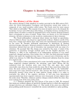 Chapter 4: Atomic Physics “Nature resolves everything into it component atoms and never reduces anything to nothing.” Lucretius (95 BC - 55 BC) 4.1 The History of the Atom The earliest attempt to find simplicity in matter occurred in the fifth century B.C., when the Greek philosophers Leucippus and Democritus stated that matter is composed of very small particles called atoms. The Greek word for atom means “that which is indivisible.” The concept of an atom of matter was to lie dormant for hundreds of years until 1803 when John Dalton, an English chemist, introduced his atomic theory of matter in which he proposed that to every known chemical element there corresponds an atom of matter. Today there are known to be 105 chemical elements. All other substances in the world are combinations of these elements. The Greek philosophers’ statement about atoms was based on speculation, whereas Dalton’s theory was based on experimental evidence. Dalton’s world of the atom was a simple and orderly place until some new experimental results appeared on the scene. M. Faraday performed experiments in electrolysis by passing electrical charges through a chemical solution of sodium chloride, NaCl. His laws of electrolysis showed that one unit of electricity was associated with one atom of a substance. He assumed that this charge was carried by the atom. A study of the conduction of electricity through rarefied gases led the English physicist J. J. Thomson, in 1898, to the verification of an independent existence of very small negatively charged particles. Even before this, in 1891, the Irish physicist George Stoney had made the hypothesis that there is a natural unit of electricity and he called it an electron. In 1896, Henri Becquerel discovered radiation from the atoms of a uranium salt. The results of these experiments led to some inevitable questions. Where did these negatively charged particles, the electrons, come from? Where did the radiations from the uranium atom come from? The only place they could conceivably come from was from inside the atom. But if they came from within the atom, the atom could no longer be considered indivisible. That is, the “indivisible” atom must have some internal structure. Also, because the atom is observed to be electrically neutral, there must be some positive charge within it in order to neutralize the effect of the negative electrons. It had also been determined experimentally that these negative electrons were thousands of times lighter than the entire atom. Therefore, whatever positive charges existed within the atom, they must contain most of the mass of the atom. J. J. Thomson proposed the first picture of the atom in 1898. He assumed that atoms are uniform spheres of positively charged matter in which the negatively charged electrons are embedded, figure 4.1. This model of the atom was called the plum pudding model because it resembled the raisins embedded in a plum pudding. 4-1 Chapter 4: Atomic Physics Figure 4.1 The plum pudding model of the atom. That is, the electrons were like the raisins, and the pudding was the positively charged matter. But how are these electrons distributed within the atom? It became obvious that the only way to say exactly what is within the atom is to take a “look” inside the atom. But how do you “look” inside an atom? In 1911, Hans Geiger (1882-1945) and Ernest Marsden, following a suggestion by Ernest Rutherford (1871-1937), bombarded atoms with alpha particles to “see” what was inside of the atom. The alpha particles, also written particles, were high-energy particles emitted by radioactive substances that were discovered by Rutherford in 1899. These particles were found to have a mass approximately four times the mass of a hydrogen atom and carried a positive charge of two units. (Today we know that the particle is the nucleus of the helium atom.) Rutherford’s idea was that the direction of motion of the particle should be changed or deflected by the electrical charges within the atom. In this way, we can “see” within the atom. The experimental arrangement is illustrated in figure 4.2. Figure 4.2 Rutherford scattering. A polonium-214 source emits particles of 7.68 MeV. A lead screen with a slit (the lead collimator) allows only those particles that pass through the slit to 4-2 Chapter 4: Atomic Physics fall on a very thin gold foil. It is expected that most of these particles should go straight through the gold atoms and arrive at the zinc sulfide (ZnS) screen. When the particle hits the ZnS screen a small flash of light is given off (called a scintillation). It is expected that some of these particles should be slightly deflected by some of the positive charge of the atomic pudding. The ZnS screen can be rotated through any angle around the gold foil and can therefore observe any deflected particles. This process of deflection of the particle is called Rutherford scattering. The expected scattering from the distributed positive charge should be quite small and this was what at first was observed. Then Rutherford suggested that Geiger and Marsden should look for some scattering through large angles. To everyone’s surprise, some particles were found to come straight backward ( 1800). This back-scattering was such a shock to Rutherford that as he described it, “It was almost as incredible as if you fired a 15-inch shell at a piece of paper and it bounced off and came right back to you.” The only way to explain this back-scattering is to assert that the positive charge is not distributed over the entire atom but instead it must be concentrated in a very small volume. Thus, the experimental results of large-angle scattering are not consistent with the plum pudding model of an atom. Rutherford, therefore, proposed a new model of the atom, the nuclear atom. In this model, the atom consists of a very small, dense, positively charged nucleus. Because the negatively charged electrons would be 
