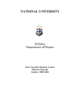 NATIONAL UNIVERSITY Syllabus Department of Physics Four Year B.Sc Honours Course Effective from the Session : 2009–2010 National University Subject: Physics Syllabus for Four Year B.Sc Honours Course Effective from the Session: 2009-2010 Year wise courses and marks distribution First year Honours Course Code Course Title Mechanics Properties of Matter, Waves & Oscillations Heat, Thermodynamics and Radiation Physics Practical-I Fundamentals of Mathematics Calculus-I Chemistry-I Chemistry-I Practical Or Introduction to Statistics Statistics Practical-I Total= Marks Credits 100 100 100 100 100 50 100 50 4 4 4 4 4 2 4 2 100 50 700 4 2 28 Detailed Syllabus First Year First Year B.Sc. Honours in Physics Course Code: ............... Examination duration: 4 hrs. Course Name: Mechanics Marks: 100 60 Lectures Credits: 4 1. Vector Algebra: Vector and scalar quantities; Vectors and their components, Vector addition and subtraction, Scalar and vector triple products, scalar and vector fields, Vector differentiation and integration, Gradient, Divergence and Curl and their physical significance, Gauss’s divergence theorem, Green’s theorem and Stoke’s theorem, Polar, Spherical and Cylindrical co-ordinates. 2. Concept of Measurement: Different Measurement units, International system of units, Origin of Length mass and time, Conversion of units from one system to another. 1 3. 4. 5. 6. 7. 8. 9. 10. Particles Motion in one dimension: Concept of motion and frame of reference, Position and displacement, Average velocity and average speed, Instantaneous velocity and speed, Acceleration, Constant acceleration, Equations for motion with constant acceleration, Free-fall acceleration, Equation for free-fall acceleration, Particles of physics and basic structure of atoms and nuclear. Particles Motion in Two and Three Dimensions: Position and displacement using vectors, Velocity and average velocity, Acceleration and average acceleration, Equation of motion using vector, Projectile motion, Uniform circular motion. Force and Motion: Newton’s laws of motion and their applications, Concept of mass, Force and weight, Frictional forces and Properties of friction, Drag force and terminal speed, Forces of nature. Work, Energy and Power: Kinetic and Potential energy, Work done by constant and variable forces, Work-energy theorem, Hooke’s law, Work done by a spring force, Work done by weight, Power, Gravitational potential energy, Conservation of energy. System of Particles: Center of mass of systems of particles, Center of mass of rigid bodies, Linear momentum of a particle, Linear momentum of a system of particles, Conservation of linear momentum for a system of particles. Collisions of Bodies: Collisions and its classification, Impulse and linear momentum, Elastic and inelastic collision in one dimension, Motions of the center of mass of colliding bodies. Rotational Kinematics: Translational and Rotational motion, Angular Position, Angular displacement, Angular Velocity and angular acceleration, Rotation with constant angular acceleration, Relation between linear and angular kinematics of a particles in circular motion. Rotational Dynamics: Torque and angular momentum and their relation, Kinetic energy of rotation and rotational inertia (moment of inertia), Combined Translational and rotational motion of a rigid body, Parallel and perpendicular axes theorems of moment of inertia, calculation of moment of inertia for solids of different shapes, conservation of angular momentum. Relation between angular momentum and torque. Books Recommended: 1. Spiegel, M.R. 2. Halliday, D., Resnick, R. and Walker, J 3. Halliday, D and Resnick, R. 4. Sears, F.W., Zemansky, M.W. and Young, H.D. : : Vector Analysis Fundamentals of Physics : Physics : University Physics Course Code: ............... Course Name: Properties of Matter, Waves & Oscillations Examination duration: 4 hrs. Marks: 100 60 Lectures Credits: 4 1. Gravitation: Kepler’s Laws, Law of universal gravitation, G and its determination, Inertial and gravitational mass, Acceleration due to gravity and its variation, Measurement of acceleration due to gravity by compound pendulum and Kater’s pendulum, Gravitational potential and field in simple cases, Gravitational potential energy. 2. Elasticity: Hooke’s Law, Elastic constants of isotropic solids, Poisson’s ratio and their interrelations, Internal elastic potential energy, Experimental determination of elastic constants, Torsion of a cylinder, Bending of beams, Cantilever, Variation of elasticity with temperature. 2 3. Surface Tension: Surface tension and surface energy, Adhesive and cohesive forces, Molecular theory of surface tension, Pressure on a curved membrane of uniform tension, Soap bubble, Capillarity, Angle of contact and its measurement, Determination of surface tension of water and mercury drop, Variation of surface tension with temperature. 4. Fluid Dynamics: General concepts of fluid flow, Streamlines, Equation of continuity, Bernoulli’s equation, Application of Bernoulli’s equation and equation of continuity. Coefficient of viscosity, Critical velocity and Reynold’s number, Poiseuille’s formula and its correction, Measurement of viscosity, Variation of viscosity with temperature. 5. Waves: Waves and Particles, Types of waves, Transverse and Longitudinal waves, Wavelength and frequency, The Speed of a traveling Wave, Wave speed on a stretched string, Energy and power of a traveling string wave, The principle of superposition for waves, Interference of waves, Complex waves, Standing waves and Resonance. 6. Sound Waves: The Speed of Sound, Propagation and speed of longitudinal waves, Traveling longitudinal waves, Standing longitudinal waves, Beats, Doppler effect. 7. Oscillations: Simple harmonic motion (SHM), Energy consideration in SHM, Applications of SHM, Relation between SHM and uniform circular motion, Combinations of two SHM’s, Lissajous’ figures, Two-body oscillations, Damped ha