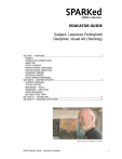 EDUCATOR GUIDE Subject: Lawrence Ferlinghetti Discipline: Visual Art (Painting) SECTION I - OVERVIEW ........................................................................................... 2 SUBJECT CURRICULUM CONNECTIONS OBJECTIVE STORY SYNOPSIS INSTRUCTIONAL STRATEGIES INSTRUCTIONAL OBJECTIVES EQUIPMENT NEEDED MATERIALS NEEDED INTELLIGENCES ADDRESSED SECTION II – CONTENT/CONTEXT ............................................................................ 3 CONTENT OVERVIEW THE BIG PICTURE RESOURCES – TEXTS RESOURCES – WEB SITES VIDEO RESOURCES BAY AREA FIELD TRIPS SECTION III – VOCABULARY..................................................................................... 6 SECTION IV – ENGAGING WITH SPARK ..................................................................... 8 Still image from SPARK story, 2007 SPARK Educator Guide – Lawrence Ferlinghetti 1 SECTION I - OVERVIEW SUBJECT INSTRUCTIONAL OBJECTIVES Lawrence Ferlinghetti GRADE RANGES 9‐12 & Post‐secondary • CURRICULUM CONNECTIONS • • To introduce students to the work of Lawrence Ferlinghetti To provide context for the understanding of the Beat poetry movement To inspire students to write creatively and develop critical thinking skills in reading poetry Visual Arts & Language Arts OBJECTIVES EQUIPMENT NEEDED • • • • Understand the development of personal works of art and their relationship to broader social themes and ideas, abstract concepts, and the history of art. Develop basic observational drawing and/or painting skills. Develop visual, written, listening and speaking skills through looking at, creating and talking about visual artworks. Develop an expressive visual vocabulary with which to address personal and/or social themes and ideas. STORY SYNOPSIS Spark visits Ferlinghetti in his studio to catch a glimpse of another side of his artistic practice as he prepares a series of works for a show at San Francisco’s George Krevsky Gallery. INSTRUCTIONAL STRATEGIES • • • • • Group oral discussion, review and analysis, including peer review and aesthetic valuing as a group Teacher‐guided instruction, including demonstration and guidance Hands‐on individual projects in which students work independently Hands‐on group projects in which students assist and support one another Critical reflection on personal expressions and how they are seen and received by others SPARK Educator Guide – Lawrence Ferlinghetti • TV & VCR with SPARK story about Lawrence Ferlinghetti • Computer with Internet access, navigation software, speakers and a sounds card, printer • Cassette player, CD player, or computer audio program MATERIALS NEEDED • Access to libraries with up‐to‐date collections of periodicals, books, and research papers • Pencils, pens, and paper INTELLIGENCES ADDRESSED Bodily‐Kinesthetic ‐ control of oneʹs own body, control in handling objects Interpersonal ‐ awareness of othersʹ feelings, emotions, goals, motivations Intrapersonal ‐ awareness of oneʹs own feelings, emotions, goals, motivations Spatial ‐ ability to manipulate and create mental images in order to solve problems Logical‐Mathematical ‐ ability to detect patterns, reason deductively, think logically See more information on Multiple Intelligences at www.kqed.org/spark/education. 2 SECTION II – CONTENT/CONTEXT CONTENT OVERVIEW Over the past six decades Lawrence Ferlinghetti has established himself as one of the most renowned poets and publishers in the world. The founder of City Lights Books and noted Beat writer is commonly considered one of the greatest literary figures of the twentieth century. But Ferlinghetti has also been painting for almost as long as he has been writing. Spark visits Ferlinghetti in his studio to catch a glimpse of another side of his artistic practice as he prepares a series of works for a show at San Francisco’s George Krevsky Gallery. Ferlinghetti first took up painting in 1948 while living in Paris on the G.I. Bill, at a time when French artists were heavily influenced by the work of Picasso and Spanish Surrealism. Like many American painters at the time, Ferlinghetti interpreted these influences to produce Abstract Expressionist works. But the artist quickly became dissatisfied with non‐objective painting, abandoning it in favor of works that incorporated figuration as well as the written word. Now in his late 80s, Ferlinghetti still paints fervently, and most mornings he can be found working in the Hunter’s Point Shipyard studio that he has kept since 1979. All the paintings that he is preparing for his show at George Krevsky combine provocative, sometimes mystical imagery with written words: some of his own, others from canonical wordsmiths such as Blake and Eliot. Though he began painting early in his career, Ferlinghetti only began exhibiting his works in the 1980s after Krevsky approached the poet after a reading. After paying Ferlinghetti a great compliment on his writing, the artist responded that the gallery owner should see his paintings. Krevsky’s visit to Ferlinghetti’s studio began a relationship that has lasted more than twenty years. SPARK Educator Guide – Lawrence Ferlinghetti Lawrence Ferlinghetti was born in Yonkers, New York in 1919. He graduated from the University of North Carolina at Chapel Hill before serving as an officer in the US Navy during the Second World War. Returning to New York, Ferlinghetti received his master’s degree from Columbia University followed by a doctorate degree from the Sorbonne in Paris. While living in France, Ferlinghetti met the influential poet Kenneth Roxroth, who encouraged him to move to San Francisco, where he eventually came to be known as one of the founder of the Beat movement. In 1953, Ferlinghetti founded the City Lights bookstore with Peter D. Martin, and the publishing house in 1955. Ferlinghetti has since published more than 25 books of poetry and has won numerous literary awards THE