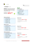 泛美国际 Name_ Date • A na l o g i e s 1 Level 12 Directions: Choose the pair of words that best express a relationship similar to that of the original pair. Then write the bridge sentence(s) to the right. By definition, a platitude is cliché. By definition, a sage is wise. Example: Bridge Type: Definition #) PLATITUDE : CLICHÉ A) B) C) D) E) dogma : accurate theater : dramatic sage : wise legerdemain : obvious portent : beneficial Bridge Type: Characteristic 1) VITRIOL : BITTER A) B) C) D) E) hindsight : perfect alabaster : white buoyancy : light equilibrium : just jubilation : biblical Bridge Sentence: A characteristic of vitriol is to be bitter. A characteristic of _. is to be Bridge Type: Function 2) INVECTIVE : BLAME A) B) C) D) E) homage : copy grandeur : admire duplicity : increase depravity : corrupt masonry : construct Bridge Sentence: The function of invective is to blame. The function of is to . Bridge Type: Characteristic 3) VERNACULAR : REGIONAL A) B) C) D) E) leaf : autumnal senator : dissentious fluctuation : irregular budget : austere autopsy : fatal © Copyright PICEC, 2013. All rights reserved. Bridge Sentence: A characteristic of a vernacular is to be regional. A characteristic of a _. is to be 1 Bridge Type: Degree 4) VIRULENT : POISONOUS A) B) C) D) E) autonomous : free disparate : different botanical : flowery dormant : tired unique : eccentric Bridge Sentence: Virulent is an extreme form of poisonous. is an extreme form of _. Bridge Type: Part to Whole 5) GRENADIER : ARMY A) B) C) D) E) inkling : pen wheelchair : paraplegic couch : lethargy count : nobility insurrection : government Bridge Sentence: A grenadier is part of the army. A is part of the _. Bridge Type: Lack 6) FAKE : AUTHENTICITY A) B) C) D) E) latent : manifestation impenetrable : defense lacteal : milk preponderant : thought retrograde : direction Bridge Sentence: Something that is fake lacks authenticity. . Bridge Type: Definition (Antonyms) 7) NEFARIOUS : VIRTUOUS A) B) C) D) E) stringent : solid subliminal : secret reticent : talkative jocular : humorous haggard : old 8) CASTIGATE : CRITICIZE A) B) C) D) E) dishevel : destroy brutalize : attack legalize : filibuster predict : forecast kill : massacre © Copyright PICEC, 2013. All rights reserved. Bridge Sentence: By definition, nefarious is the opposite of virtuous. . Bridge Sentence: . . 2 Answers and Explanations 1) B Vitriol is cruel and bitter criticism. Thus, a characteristic of vitriol is to be bitter. Alabaster is a white, fine-grained form of gypsum. Thus, a characteristic of alabaster is to be white. Therefore (B) is correct. 2) E Invective is insulting or abusive language intended to blame someone. Thus, the function of invective is to blame. Masonry is the craft of a mason, a person who builds structures. Thus, the function of masonry is to construct. Therefore (E) is correct. 3) C Vernacular is regional dialect or speech. Thus, a characteristic of vernacular is to be regional. A fluctuation is a variation or deviation from the norm. Irregular means atypical or nonstandard. Thus, a characteristic of a fluctuation is to be irregular. Therefore (C) is correct. 4) B Virulent means extremely severe or harmful in effects. Poisonous means harmful. Thus, virulent is an extreme form of poisonous. Disparate means very different. Thus, disparate is an extreme form of different. Therefore (B) is correct. 5) D A grenadier is a soldier armed with grenades. Thus, a grenadier is a part of an army. A count is a European nobleman. Nobility is the group of people belonging to the noble class. Thus, a count is part of the nobility. Therefore (D) is correct. 6) A Authenticity is the state of being real or genuine. Thus, something that is fake lacks authenticity. Latent means existing but not yet manifest or visible. Manifestation is something that is visible or clearly shown. Thus, something that is latent lacks manifestation. Therefore (A) is correct. 7) C Nefarious means wicked or criminal. Virtuous means having high moral standards. Thus, nefarious is the opposite of virtuous. Reticent means not talkative or willing to reveal one’s thoughts. Thus, reticent is the opposite of talkative. Therefore (C) is correct. 8) A Castigate means to severely criticize. Thus, castigate is an extreme form of criticize. Brutalize means to attack someone savagely and excessively. Thus, brutalize is an extreme form of attack. Therefore (A) is correct. © Copyright PICEC, 2013. All rights reserved. 3 泛美国际 Name_ Date • A na l o g i e s 2 Level 12 Directions: Choose the pair of words that best express a relationship similar to that of the original pair. Then write the bridge sentence(s) to the right. By definition, a platitude is cliché. By definition, a sage is wise. Example: Bridge Type: Definition #) PLATITUDE : CLICHÉ A) B) C) D) E) dogma : accurate theater : dramatic sage : wise legerdemain : obvious portent : beneficial Bridge Type: Lack 1) POWERLESS : EFFICACY A) B) C) D) E) turbulent : violence anomalous : irregularity homogenous : similarity effluent : water explicit : ambiguity Bridge Sentence: Something that is powerless lacks efficacy. Something that is _. lacks Bridge Type: Characteristic 2) RIVULET : SMALL A) B) C) D) E) dissertation : plagiarized bird : fledgling bankruptcy : indebted hooligan : athletic citadel : fortified Bridge Sentence: A characteristic of a rivulet is to be small. A characteristic of a _. is to be Bridge Type: Definition (Antonyms) 3) WRETCHED: CHEERFUL A) B) C) D) E) territorial : terrestrial innocuous : dangerous floundering : struggling redacted : censored solitary : confined © Copyright PICEC, 2013. All rights reserved. Bridge Sentence: The opposite of wretched is cheerful. The opposite of is _. 1 Bridge Type: Part to Whole 4) LEVEL : HIERARCHY A) B) C) D) E) installment : serial halo : messiah vinaigrette : salad courtroom : drama misnomer : definition Bridge Sentence: A level is part of a hierarchy. A is part of