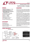 LT1167 Single Resistor Gain Programmable, Precision Instrumentation Amplifier U FEATURES ■ ■ ■ ■ ■ ■ ■ ■ ■ ■ ■ ■ ■ ■ DESCRIPTIO The LT ®1167 is a low power, precision instrumentation amplifier that requires only one external resistor to set gains of 1 to 10,000. The low voltage noise of 7.5nV/√Hz (at 1kHz) is not compromised by low power dissipation (0.9mA typical for ±2.3V to ±15V supplies). The part’s high accuracy (10ppm maximum nonlinearity, 0.08% max gain error (G = 10)) is not degraded even for load resistors as low as 2k (previous monolithic instrumentation amps used 10k for their nonlinearity specifications). The LT1167 is laser trimmed for very low input offset voltage (40µV max), drift (0.3µV/°C), high CMRR (90dB, G = 1) and PSRR (105dB, G = 1). Low input bias currents of 350pA max are achieved with the use of superbeta processing. The output can handle capacitive loads up to 1000pF in any gain configuration while the inputs are ESD protected up to 13kV (human body). The LT1167 with two external 5k resistors passes the IEC 1000-4-2 level 4 specification. The LT1167, offered in 8-pin PDIP and SO packages, requires significantly less PC board area than discrete multi op amp and resistor designs. These advantages make the LT1167 the most cost effective solution for precision instrumentation amplifier applications. Single Gain Set Resistor: G = 1 to 10,000 Gain Error: G = 10, 0.08% Max Input Offset Voltage Drift: 0.3µV/°C Max Meets IEC 1000-4-2 Level 4 ESD Tests with Two External 5k Resistors Gain Nonlinearity: G = 10, 10ppm Max Input Offset Voltage: G = 10, 60µV Max Input Bias Current: 350pA Max PSRR at G = 1: 105dB Min CMRR at G = 1: 90dB Min Supply Current: 1.3mA Max Wide Supply Range: ±2.3V to ±18V 1kHz Voltage Noise: 7.5nV/√Hz 0.1Hz to 10Hz Noise: 0.28µVP-P Available in 8-Pin PDIP and SO Packages U APPLICATIO S ■ ■ ■ ■ ■ Bridge Amplifiers Strain Gauge Amplifiers Thermocouple Amplifiers Differential to Single-Ended Converters Medical Instrumentation , LTC and LT are registered trademarks of Linear Technology Corporation. U TYPICAL APPLICATIO Single Supply Barometer VS Gain Nonlinearity 3 2 LT1634CCZ-1.25 2 8 + 1/2 LT1490 1 LUCAS NOVA SENOR NPC-1220-015-A-3L – 4 1 – 4 5k R6 1k 5 6 R8 100k 5k 2 + – 7 R2 12Ω 5k + 3 6 LT1167 G = 60 8 3 5 TO 4-DIGIT DVM + 4 5 1/2 LT1490 – 2 1 R1 825Ω RSET R3 50k 1 5k 6 OFFSET R4 ADJUST 50k VS NONLINEARITY (100ppm/DIV) R5 392k 7 R7 50k 0.2% ACCURACY AT 25°C 1.2% ACCURACY AT 0°C TO 60°C VS = 8V TO 30V VOLTS 2.800 3.000 3.200 INCHES Hg 28.00 30.00 32.00 1167 TA02 1167 TA01 G = 1000 RL = 1k VOUT = ±10V OUTPUT VOLTAGE (2V/DIV) 1 LT1167 W W W AXI U U ABSOLUTE RATI GS U U W PACKAGE/ORDER I FOR ATIO (Note 1) Supply Voltage ...................................................... ±20V Differential Input Voltage (Within the Supply Voltage) ..................................................... ±40V Input Voltage (Equal to Supply Voltage) ................ ±20V Input Current (Note 3) ........................................ ±20mA Output Short-Circuit Duration .......................... Indefinite Operating Temperature Range ................ – 40°C to 85°C Specified Temperature Range LT1167AC/LT1167C (Note 4) .................. 0°C to 70°C LT1167AI/LT1167I ............................. – 40°C to 85°C Storage Temperature Range ................. – 65°C to 150°C Lead Temperature (Soldering, 10 sec).................. 300°C ORDER PART NUMBER TOP VIEW RG 1 8 RG –IN 2 – 7 +VS +IN 3 + 6 OUTPUT 5 REF –VS 4 LT1167ACN8 LT1167ACS8 LT1167AIN8 LT1167AIS8 LT1167CN8 LT1167CS8 LT1167IN8 LT1167IS8 N8 PACKAGE 8-LEAD PDIP S8 PACKAGE 8-LEAD PLASTIC SO TJMAX = 150°C, θJA = 130°C/ W (N8) TJMAX = 150°C, θJA = 190°C/ W (S8) S8 PART MARKING 1167A 1167AI 1167 1167I Consult factory for parts specified with wider operating temperature ranges. ELECTRICAL CHARACTERISTICS VS = ±15V, VCM = 0V, TA = 25°C, R L = 2k, unless otherwise noted. SYMBOL PARAMETER CONDITIONS (Note 7) G Gain Range G = 1 + (49.4k/RG) Gain Error G=1 G = 10 (Note 2) G = 100 (Note 2) G = 1000 (Note 2) Gain Nonlinearity (Note 5) LT1167AC/LT1167AI MIN TYP MAX 1 10k LT1167C/LT1167I MIN TYP MAX 1 UNITS 10k 0.008 0.010 0.025 0.040 0.02 0.08 0.08 0.10 0.015 0.020 0.030 0.040 0.03 0.10 0.10 0.10 % % % % VO = ±10V, G = 1 VO = ±10V, G = 10 and 100 VO = ±10V, G = 1000 1 2 15 6 10 40 1.5 3 20 10 15 60 ppm ppm ppm VO = ±10V, G = 1, RL = 600 VO = ±10V, G = 10 and 100, RL = 600 VO = ±10V, G = 1000, RL = 600 5 6 12 15 6 7 15 20 ppm ppm 20 65 25 80 ppm VOST Total Input Referred Offset Voltage VOST = VOSI + VOSO/G VOSI Input Offset Voltage G = 1000, VS = ±5V to ±15V 15 40 20 60 µV VOSO Output Offset Voltage G = 1, VS = ±5V to ±15V 40 200 50 300 µV IOS Input Offset Current 90 320 100 450 pA IB Input Bias Current 50 350 80 500 pA en Input Noise Voltage (Note 8) µVP-P µVP-P µVP-P 0.1Hz to 10Hz, G = 1 0.1Hz to 10Hz, G = 10 0.1Hz to 10Hz, G = 100 and 1000 2.00 0.50 0.28 2.00 0.50 0.28 fO = 1kHz 7.5 12 7.5 12 nV/√Hz 67 90 67 90 nV/√Hz Total RTI Noise = √eni 2 + (eno /G)2 (Note 8) eni Input Noise Voltage Density (Note 8) eno Output Noise Voltage Density (Note 8) fO = 1kHz (Note 3) 2 LT1167 ELECTRICAL CHARACTERISTICS VS = ±15V, VCM = 0V, TA = 25°C, RL = 2k, unless otherwise noted. LT1167AC/LT1167AI MIN TYP MAX LT1167C/LT1167I MIN TYP MAX UNITS fO = 0.1Hz to 10Hz 10 10 pAP-P Input Noise Current Density fO = 10Hz 124 124 fA/√Hz RIN Input Resistance VIN = ±10V 1000 GΩ CIN(DIFF) Differential Input Capacitance fO = 100kHz 1.6 1.6 pF CIN(CM) Common Mode Input Capacitance fO = 100kHz 1.6 1.6 pF VCM Input Voltage Range G = 1, Other Input Grounded VS = ±2.3V to ±5V VS = ±5V to ±18V SYMBOL PARAMETER CONDITIONS (Note 7) in Input Noise Current CMRR 1000 – VS + 1.9 – VS + 1.9 200 + VS – 1.2 – VS + 1.9 + VS – 1.4 – VS + 1.9 + VS – 1.2 + VS – 1.4 V V 1k Source Imbalance, VCM = 0V to ±10V G=1 G = 10 G = 100 G = 1000 90 1