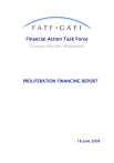 Financial Action Task Force Groupe d'action financière PROLIFERATION FINANCING REPORT 18 June 2008 © FATF/OECD 2008 All rights reserved. No reproduction, copy, transmission or translation of this publication may be made without written permission. Applications for permission to reproduce all or part of this publication should be made to: FATF Secretariat, OECD, 2 rue André Pascal 75775 Paris Cedex 16, France TABLE OF CONTENTS INTRODUCTION ................................................................................................................................... 1 1. ASSESSING THE THREAT OF PROLIFERATION FINANCING ................................................................. 2 2. WITTING AND UNWITTING ACTORS................................................................................................... 9 3. CASE STUDIES ................................................................................................................................. 24 4. COUNTER PROLIFERATION PURSUANT TO S/RES/1540 (2004) ....................................................... 43 5. KEY FINDINGS ON THE IMPLEMENTATION OF S/RES/1540 (2004).................................................. 44 6. ISSUES FOR CONSIDERATION ........................................................................................................... 47 7. BIBLIOGRAPHY ................................................................................................................................ 51 ANNEX 1: ELEMENTS THAT MAY INDICATE PROLIFERATION FINANCING..................... 53 ANNEX 2: THE COMPLEXITY OF PROCUREMENT NETWORKS OVER TIME ..................... 55 ANNEX 3: ADDITIONAL CASES OF PROLIFERATION .............................................................. 57 ANNEX 4: RELEVANT CONVENTIONS AND INITIATIVES ...................................................... 63 ANNEX 5: ELEMENTS OF EXPORT CONTROL SYSTEMS ........................................................ 67 ANNEX 6: EFFECTIVE BORDER AND EXPORT ENFORCEMENT............................................ 68 ANNEX 7: INFORMATION CONTAINED IN A LETTER OF CREDIT ........................................ 69 INTRODUCTION 1. The Proliferation Finance Typology Project develops an understanding of the issues surrounding proliferation financing and provides information that can be used by the FATF to assess the need for policy measures to counter proliferation financing. 2. Pursuant to the FATF’s Guidance of 29 June 2007, “Further study of broad-based measures to combat WMD proliferation finance under United Nations Security Council Resolution 1540 (2004) “S/RES/1540 (2004)”, the project identifies and analyses the existing threat of proliferation financing; examines existing measures used to counter this threat; and outlines a series of options that could be considered by the FATF to counter proliferation financing, within the framework of existing S/RES/1540 (2004) and S/RES/1673 (2006). There are financial provisions within paragraphs 2 and 3(d) of S/RES/1540 (2004)’s mandatory Chapter VII obligations that merit further examination by the FATF. 2. Decides also that all States, in accordance with their national procedures, shall adopt and enforce appropriate effective laws which prohibit any non-State actor to manufacture, acquire, possess, develop, transport, transfer or use nuclear, chemical or biological weapons and their means of delivery, in particular for terrorist purposes, as well as attempts to engage in any of the foregoing activities, participate in them as an accomplice, assist or finance them; 3. Decides also that all States shall take and enforce effective measures to establish domestic controls to prevent the proliferation of nuclear, chemical, or biological weapons and their means of delivery, including by establishing appropriate controls over related materials and to this end shall: (d) Establish, develop, review and maintain appropriate effective national export and trans-shipment controls over such items, including appropriate laws and regulations to control export, transit, transshipment and re-export and controls on providing funds and services relate to such export and transshipment such as financing, and transporting that would contribute to proliferation, as well as establishing end-user controls; and establishing and enforcing appropriate criminal or civil penalties for violations of such export control laws and regulations; S/RES/1540 (2004) defines a non-state actor as an “individual or entity, not acting under the lawful authority of any State in conducting activities which come within the scope of this resolution.” S/RES/1673 (2006) reiterates the requirements of S/RES/1540 (2004) and emphasizes the importance for all jurisdictions to implement fully that resolution, including provisions regarding the financing of WMD proliferation. The FATF, while taking into consideration the work of the United Nations 1540 Committee, will conduct further study to: (a) identify the threat of the financing of WMD proliferation; (b) analyse the effectiveness of existing measures to counter the threat of the financing of WMD proliferation, and (c) identify measures (e.g. criminalisation measures, broader sanctions, activity-based financial prohibitions or controls or examining the use of financial intelligence) that could be considered in combating WMD proliferation finance within the framework of existing UNSCRs, such as S/RES/1540 (2004). 1 3. This report has incorporated, inter alia, the following into its analysis: 1) jurisdictions’ responses to the Proliferation Financing Questionnaire; and 2) the findings of the November 2007 Joint FATF / APG Experts’ Meeting on Money Laundering and Terrorist Financing Typologies. The report has also benefited from the discussions that took place at the May (Ottawa) and September (Rome) 2007 WGTM Intersessional Meetings. The Project Team 1 has had opportunities to discuss proliferation financing 