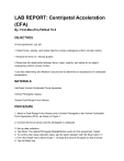 LAB REPORT: Centripetal Acceleration (CFA) By: First,Max,Pim,PatGail 10­2 OBJECTIVES In this experiment, you will • Collect force, velocity, and radius data for a mass undergoing uniform circular motion. • Analyze the force vs. velocity graphs. • Determine the relationship between force, mass, velocity, and radius for an object undergoing uniform circular motion. • Use this relationship and Newton’s second law to determine an expression for centripetal acceleration. MATERIALS LabQuest Vernier Centripetal Force Apparatus Vernier Photogate masses Vernier Dual­Range Force Sensor PROCEDURE 1. Attach a Dual­Range Force Sensor and a Vernier Photogate to the Vernier Centripetal Force Apparatus (CFA), as shown in Figure 1. 2. Connect the force sensor and the photogate to LabQuest. 3. Set up data collection. a. Tap Mode. The default Photogate Mode►Motion works for this experiment. Select b. To control when data collection stops, tap the option labeled “with the Stop button” in c. From the Graph menu select Graph 1. Change the axes of the graph so that it shows d. Tap the Meter tab. 4. Determine the mass of the sliding mass carriage. Add mass to both the sliding and fixed mass carriages as directed by your instructor. The mass of the sliding and fixed carriages should be the same so that the beam is balanced. Record the total mass of the sliding carriage and extra mass. 5. Position the fixed carriage so that its center is 10 cm from the axis of rotation. Adjust the position of the force sensor on the rail so that, when the line is tensed, the center of the sliding mass carriage is also at 10 cm. 6. Zero the force sensor. 7. Spin the beam by twisting the knurled spindle of the CFA with your fingers. When the force reaches 3–4 N, begin collecting data. Let data collection continue for 20‑40 s. When you stop data collection, use the friction between your hand and the knurled spindle to stop the beam. 8. If your graph of force vs. velocity is not linear, create a “calculated column” that will enable you to obtain a linear graph (linearized graph F vs. v2 the User defined button. The distance to be entered is 1/10 of the circumference of the mass path. Because the radius in part 1 is 10 cm, this value should be 0.0628 m. the field labeled “End data collection.” Tap OK. force vs. velocity.). Your instructor will explain step by step how to do this if you cannot do it by yourself. PART 2 – INVESTIGATING THE EFFECT OF MASS AND RADIUS When a quantity (in this case, force) is a function of more than one variable, it is usually the case that the slope of the graph is related to the parameters held constant during the experiment. Examine the units of the slope of your graph of F vs. v and radius that has the same units as that of your slope. Substitute the known values of these parameters; how closely does the value of this expression agree with that of your slope? Predict the effect of doubling the mass on the value of the slope. What effect would doubling the radius have on the slope? You can test your conclusions by varying first the mass and then the radius as follows. PROCEDURE 1. Change the mass on both the fixed and sliding carriages and record the value of the total mass of the sliding carriage and any extra masses. 2. Re­zero the force sensor, then spin the beam as you did before. Once the force reaches 5–8 N, begin collecting data. When you stop data collection, stop the beam as you did in Part 1. 3. Change the system mass again and record the value of the total mass of the sliding carriage and any extra masses, then repeat Step 2. 4. Return the mass on both the fixed and sliding carriages to the original value used in Part 1. Decrease the radius of both the sliding and fixed mass carriage by 2­3 cm. Record the value of the radius. Adjust the value of the User defined distance in the Mode window so that it is 1/10 of the circular path of the mass carriage. A warning will appear. Choose to discard the data. 5. Re­zero the force sensor, then spin the beam as you did before. Once the force reaches 5–8 N, begin collecting data. When you stop data collection, stop the beam. 6. Now, change the radius so that it is 2–3 cm greater than your initial value. Be sure to adjust the User defined distance as you did in Step 5. Record the value of the radius, then repeat Step 6 and 7. 7. Repeat step 8 of last section to linearize your last plots. Again, create a calculated column for v2. Use this calculated column to plot F vs. v2 Result The Graph are show the circularmotion experiment ­First Graph at the bottom use 100 gram on both side at the radius 10 cm. ­Second Graph at the middle use 200 gram on both side at the radius 10 cm. ­Third Graph at the top use 300 gram on both side at the radius 10 cm. Analysis: As the result from the experiment, graph 1 had the most acceleration however, it had the least mass among the 3 runs. The 2nd graph show the decreasing of acceleration, the reason is because we add more mass to both side of the spinner into 200g. The result was, the spinner contains more force than the first one. We can concluded that the more mass the spinner contain, the less acceleration are provided. According to the formula of centripetal force F=mv^2 / r, if we introduced more mass and velocity into the equation, the force is therefore getting bigger. On the opposite side, if we increase the radius: the force however get smaller due to the formular. According to the Second Law’s of Newton, the more mass object have, the accerelation had to be small to balance each other. The 3rd graph had the least acceleration. On the otherside it provided the most force(n) on the y­axis but contain least velocity x­axis. Conclusion: In conclusion, to investigate the centripical acceleration by using the formula of centripetal force F=mv^2 / r for supporting our evidence. At first, while the experinment take place we can recognize that we had to spend more force on spin