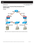 CCNA Security Chapter 9 Lab A: Security Policy Development and Implementation Topology Note: ISR G2 devices have Gigabit Ethernet interfaces instead of Fast Ethernet Interfaces. All contents are Copyright © 1992–2012 Cisco Systems, Inc. All rights reserved. This document is Cisco Public Information. Page 1 of 30 CCNA Security IP Addressing Table Device R1 Interface FA0/1 IP Address 192.168.1.1 Subnet Mask 255.255.255.0 Default Gateway N/A Switch Port S1 FA0/5 S0/0/0 (DCE) 10.1.1.1 255.255.255.252 N/A N/A S0/0/0 10.1.1.2 255.255.255.252 N/A N/A S0/0/1 (DCE) 10.2.2.2 255.255.255.252 N/A N/A FA0/1 192.168.3.1 255.255.255.0 N/A S3 FA0/5 S0/0/1 10.2.2.1 255.255.255.252 N/A N/A S1 VLAN 1 192.168.1.11 255.255.255.0 192.168.1.1 N/A S2 VLAN 1 192.168.1.12 255.255.255.0 192.168.1.1 N/A S3 VLAN 1 192.168.3.11 255.255.255.0 192.168.3.1 N/A PC-A NIC 192.168.1.3 255.255.255.0 192.168.1.1 S1 FA0/6 PC-B NIC 192.168.1.2 255.255.255.0 192.168.1.1 S2 FA0/18 PC-C NIC 192.168.3.3 255.255.255.0 192.168.3.1 S3 FA0/18 R2 R3 Objectives Part 1: Create a Basic Security Policy Use Cisco Security Policy Builder to create a policy. Develop a network device configuration policy. Part 2: Basic Network Device Configuration Configure hostnames, interface IP addresses, and passwords. Configure static routing. Part 3: Secure Network Routers Configure passwords and a login banner. Configure SSH access and disable Telnet. Configure HTTP secure server access. Configure a synchronized time source using NTP. Configure router syslog support. Configure centralized authentication using AAA and RADIUS. Use Cisco IOS to disable unneeded services and secure against login attacks. Use CCP to disable unneeded services. Configure a CBAC firewall. Configure a ZBF firewall. Configure intrusion prevention system (IPS) using Cisco IOS and CCP. Back up and secure the Cisco IOS image and configuration files. Part 4: Secure Network Switches Configure passwords, and a login banner. All contents are Copyright © 1992–2012 Cisco Systems, Inc. All rights reserved. This document is Cisco Public Information. Page 2 of 30 CCNA Security Configure management VLAN access. Configure a synchronized time source using NTP. Configure syslog support. Configure SSH access. Configure AAA and RADIUS. Secure trunk ports. Secure access ports. Protect against STP attacks. Configure port security and disable unused ports. Part 5: Configure VPN remote access Use CCP to configure Easy VPN Server. Use the Cisco VPN Client to test the remote access VPN. Background A comprehensive security policy covers three main areas: governing policies, end-user policies, and technical policies. Technical policies can include e-mail, remote access, telephony, applications, and network policies, such as device access controls and logging. The focus of this lab is technical network policies and security measures that can be configured for network devices. In Part 1 of this lab, you use the Cisco Security Policy Builder tool to create a basic security policy. You customize the policy by changing the generic names in the document to a company name of your choice. You also develop a Network Device Security Guidelines document as a supplement to the basic security policy. This document addresses specific router and switch security measures and describes the security requirements to be implemented on the infrastructure equipment. The basic Security Policy and the Network Device Security Guidelines are presented to your instructor for review prior to starting Part 2 of the lab. In Part 2, you build the network and configure basic device settings. In Parts 3 and 4, you secure routers and switches. In Part 5, you configure a router for VPN remote access. The Network Device Security Guidelines policy is used as the guiding document. The fictitious company you are working for has two locations connected by an ISP. Router R1 represents a remote site, and R3 represents the corporate headquarters. Router R2 represents the ISP. Note: The router commands and output in this lab are from a Cisco 1841 with Cisco IOS Release 12.4(20)T (Advanced IP image). The switch commands and output are from a Cisco WS-C2960-24TT-L with Cisco IOS Release 12.2(46)SE (C2960-LANBASEK9-M image). Other routers, switches, and Cisco IOS versions can be used. See the Router Interface Summary table at the end of the lab to determine which interface identifiers to use based on the equipment in the lab. Depending on the router or switch model and Cisco IOS version, the commands available and output produced might vary from what is shown in this lab. Note: Make sure that the routers and switches have been erased and have no startup configurations. Required Resources 2 routers (Cisco 1841 with Cisco IOS Release 12.4(20)T1 Advanced IP Service or comparable) 1 router (Cisco 1841 with Cisco IOS Release 12.4(20)T1 IP Base or comparable) 3 switches (Cisco 2960 with Cisco IOS Release 12.2(46)SE C2960-LANBASEK9-M image or comparable) PC-A: Windows XP, Vista, or Windows 7 with CCP 2.5, RADIUS, TFTP, and syslog servers plus PuTTY and Cisco VPN Client software available All contents are Copyright © 1992–2012 Cisco Systems, Inc. All rights reserved. This document is Cisco Public Information. Page 3 of 30 CCNA Security PC-B: Windows XP, Vista, or Windows 7 PC-C: Windows XP, Vista, or Windows 7 with CCP 2.5, RADIUS, TFTP, and syslog servers plus PuTTY software available and SuperScan (optional) Serial and Ethernet cables as shown in the topology Rollover cables to configure the routers via the console CCP Notes: Refer to Chp 00 Lab A for instructions on how to install and run CCP. Hardware/software recommendations for CCP include Windows XP, Vista, or Windows 7 with Java version 1.6.0_11 up to 1.6.0_21, Internet Explorer 6.0 or above and Flash Player Version 10.0.12.36 and later. If the PC on which CCP is installed is running Windows Vista or Windows 7, it may be necessary to right-click on the CCP icon or menu item, and choose Run as 