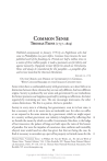 COMMON SENSE 99 Common Sense Thomas Paine (1737–1809) Published anonymously in January 1776 by an Englishman who had come to Philadelphia two years before, Common Sense became the most published work of the founding era. Printed over half a million times in a nation of three million people, it made a passionate case for liberty and against monarchy. Unpopular in later life for his attacks on Christianity, Paine will always be remembered for this pamphlet—a pamphlet often said to have launched the American Revolution. January 10, 1776 On the Origin and Design of Government in General, With Concise Remarks on the English Constitution Some writers have so confounded society with government, as to leave little or no distinction between them; whereas they are not only different, but have different origins. Society is produced by our wants and government by our wickedness; the former promotes our happiness positively by uniting our affections, the latter negatively by restraining our vices. The one encourages intercourse, the other creates distinctions. The first is a patron, the last a punisher. 5 Society in every state is a blessing, but government, even in its best state, is but a necessary evil; in its worst state an intolerable one: for when we suffer, or are exposed to the same miseries by a government, which we might expect in a country without government, our calamity is heightened by reflecting that 10 we furnish the means by which we suffer. Government, like dress, is the badge of lost innocence; the palaces of kings are built upon the ruins of the bowers of paradise. For were the impulses of conscience clear, uniform and irresistibly obeyed, man would need no other law-giver; but that not being the case, he finds it necessary to surrender up a part of his property to furnish means for the 15 ______________________ Thomas Paine, “Common Sense,” in William M. Van der Weyde, ed., The Life and Works of Thomas Paine, “Patriot’s Edition,” Vol. 2 (New Rochelle, NY: Thomas Paine National Historical Association, 1925), 97–110, 114–22. Thomas Paine National Historical Association, New Rochelle, NY. www.thomaspaine.org. 99 100 5 NATURAL RIGHTS AND THE AMERICAN REVOLUTION protection of the rest; and this he is induced to do by the same prudence which in every other case advises him, out of two evils to choose the least. Wherefore, security being the true design and end of government, it unanswerably follows that whatever form thereof appears most likely to ensure it to us, with the least expense and greatest benefit, is preferable to all others. In order to gain a clear and just idea of the design and end of government, let us suppose a small number of persons settled in some sequestered part of the earth, unconnected with the rest; they will then represent the first peopling of any country, or of the world. In this state of natural liberty, society will be their 10 first thought. A thousand motives will excite them thereto; the strength of one man is so unequal to his wants, and his mind so unfitted for perpetual solitude, that he is soon obliged to seek assistance and relief of another, who in his turn requires the same. Four or five united would be able to raise a tolerable dwelling in the midst of a wilderness, but one man might labor out the common period 15 of life without accomplishing any thing; when he had felled his timber he could not remove it, nor erect it after it was removed; hunger in the mean time would urge him to quit his work, and every different want would call him a different way. Disease, nay even misfortune, would be death; for though neither might be mortal, yet either would disable him from living, and reduce him to a state 20 in which he might rather be said to perish than to die. Thus necessity, like a gravitating power, would soon form our newly arrived emigrants into society, the reciprocal blessings of which would supercede, and render the obligations of law and government unnecessary while they remained perfectly just to each other; but as nothing but Heaven is impregnable to vice, it 25 will unavoidably happen that in proportion as they surmount the first difficulties of emigration, which bound them together in a common cause, they will begin to relax in their duty and attachment to each other; and this remissness will point out the necessity of establishing some form of government to supply the defect of moral virtue. 30 Some convenient tree will afford them a State House, under the branches of which the whole colony may assemble to deliberate on public matters. It is more than probable that their first laws will have the title only of regulations and be enforced by no other penalty than public disesteem. In this first parliament every man by natural right will have a seat. 35 But as the colony increases, the public concerns will increase likewise, and the distance at which the members may be separated, will render it too inconvenient for all of them to meet on every occasion as at first, when their number was small, their habitations near, and the public concerns few and COMMON SENSE 101 trifling. This will point out the convenience of their consenting to leave the legislative part to be managed by a select number chosen from the whole body, who are supposed to have the same concerns at stake which those have who appointed them, and who will act in the same manner as the whole body would act were they present. If the colony continue increasing, it will become 5 necessary to augment the number of representatives, and that the interest of every part of the colony may be attended to, it will be found best to divide the whole into convenient parts, each part sending its proper number: and that the elected might never form to themselves an interest separate from the electors, prudence will point out the propriety of having elections often: 10 because as the elected might by that means return and mix again with the general body of the electors in a