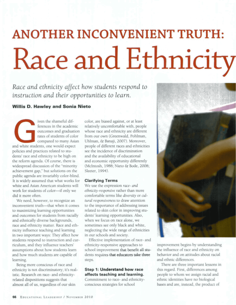 ANOTHER INCONVENIENT TRUTH: Race and Ethnicity Race and ethnicity affect how students respond to instruction and their opportunities to learn. Willis D. Hawley and Sonia Nieto Given ferences in the academic outcomes and graduation rates of students of color the shameful to manydifAsian compared and white students, one would expect policies and practices related to students' race and ethnicity to be high on the reform agenda. Of course, there is widespread discussion of the "minority achievement gap," but solutions on the public agenda are invariably color-blind. It is widely assumed that what works for white and Asian American students will work for students of color-if only we did it more often. We need, however, to recognize an inconvenient truth-that when it comes to maximizing learning opportunities and outcomes for students from racially and ethnically diverse backgrounds, race and ethnicity matter. Race and ethnicity influence teaching and learning in two important ways: They affect how students respond to instruction and curriculum, and they influence teachers' assumptions about how students learn and how much students are capable of learning. Being more conscious of race and ethnicity is not discriminatory; it's realistic. Research on race- and ethnicityrelated dispositions suggests that almost all of us, regardless of our skin 66 EDUCATIONAL LEADERSHIP / NOVEMBER color, are biased against, or at least relatively uncomfortable with, people whose race and ethnicity are different from our own (Greenwald, Pohlman, Uhlman, & Banaji, 2007). Moreover, people of different races and ethnicities see the incidence of discrimination and the availability of educational and economic opportunity differently (McIntosh, 1988; Nieto & Bode, 2008; Sleeter, 1994). Clarifying Terms We use the expression race- and ethnicity-responsive rather than more comfortable terms like diversity or cultural responsiveness to draw attention to the importance of addressing issues related to skin color in improving students' learning opportunities. Also, when we focus on race alone, we sometimes see only black and white, neglecting the wide range of ethnicities in our schools and society. Effective implementation of race- and ethnicity-responsive approaches to school improvement that benefit all students requires that educators take three steps. Step 1: Understand how race affects teaching and learning. Commitment to race- and ethnicityconscious strategies for school 2010 improvement begins by understanding the influence of race and ethnicity on behavior and on attitudes about racial and ethnic differences. There are three important lessons in this regard. First, differences among people to whom we assign racial and ethnic identities have no biological bases and are, instead, the product of Matter Finally, despite progress in race relations, many people of color see their opportunities as limited and fear they will experience discrimination. Given years of neglect and discrimination in public education, these perceptions are neither surprising nor unwarranted. Nevertheless, communities of color have, in general, great faith that education is their best hope for improving their children's life chances. socially constructed beliefs. When these beliefs disadvantage one group more than another, we can change them through social action. For example, one study found that teachers who became active in antiracist projects broadened their understanding and were able to use their new skills in creating affirming learning environments for all their students (Donaldson, 2001). Second, most of us are not fully aware of our dispositions toward people of races and ethnicities different from our own (Ayres, 2001). Thus, we do not understand how others see our behavior or the extent to which latent beliefs shape our actions. Learning how to question our beliefs is essential. Examining Some Common Nonproductive Beliefs This first step involves looking at some common beliefs about teaching and learning that often undermine students' opportunities to learn but which we sustain because they seem sensible and are, in many cases, well-meaning. mTo be fair to all students, one should be color-blind and ignore racial differences. To acknowledge that focusing on students' race or ethnicity affects how one should teach is to acknowledge that racial and ethnic discrimination has been, and continues to be, a significant influence on what and how students learn. This is not a comforting thought in a nation whose public stance is one of equity and fairness for all. Indeed, it is quite common to hear educators say that they are color-blind, as though this were a positive value. Although color-blindness is a good thing when it means that people do not discriminate on the basis of race, it can have negative consequences when educators refuse to see their students' racial, ethnic, cultural, and linguistic differences. Instead, teachers need to respect and build on ASCD / WWW.ASCD.ORG 67 differences to foster student learning. w One can build student self-esteem by reducing academic rigor. This particularly harmful belief leads to lowered expectations and, inevitably, to lower academic outcomes. Compelling evidence shows that when teachers hold high expectations for students who have been marginalized by their schooling experiences, student learning is enhanced, as long as high expectations are linked to greater resources and support (Ferguson, 2004). Without appropriate support in place, the often-stated "all students can learn" is an empty slogan. (2006) shows that while the students were learning to read, write, add, and subtract, they were also having conversations about philosophy, learning about the civil rights movement, and even engaging in a successful voter registration drive-activities that not only are cognitively demanding but that also make the curriculum more pluralistic and engaging. Step 2: Use race- and ethnicityresponsive teaching 
