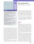48 Hip and Knee Pain JAMES I. HUDDLESTON • STUART GOODMAN KEY POINTS The clinician should be able to narrow the differential diagnosis of hip or knee pain down to two to three diagnoses after the history and physical examination. Imaging studies should be used to confirm the diagnosis. Conventional radiographs should usually be the initial imaging study ordered. Many of the vital structures in the knee can be palpated easily or examined with provocative tests. A knee effusion is often associated with internal derangement. The clinician should suspect a torn meniscus if a patient has an effusion, joint line tenderness, and pain with hyperextension and hyperflexion. envelope around the knee and the fact that knee pain is rarely referred, the pain generators around the knee can often be elucidated with a complete history and thorough physical examination. Diagnosis of hip pain may be more challenging because the joint is deeper and the region is not infrequently the site of referred pain from the spine. An understanding of the basic biomechanics of these joints is also important in formulating a differential diagnosis because certain activities are likely to cause specific injuries. This chapter focuses on the important aspects of the history, physical examination, and imaging modalities involved in evaluating patients with complaints of knee and hip pain. An appropriate, thorough workup of these patients will allow the clinician to formulate an accurate differential diagnosis in an efficient manner. Patients with osteoarthritis often complain of stiffness and pain with activity. Inflammatory arthritis should be considered when a patient continues to experience pain despite resting the joint. Groin pain with internal rotation of the hip is due to hip pathology until proven otherwise. Concurrent hip and lumbosacral pathology is common. It is estimated that musculoskeletal pain affects one-third to one-half of the general population.1,2 Disease is occurring as the baby boomers have reached middle age and beyond. This is exemplified by the increasing prevalence of hip and knee replacement operations, which rose by 16.2% to 884,400 procedures annually in the United States between 2002 and 2004.3 Furthermore, the prevalence of total knee and total hip arthroplasty is expected to double by 2016 and 2026, respectively.4 The hip and knee joints are two of the most commonly affected sites of musculoskeletal pain, with the prevalence of hip pain ranging from 8% to 30% in persons 60 years of age and older5,6 and the prevalence of knee pain ranging from 20% to 52% in persons 55 years of age or older. In general, women experience more musculoskeletal pain than men.7 There are also geographic and ethnic variations in the rates of both hip and knee pain. For example, there tends to be significantly less hip and knee pain with decreasing latitude, as well as significantly less hip pain and osteoarthritis in China than in the United States.8-15 When evaluating complaints of knee or hip pain, knowledge of the anatomy of these joints is necessary for formulating a differential diagnosis. Given the thin soft tissue KNEE PAIN History A detailed history is perhaps the most important step in accurately diagnosing the cause of knee pain. Knee complaints generally fall into two broad categories, pain or instability. Pain may arise from injury to the articular surfaces (e.g., osteoarthritis, inflammatory arthritis, osteochondral defects, osteochondritis dissecans), torn menisci, quadriceps and patella tendon tears, bursitis, nerve damage, fractures, neoplasia, or infection. Referred pain from the hip or spine is less common. Instability is usually episodic and stems from injuries to the quadriceps-patellar extensor mechanism, collateral ligaments, or cruciate ligaments. It is important to distinguish true instability from the common complaint of “giving way” because the latter is usually due to a robust pain response rather than specific structural pathology. Patients in certain age groups tend to experience similar injuries. In patients younger than 40 years, ligament injuries, acute meniscus tears, and patellofemoral problems are frequently encountered. In contrast, degenerative conditions such as osteoarthritis and degenerative meniscal lesions tend to occur more frequently in older patients. The location and character of the pain are particularly important when evaluating knee pain because many of the structures vital to proper knee function are subcutaneous and can be palpated easily. We prefer to conceptualize the knee as three separate compartments—medial, lateral, and patellofemoral. Each compartment should be examined separately. The patient should be able to point to the exact area where the pain is most severe. The onset of the pain 683 684 PART 6 | DIFFERENTIAL DIAGNOSIS OF REGIONAL AND DIFFUSE MUSCULOSKELETAL PAIN should be determined. Osteoarthritis and inflammatory arthritis tend to have an insidious onset, whereas injuries to menisci and ligaments are usually associated with a traumatic event. Knowing the details of a traumatic event will be helpful. For example, a twisting injury, especially one sustained with a flexed knee, suggests a meniscus tear, whereas a noncontact knee injury associated with change of direction is more likely to produce a tear of the anterior cruciate ligament (ACL). Pain from degenerative arthritis tends to be associated with stiffness, is generally worse with ongoing activity during the day, and is exacerbated by exercise, stair climbing, getting up from a chair, getting in and out of a car, and so on. The presence or absence of knee swelling is an important part of the history because knee effusions (fluid in the knee joint) usually accompany internal derangement. An effusion may also be present with synovitis, osteoarthritis, inflammatory arthritis, fractures, infection, and neoplasm. Distinguishing among soft tissue swelling around the knee, synovial thickening, 