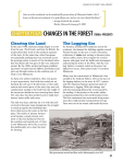 Changes in the Forest (1800s–present) How an active sentiment can be awakened for preservation of Minnesota timber I don’t know, as the present sentiment is to ‘grab all you can’ and no one cares about the future.” —George Goodrich, fire warden, Becker, Minnesota, January 13, 1896 Changes in the Forest (1800 –present) s Clearing the Land As these new settlers trickled in, they were quick to spot opportunity. And with their minds set on farming, the soil was it! In the forests of the southeastern and central parts of the state, they saw rich cropland just waiting to be freed from the weight of the enormous deciduous trees towering above them. Not only that, but they needed wood to build their houses, barns, mills, and towns. The task was clear, and they set to it with the radical resolve that gave many immigrants the strength to stand up against the hardships that drove them across the ocean in the first place. The trickle of pioneer farmers soon became a steady stream, and most of the rich deciduous forest in the southern and central part of what is now Minnesota fell to the ax and to fires deliberately set to clear the land for farming. The Logging Era As America stretched its boundaries across the continent, the demand for building supplies soared. Forests became, in the eyes of some visionaries, collections of timber just waiting to become joists, rafters, tables, chairs, drive tongues for covered wagons, and paper stock for leaflets and newspapers announcing the riches of the West. And the very best timber, it seemed, waited in the great, but difficult-to-access, white pine forests of northern Minnesota. Chapter Four In the early 1800s, dramatic change began to arrive from the east. The French, and later the British, fur traders plied their trade in the northern expanses of the state. At the same time, other Europeans were gradually pushing their way westward across the growing nation in search of the farmland riches they had been told were part of this vast, unknown terrain. By the 1840s, settlers had begun establishing farms on lands that the Ojibwe and Dakota had given up through treaties in the southern part of what is now Minnesota. Many view the construction of Minnesota’s first sawmill at St. Anthony Falls in 1821 as the start of the logging industry in the state. In 1837, t­ reaties with the American Indians opened up much of Minnesota to logging. With that change, and with the increasing demand for wood caused by the ­settling of the prairies to the south, timber ­companies pushed into the northern pine forests. The first commercial cuts were made along waterways that could provide transportation for logs. Trees were cut in the winter and hauled by horse Minnesota Historical Society­—Photographer: Benjamin Franklin Upton. Used with permission. Chapter four Old government sawmill and flour mill in Minneapolis, circa 1857. 21 All About Minnesota’s Forests and Trees or oxen to the edge of streams. Then, when spring came, they were floated downstream in rivers to mills. Minnesota DNR From the time the first lumber was cut at Marine on St. Croix in 1839 to the last big log milled in the Virginia Rainy Lake Mill in Virginia in 1929, lumbering in Minnesota was big business. Timber barons amassed great wealth harvesting the vast stands of white and red pines. Minneapolis, Stillwater, and other towns along the St. Croix and Mississippi rivers became hubs of logging-related activity. By the 1930s, the major lumber companies operating in Minnesota’s north woods included General Logging, a Weyerhaeuser enterprise; International Lumber, Because the logs cut by the various timber companies were all mixed together, logs transported to market by river were branded like cattle by their owners so they could be sorted out at the mill. Timber is often measured in a unit called a board foot—the amount of wood in a board that is 1 inch thick, 12 inches long, and 12 inches wide or 144 cubic inches. A board foot is a volume measurement that foresters use to describe how much timber exists in a forest or at a pulp mill. The average pay for these workers was a dollar per day plus room and board. (For comparison, in 1890, one dollar could buy 10 pounds of flour, 2 pounds of round steak, 2 quarts of milk, and 20 pounds of potatoes.) Consequently, hundreds of Minnesota towns depended on logging for their economic existence. Immigrants, eager to start a new life in America, found themselves working the winter camps where labor was in short supply. Winter logging was a constant battle against the elements. Frozen ground was necessary to move the heavy logs with horses and oxen. Ice roads for sliding logs had to be built and maintained. Heavy snow, early thaws, and low spring water levels could jeopardize a winter’s work. These extreme ­conditions, combined with the rugged individualism of the woodsmen, gave rise to some rich lumberjack folklore. It was from these stories of great feats of strength, endurance, and ingenuity retold around the bunkhouse workstoves, that the legends of Paul Bunyan and his mighty Babe the Blue Ox grew. During the heyday of logging, 1890 to about 1930, tens of thousands of lumberjacks—men who felled huge trees with muscle, ax, and saw rather than by steam engine—toiled in the woods during frigid winters. Lumberjacks earned their livelihoods cutting trees, removing tree limbs, and moving logs on sleighs powered by teams of horse or oxen, from the woods to landings at the river’s edge. Thousands more worked on the river drives, moving the logs to hungry sawmills downstream. Though floating on rivers was usually efficient, sometimes logs would jam up and the river drivers would need to risk their lives using dynamite and muscle power to break the jam. In the meantime, 20,000 men worked from dawn to dusk cutting what some saw as endless white pine. 22 Hinkley Fire Museum. Used with permission. later International Paper; North Star, a division of