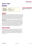 Teacher’s Guide Dracula Reading Level Genre/Length Language Register Content Load THE EXCHANGE QUESTION Lexile 290 Classic Fiction; 64 pages Literary, Simple Vampire Lore, Fantasy Does good always triumph over evil? Overview Background Dracula, by Bram Stoker, is considered by many to be the most wellknown novel about vampirism. Originally published in 1897, the novel was an instant success and catapulted vampires and vampire culture into popularity. Though some critics denounced it for being grotesque, the novel sold well and, to this date, has never gone out of print. Stoker’s Dracula has had an even larger impact in theater and film. Many theater productions and films have been produced that feature Stoker’s famous supernatural villain or a minor character from the original story. Book Summary The story follows Jonathan Harker, a young man who meets the infamous Count Dracula in the mysterious surroundings of Transylvania. Dracula tries to turn Harker into a vampire, but Harker escapes Castle Dracula and goes back to England with a plan to stop Dracula from spreading his evil. Dracula preys on Harker’s friends until the industrious Dr. Van Helsing hunts down the murderous Count and kills him. Stoker’s book was originally structured as a story that is told through diary entries and letters. Stephanie Spinner’s adaptation does not follow this form. Instead, she tells the story through a third-person narrator. Spinner’s adaptation allows a younger audience to enjoy Stoker’s frightening tale. About the Author Bram Stoker, the author of Dracula, was born in Dublin, Ireland in 1847. The third of seven children, Stoker was a sickly child who rarely left his bed. During his childhood, he was entertained by his mother’s frightening tales and was soon writing ghost stories of his own. After graduating from college, Stoker worked as a theater critic for the Dublin Mail. It was during this time that he began writing. Though much of Stoker’s work received favorable reviews, Dracula is by far his most successful. Teacher’s Guide page 1 of 14 © Hampton-Brown Dracula Student Journal, page 1 Reading the Book Name: There are several options for reading Dracula. They include: Student Journal • Whole Class Assign sections of the book and discussion dates using the planner on Student Journal, page 1. After students read a section and respond to the corresponding Student Journal pages, have a class discussion. At the end of the book, the class meets for The Exchange. Dracula by Bram Stoker Reading Schedule Group members: _____________________________________________________________ • Small Groups Read the book’s Introduction with the group. Group members then read an agreed-upon number of pages, complete the corresponding Student Journal pages, and meet to discuss. When they finish the book, they meet again for The Exchange. Use the planner on Student Journal, page 1 to establish meeting times. _____________________________________________________________________________ Dracula Student Journal Introduction Pages 2–4 Chapter 1 Pages 5–6 Chapters 2–4 Pages 7–8 Chapters 5–6 Pages 9–10 Chapters 7–8 Pages 11–12 Due Date Discussion Date The Exchange Assessment • Independently Students read the book on their own and then meet as a group for The Exchange. Use the planner on Student Journal, page 1 to establish the meeting time. • Guided Reading Have students read Student Journal, page 2 and monitor their discussion of the What If? scenario. Read aloud the book Introduction to give students background on the book. As students read, use the Before You Move On questions to guide comprehension. Use the Look Ahead to set a focus for reading the next set of pages. At the end of each section, assign the appropriate Student Journal pages. Discuss the pages before starting the next section. Establish a date for The Exchange and record it on the planner. Does good always triumph over evil? Student Journal, page 2 Dracula Getting Started What If? Getting Started You are playing in a championship basketball game. It’s the fourth quarter and the game is tied 56–56. There is one minute left to play. A player from the opposing team insults you by making a comment about your family. You ignore him, but he trips and yells, “Foul.” Have students read What If? on Student Journal, page 2 and discuss the scenario. Encourage students to describe the similarities and differences between the scenario and their lives and imagine how the situation would affect them. • Have students write their responses to the three questions below the scenario and compare answers with a partner or the group. The referee turns and sees the kid on the floor and your angry look. The player is allowed to try and make two baskets. The player makes both baskets, and your team loses. No matter how much you argue, the referee will not listen. Make notes about how this would affect you. • Would you continue to argue or take some other action? • Would this change your outlook on the fairness in life? • Would you react differently next time you were in this kind of situation? • Have students discuss how the situation might relate to The Exchange question and then write a brief summary of their discussion in the Student Journal. Connect to The Exchange Question Discuss how this situation could relate to The Exchange Question: Does good always triumph over evil? Summarize your discussion. Teacher’s Guide page 2 of 14 © Hampton-Brown Dracula Introduction Student Journal, page 3 Dracula Have students read the book’s Introduction. Check their comprehension with the three follow-up questions on Student Journal, page 3. Introduction Read the Introduction on pages 7–9 in Dracula. The Introduction will help you understand key concepts in the book. Knowing them will help you discuss and write about the book. The Introduction includes information about • the inspiration for the character of Dracula 