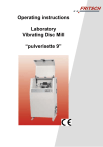 Operating instructions Laboratory Vibrating Disc Mill “pulverisette 9” Fritsch GmbH Manufacturers of Laboratory Instruments Industriestraße 8 D - 55743 Idar-Oberstein Phone: Fax: Email: URL: +49 (0)6784/ 70-0 +49 (0)6784/ 70-11 info@fritsch.de http://www.fritsch.de Fritsch GmbH, manufacturer of laboratory instruments was certified by the TÜV Zertifizierungsgemeinschaft e.V. on 21th November 2003. Based on an audit report Fritsch GmbH has been awarded the certificate of compliance to the requirements of DIN EN ISO 9001:2000 Pursuant to the enclosed declaration of conformity to guidelines specified for the laboratory vibrating disc mill “pulverisette 9”, we are authorised to mark the instrument with the CE symbol. Instrument number 09.4000.00 applies as of serial number 1001 Ausgabe 05/2004 Index 005 checked and released Table of contents Page 1 General Information / Introduction........................................ 1 1.1 1.2 1.3 Notes about Operating Instructions ...................................................... 1 Explanation of the symbols used on the machine and in the operating instructions ............................................................................................ 2 Brief description of the machine ........................................................... 3 1.3.1 1.3.2 Fields of application ......................................................................................... 3 Method of operation ......................................................................................... 3 1.4 Technical Data ...................................................................................... 4 2 Operating Safety..................................................................... 5 2.1 2.2 2.3 General Safety Instructions .................................................................. 5 Operators .............................................................................................. 6 Protective Devices ................................................................................ 6 2.3.1 2.3.2 Protective Devices ........................................................................................... 6 Ways to open the hood .................................................................................... 6 2.4 2.5 Danger Points ....................................................................................... 7 Electrical Safety .................................................................................... 7 2.5.1 2.5.2 2.5.3 General information ......................................................................................... 7 Protection against warm restart ....................................................................... 7 Overload protection ......................................................................................... 7 3 Installation .............................................................................. 8 3.1 3.2 3.3 3.4 3.5 Unpacking ............................................................................................. 8 Transport .............................................................................................. 8 Erection ................................................................................................. 8 Transportation Lock .............................................................................. 9 Electrical Connection .......................................................................... 10 4 Working with the vibrating disc mill ................................... 11 4.1 4.2 Function test ....................................................................................... 11 Preparing a grinding operation ........................................................... 11 4.2.1 4.2.2 4.2.3 4.2.4 4.2.5 4.2.6 4.2.7 4.2.8 Grinding sets.................................................................................................. 11 Using the grinding sets .................................................................................. 11 Dry Grinding ................................................................................................... 11 Wet Grinding (Grinding in Suspension) ......................................................... 12 Filling the grinding set .................................................................................... 12 Fixing the grinding sets .................................................................................. 13 Operating functions........................................................................................ 14 Rotational speed (rpm) .................................................................................. 15 4.3 4.4 4.5 4.6 Switching the vibrating disc mill on ..................................................... 16 Switching Off ....................................................................................... 16 Cooling ................................................................................................ 16 Cleaning .............................................................................................. 16 4.6.1 4.6.2 Grinding accessories ..................................................................................... 16 Mill ................................................................................................................. 16 5 6 7 Maintenance ......................................................................... 17 Warranty................................................................................ 17 Troubleshooting Checklist .................................................. 18 pulverisette 9 1 General Information / Introduction 1.1 Notes about Operating Instructions Read the operating instructions carefully. The laboratory vibrating disc mill “pulverisette 9“ has been referred to as vibrating disc mill below. All operators must be familiar with the contents of the operating instructions. Please foll