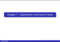 Chapter 7 - Depreciation and Income Taxes SEEM2440A/B 1 Depreciation Concepts and Terminology Taxes are important for engineering economic analysis because they represent significant cash outflow that may alter the final decision (decision to invest or not to invest, selection of the best alternative etc.). One important concept for tax calculations is “depreciation" which is the reduction in value of an asset (or a property) over time and usage. In the accounting terms, depreciation is defined as the allocation of an asset’s cost over its useful (or depreciable) life. It is important to notice that the depreciation is a noncash cost. Therefore, the depreciation does not a part of actual cash flow and is only used for tax calculation. SEEM2440A/B 2 Depreciation is not allowed for all properties. A depreciable property must: be used in business or produce income, have a determinable useful life, lose value over its useful life, not be inventory or investment. Classification of properties: Tangible (can be seen or touched) real property (land, buildings, manufacturing facilities, etc. ) personal property (machinery, vehicles, equipment, etc.) Intangible (patents, copyrights, trademarks, etc.) Almost all tangible and intangible property can be depreciated, except land (determinable life?, lose in value over time?). We will focus on tangible properties. SEEM2440A/B 3 A company can begin to depreciate property it owns when the property is placed in service for use in the business and for the production of income. Property is considered to be placed in service when it is ready and available for a specific use, even if it is not actually used yet. Depreciation stops when the cost of placing an asset in service has been recovered or when the asset is sold, whichever occurs first. SEEM2440A/B 4 Depreciation Methods and Related Time Periods: Before 1981: Several methods could be used for depreciating property placed in service before 1981. The primary methods used were Straight-Line (SL), Declining-Balance (DB), and Sum of the Year Digits (SYD). Those methods are collectively referred as the classical or historical methods of depreciation. After 1980 and before 1987: For federal income taxes, tangible property placed in service during this period must be depreciated by using the Accelerated Cost Recovery System (ACRS). After 1986: Modified Accelerated Cost Recovery System (MACRS) is required for the depreciation of tangible property placed in service after 1986. SEEM2440A/B 5 Some more terminology: Unadjusted cost basis: The initial cost of acquiring the asset (includes the purchase cost, delivery and installation fees). Adjusted cost basis: Cost basis adjusted with any improvements and losses. Book value (BV): The value of an asset on the accounting records of a company after the total amount of depreciation deduction to date has been subtracted from its adjusted cost basis. BVk = adjusted cost basis − k X (annual depreciation deduction in year j) j=1 BVk = adjusted cost basis − k X dj j=1 where BVk is the BV at the end of year k. In other words, BV is the asset’s remaining unrecovered cost. SEEM2440A/B 6 Market value (MV): The amount that will be earned if the asset is sold in an open market. MV can be different than BV. For example, IT equipment usually has a MV much lower than its BV due to rapidly changing technology. Useful life: The expected (estimated) period that a property will be used in a trade or business to produce income. It is not how long the property will last but how long the owner expects to productively use it. Salvage value (SV): The estimated value of a property at the end of its useful life. Recovery period: The number of years over which the cost basis of a property is recovered through the accounting process. For the classical methods of depreciation, recovery period = useful life. Under MACRS, the way to determine the recovery period will be discussed later in this chapter. Recovery rate: A percentage (expressed in decimal form) for each year of the MACRS recovery period that is utilized to compute an annual depreciation deduction. SEEM2440A/B 7 Classical depreciation methods Straight-Line (SL) method: Depreciation deduction is constant each year over the depreciable (useful) life of an asset. Notation: N = depreciable life of the asset in years (useful life); B = adjusted cost basis; SVN dk∗ = estimated salvage value at the end of year N; = cumulative depreciation through year k. dk = d = (B − SVN )/N, dk∗ = k · d BVk = B − BVN for 1 ≤ k ≤ N, dk∗ = B − k · d, = SVN . The asset is fully depreciated under the SL method. SEEM2440A/B 8 Example 7.1 An asset has an adjusted cost basis of $25,000 with a $2,000 salvage value at the end of its depreciable life of 8 years. EOY k 0 1 2 3 4 5 6 7 8 SEEM2440A/B 25,000−2,000 8 dk 2,875 2,875 2,875 2,875 BVk $25,000 22,125 19,250 16,375 13,500 = 2,875 2,875 2,875 2,875 (25, 000 − 5(2, 875)) = 10,625 7,750 4,875 2,000 9 Declining-Balance (DB) method: DB method is also known as constant-percentage method or the Matheson formula. Annual depreciation deduction is a constant percentage of the BV at the beginning of the year. Let R be the ratio of depreciation. For R = k/N, it is known as (k × 100)% DB method. For example, R=2/N corresponds to 200% declining balance (Double-Declining-Balance, DDB), which is twice the SL rate of 1/N. d1 = B(R), dk = B(1 − R)k−1 (R), k P dk∗ = dj = B[1 − (1 − R)k ], j=1 BVk = B(1 − R)k , BVN = B(1 − R)N . SEEM2440A/B 10 Back to Example 7.1, use 200% DB method (i.e. R=2/N). EOY k 0 1 2 3 4 5 6 7 8 dk 6,250.00 4,687.50 3,515.63 2,636.72 1,977.54 1,483.15 1,112.37 834.27 BVk $25000 18,750.00 14,062.50 10,546.88 7,910.16 5,932.62 4,449.46 3,337.10 2,500.00 Sample calculation: R=2/8=0.25, d5 = $25, 000(1 − 0.25)4 (0.25) = $1, 977.54 BV5 = $25, 000(1 − 0.25)5 = $5, 932.62. SV8 =$2,000 < $2,500. The asset is not fully depreciated. SEEM2440A/B 11 DB with switchover t