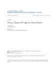University of Nebraska - Lincoln DigitalCommons@University of Nebraska - Lincoln Robert Katz Publications Research Papers in Physics and Astronomy 1-1-1958 Physics, Chapter 40: Light as a Wave Motion Henry Semat City College of New York Robert Katz University of Nebraska - Lincoln, rkatz2@unlnotes.unl.edu Follow this and additional works at: http://digitalcommons.unl.edu/physicskatz Part of the Physics Commons Semat, Henry and Katz, Robert, "Physics, Chapter 40: Light as a Wave Motion" (1958). Robert Katz Publications. Paper 177. http://digitalcommons.unl.edu/physicskatz/177 This Article is brought to you for free and open access by the Research Papers in Physics and Astronomy at DigitalCommons@University of Nebraska Lincoln. It has been accepted for inclusion in Robert Katz Publications by an authorized administrator of DigitalCommons@University of Nebraska Lincoln. 40 Light as a Wave Motion 40-1 Wave Versus Particle Let us recount some of the characteristics of the motion of particles and the propagation of waves, with a view toward analyzing the behavior of light. In accordance with Newton's first law, a particle moves in a straight-line path in the absence of external forces. Thus we might infer, as Newton suggested, that light is composed of particles, and that, in a continuous medium, there is no deflecting force on the light particles. At the interface between two media, light may be propagated in a straight line parallel to the interface. Thus even at an interface there is no force on the particles of light unless the light passes through the interface, and in that event the force acting must be perpendicular to the interface. To account for the fact that light is refracted toward the normal on passing from a rare to a dense medium, as from air to water as shown in Figure 40-1, it is necessary to assume that the force is directed from the rare to the dense medium. The normal component of the velocity is increased, while the tangential component remains the same, so that the refracted ray is more nearly directed toward the normal. From this we see that a particle theory of light implies that the velocity of light in the dense medium is greater than the velocity of light in the rare medium. As we have already seen, a wave theory accounts for refraction by requiring that the velocity in the dense medium is less than the velocity in the rare medium. This particular contest between the wave and particle theories was settled by Focault in 1850 (almost 175 years after the controversy between the points of view of Newton and Huygens was initiated) by measurement of the velocity of light in water and in air. Focault showed that the velocity of light in water was less than its velocity in air, in quantitative agreement with the wave-theory explanation of the index of refraction of water. A second aspect of the differences between particles and waves lies in their respective principles of superposition. When a shotgun is fired at a 740 §40.1 WAVE VERSUS PARTICLE 741 target, a certain number of pellets penetrate each square centimeter of target area. When two identical guns are fired at the same target, we infer that an increased number of pellets penetrates each square centimeter of target, and that this number is approximately twice the number of pellets per unit area obtained with one gun; that is, we expect particles to obey an arithmetic superposition principle. At a point in a medium where the paths of two waves intersect, the medium is simultaneously displaced by the two waves, so that the resultant displacement is the vector sum of the Normal Rare medium Normal force at interface (vr)t == (Vi)t Dense medium Fig. 40.1 If light were composed of a beam of particles, the velocity V r of the refracted ray in an optically dense medium would be greater than the velocity Vi of the incident ray in the optically rare medium. individual displacements. The magnitude of the instantaneous displacement of the medium is obtained from a vector superposition principle. We have already seen in Chapters 20 and 21 that the superposition principle was capable of explaining both beats and standing waves. One vibrating source at the end of a long string generated a wave in the string which caused every particle of the string to vibrate. Two identical vibrating sources at opposite ends of the string did not yield a wave of twice the original displacement at every point of the string, but, instead, nodes were produced at intervals of a half wavelength, at which there was no vibration at all. The difference between the superposition principles appropriate to particles and to waves results in our expectation that waves must display such phenomena as beats, standing waves, and interference and diffraction 742 LIGHT AS A WAVE MOTION §40-2 effects, under appropriate conditions, while particles do not exhibit such phenomena. In the succeeding sections we shall examine some of the interference and diffraction effects exhibited by light. These lead us to the conclusion that light is a wave motion. 40-2 Interference of Light from Two Sources Let us suppose that two vibrating needles are immersed in a ripple tank, and that these vibrate in phase with each other and are driven at the same frequency. Each of the needles is a source of waves which spread out along the surface of the water of the tank as a series of ripples, or Huygens' wavelets. Let us represent the crest of each ripple by a solid line and the trough of each ripple by a dashed line, as in Figure 40-2. Each circular ripple spreading out from a particular source 8 1 represents a disturbance which was initiated by the source at some particular time, while a circle of smaller radius represents a disturbance initiated by the source at a later time, when the phase angle of the source vibration was a different value. For example, the phase angle of any dashed circle is 180° greater than the phase angle of the next greater solid circle, concentric with it, and