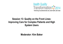 Session 13: Quality on the Front Lines: Improving Care for Complex Patients and High System Users Moderator: Kim Baker Presenter Disclosures Presenters: Kim Baker, Frank DeCicco, Karen Truter, Christina Fabbruzzo-Cota, Christine Soong Relationships with commercial interests: None Disclosure of Commercial Support This session has received no commercial support Tweet with us Use hashtag #HQT2014 4 Sustaining Improvements through a Daily Management System Frank DeCicco Toronto East General Hospital Overview The “Sustain” Challenge Assign Priority Patient Care Staff Training QIP Strategic Plan Accreditation Construction/ Redevelopment 7 Maintaining Management Excellence (MME) Structured, protected communication channels to get the right information to the right person at the right time 8 Organizational Alignment of Improvement Initiatives 9 MME Implementation Strategy Month 1 Month 2 Check-ins Group 1 Group 2 Communication Channel: Primary Objective: 10 Month 3 Huddles Workshop 1&2 Rounding Workshop 3&4 Workshop 1&2 With your direct reports Identify issues before they become crises Workshop 5&6 Workshop 3&4 • Learning by doing • On-going TIS team support With your team Align team with depart./hospital goals and build teamwork Workshop 5&6 • Learning by doing • On-going TIS team support With your patients / customers Drive satisfaction and generate improvement initiatives • Continuous improvement • On-going TIS team support Is it Working? Outcome Measures • Staff Engagement Survey Results Process Measures • Number of Huddles created and sustained • Percent of Leadership (VPs, Directors, Managers) with Scheduled Check-ins & Rounding Qualitative Measures • Staff feedback 11 Staff Engagement (National Research Corporation - Canada) * Significantly Different from Your Current Score 12 Theme Low High OHA TEGH Engagement (6 GTA hospitals) 47.6 66.5 57.5 66.5 Staff Satisfaction Survey Results (National Research Corporation - Canada) 13 Question 2011/12 2012/13 Change Opportunity to make improvement in work 75.1 % 76.0 % + 0.9 % Opportunity to take initiative 80.1 % 82.3 % + 2.2 % Ability to make suggestions to improve the work of unit / team 66.5 % 67.8 % + 1.3 % Willingness to trust the organization 51.0 % 57.7 % + 6.7 % Significant? Process Measures 70 60 11 50 Number of Huddles 40 30 20 42 46 50 2012 2013 2014 10 0 0 2011 100 Percent Leadership with Scheduled Check-ins /Rounding 28 80 60 40 20 0 72 2013 2014 41 0 2011 2012 MME 14 72 In-progress Staff Feedback “MME has helped me better understand where to focus my attention – I can see patterns over time, and better understand stressors for my staff.” - Manager, Emergency Department, Toronto East General Hospital “The check-in meetings with managers have been invaluable. They keep our team on track weekly with quality initiatives, patient concerns and staff matters. Gone is the day of ‘Surprise! Caught you off-guard” issues. - 15 Director, Complex Continuing Care, Toronto East General Hospital Key Success Factors • The “WHY?” must be compelling • Keep it simple • Senior leadership models the way 16 Improved Care for Hospitalized Seniors’ through Comprehensive Gerontological Assessment, Geriatric Syndromes, and Assess and Restore Program Presenter: Karen Truter RN(EC), BN, MN, CHPCN(C) Northumberland Hills Hospital (NHH), Cobourg, ON, Canada Understanding The Community We Service Northumberland Hills Hospital, Ontario • SENIORS 65+ • 26.5% of the Cobourg, and 20.7% of the NHH catchment is 65+ compared to the provincial rate of 14.6%. • It is anticipated that Ontario will have a 25% rate of 65+ by 2050. • As such NHH is significantly ahead of the curve in realizing the impact of serving such a high number of seniors. 18 Purpose of the Assess & Restore Program • Avoid iatrogenesis in acute care and therefore trial direct admissions from emergency • Provide Comprehensive Gerontological Assessments and corresponding interventions • Base the care around the immediate health need (from the person and/or caregiver perspective) • Identify the underlying gerontological needs (syndromes) 19 Program Overview • Timelines: pilot length Feb 13 – March 31st, 2014 (46 days) • N=10 • Challenges in admitting to Assess & Restore – Surge, Patients waiting for LTC • Direct admissions from emergency – 70% • Staff ratios and continuity of care achieved • 1RN to 4 patients, 6RNs covered 24hr/7day • 1 OT/PT Therapy Assistant 20 Patient Demographics • 60% male, 40% female Age / % of Pt population • 65-70 20% • 71-75 20% • 76-80 0% • 80-84 10% • 85- over 50% 21 Indicators Every patient will have a Comprehensive Gerontological Assessment by NP/IP team Each patient will be followed up with a telephone call within 48hrs by the NP 100% 88% Ave 24.4 Points 100% 50% of patients will return home 75% 22 50% of patients will have a 10 point increase in Functional Independence Measure (FIM) Shorter LOS than the average combined LOS of Acute/Restorative Care = 33.75 days 15.9 days Geriatric Syndromes 23 Frailty & Geriatric Syndromes • Frailty is a state of increased vulnerability where apparently small events or stressors result in a disproportionate change in health state • The number and type of geriatric syndromes identified through the Assess and Restore population is indicative of frailty. • The most evidence-based process to detect and grade frailty for severity is a Comprehensive Gerontological Assessment. (Clegg, Young, Iliffe, Rikkert, Rockwood, 2013). 24 Relevance of Pilot • Assess and Restore not only provided state of the art practice in identifying frailty but went further in basing all care on the gerontology syndromes. • Identified the significance of geriatric syndromes and the need to assess and treat through gerontological approaches • High incidence of geriatric syndromes indicated we were capturing the most frail population • Contrast with acute stays where 