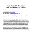 Tech Rider: His Girl Friday Live from WVL Radio Theatre Contact: Willie Repoley at Immediate Theatre Project 15 Stage Lane, Asheville, NC 28801 Cell - 828.280.3577; willie@immediatetheatre.org * Important: See special marketing opportunities described on next page... The following technical requirements are integral to the performance. If any of the requirements included cannot be met, please contact Producer Willie Repoley promptly at the number above. While the production allows for flexibility of venues, it is essential to discuss and approve required changes before a commitment to perform is made, in order to ensure the highest quality performance. There are minimal specific measurements, particularly in regard to electrics, batten drop placement, cyc, scrim, et al. This is intentional due to the variation of venues in which the performance can be presented, with the specifications noted in this document based on optimum facility conditions. Production expectations are flexible and can be tailored to the capability of individual facilities. Please read this rider carefully. It is an essential part of the attached contract for a performance by the Artist. By signing it, you are agreeing to supply the Artist(s) with certain equipment and working conditions that are essential to this performance. Any breach of the terms of this rider is a breach of the contract and may cause the Artist to cancel the performance, without releasing you from obligation to pay them. * Presenter’s Additional Unique Marketing Opportunities A. Customized radio commercial performed live during the play Built into the performance is the opportunity for a customized/localized radio commercial, if the presenter desires. Worked into the fabric of the show, just as in vintage 1940's radio, sponsors are thanked at the beginning and end of each show and have a tailored, period-style approx. 2-min. advertisement delivered live by the actors during a "commercial break” in the story. The audience enjoys the nostalgia of old fashioned advertising styles combined with the local flavor of a real ad for a neighborhood business or venue sponsor, making the advertisement a real conversation topic for the audience. To keep the magic and illusion of our 1940's world alive, the commercial is best suited to businesses that existed or could have existed in 1946: car dealerships, restaurants, clothing stores, pharmacies, etc. If you’re unsure about how a particular business might “fit” into this period style, don’t hesitate to contact Willie Repoley to discuss. The company is quite creative in turning your idea into reality! The script for the commercial will be created by the company. A form is included in this tech rider for you to use to provide the essential information required by the producing company to craft the commercial spot, the script of which will be sent to you for your approval. Arrangements for this custom commercial must be confirmed no later than 90 days prior to your performance date. Complete and return the one-page form at the end of this rider. B. Live One-Time On-Air Radio Broadcast in Your Community Immediate Theatre Project offers the rights for presenters who wish to record this performance for a one-time live or delayed re-broadcast of this performance on your local community radio. A special one-page licensing agreement will be required between Immediate Theatre Project and the presenting organization, with an added fee of $550 for this taping/broadcast privilege. This fee will be payable on day of live performance, prior to performance, directly to Immediate Theatre Project. Confirmation of this option must be confirmed no later than 90 days prior to performance date. For information, contact Willie Repoley. 1. Artist shall receive billing on all advertising, posters, flyers, programs, tickets, as: “HIS GIRL FRIDAY: LIVE FROM WVL RADIO THEATRE” An adaptation by W.V.R. Repoley Produced by Immediate Theatre Project 2. Presenter shall provide the following at his/her sole expense: A. DRESSING ROOMS: The venue must provide two clean lockable private dressing rooms, each capable of accommodating three actors comfortably. Dressing rooms shall be well lighted, and heated or air-conditioned. Each room must have nonpublic access to performing area. Each room must have lights and mirrors, chairs and tables, costume rack, and nearby clean lavatory with sink and hot and cold running water, well supplied with soap, toilet tissue and towels. Company must have uninterrupted access to dressing rooms throughout the duration of the residency, including load-in and load-out. B. HOSPITALITY & LODGING: Presenter will provide catering for load-in (see below) plus a full hot meal (no fast food) for five-to-six persons at least two hours before each specified curtain time. Due to demands of the company’s touring and performance schedule, the hospitality provision as outlined is not “optional” and is expected to be met in earnest to the best of the Presenter’s capability. At load-in: Ample hot water for tea (assorted, decaffeinated and caffeinated, herbal) and coffee, with sugar, sugar substitutes, honey, lemon, and milk. Additionally, five bottles of an available sports drink (flavored Gatorade is sufficient); a selected variety of fresh-fruits (not ‘prepared’). A minimum of ten bottled waters, at room temperature, or a jug with fresh, clean water and cups, sufficient for five people. Several hand towels available off stage. If applicable, hospitality items must be replenished between performance. Hot meal: Company will provide information regarding any dietary restrictions at least two weeks before scheduled performance. Accommodations: All accommodations approved by artist; 5 rooms required. Private entry and private bath required, with working climate-control capability. Minimum standard for hotel accommodations should be comparable to (or above) those similar to Hampton Inn or Fairfield Inn (Sta