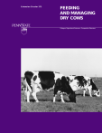 Extension Circular 372 FEEDING AND MANAGING DRY COWS College of Agricultural Sciences • Cooperative Extension CONTENTS The dry period 3 Feeding the dry cow Forages Grain 4 4 5 Management 7 Dry-off day and the first week after the last milking 7 Dry period up to three weeks before freshening 7 Transition diet during the last three weeks of the dry period 7 Nutrient requirements Metabolic disorders Milk fever Ketosis 9 9 9 12 Fatty liver syndrome Retained placenta 13 14 Displaced abomasum Udder edema 2 15 14 P roper management and nutrition of the dry cow are critical for obtaining maximum dry matter intake, good health, increased reproductive efficiency, and optimum milk production in the following lactation. These can be achieved by feeding balanced diets which will aid in avoiding metabolic disorders and maintaining improved disease resistance. Periodic checking on the body condition of cows assures adequate, but not excessive, body reserves of energy. Providing a sound health care program also is important to dry cow management. A successful dry cow program requires the dairy manager to know which disorders the dry cows are prone to, how to prevent them, and when necessary, how the manager and veterinarian may treat them. result in excess body condition. Figure 1 below illustrates that the optimum milk yield is greater for cows having a dry period close to 60 days than for those having greater or fewer days dry. While the dry period may be reduced slightly to 50 days with very persistent cows, it is not beneficial to reduce these dry days further. THE DRY PERIOD Another point to keep in mind is the production level that cows should be dried off at, which depending on a cow’s production, may result in a dry period longer or shorter than 60 days. The production level for drying off a cow generally is defined as the daily milk yield at which the return from milk is equal to the labor cost for milking plus the cost of additional feed above maintenance and pregnancy levels. Both the current and subsequent lactation periods must be taken into consideration when making this decision. The amount of milk produced during a cow’s lactation can be influenced by the length of her dry period. Many studies have shown that cows dry for 60 days give approximately 250 pounds more milk the following lactation, compared to cows dry fewer than 40 days, which produce around 500 pounds less milk the following lactation. Dry periods longer than 60 days show only a moderate decline in milk production compared to those cows dry 60 days. The reason for keeping dry periods close to 60 days is short dry periods do not allow enough time for mammary gland involution while long dry periods Figure 1. Effect of the number of days dry on difference from herdmate milk in the subsequent lactation Difference from herdmates Restoring body energy and nutrient reserves is more efficient if accomplished during late lactation rather than during the dry period. The number of mammary secretory cells is a major factor affecting milk yield. These secretory cells normally proliferate during the later part of the dry period. The dry period is necessary, however, to allow the mammary gland to go through a normal period of involution and to ensure that the mammary cell numbers continue to proliferate normally during early lactation. A short or absent dry period greatly reduces the number of secretory cells in the mammary gland. The two considerations that must be taken into account when deciding to dry off a cow are the gains that can be achieved in production and profits from extending the current lactation, and any losses in production and profit in the following lactation that result from fewer days dry. As mentioned earlier, the closer the dry period can be kept to 60 days, the greater the opportunity to achieve optimum milk yields. +500 +250 0 -250 -500 -750 -1,000 -1250 -1500 10 20 30 40 50 60 70 80 90 100 Days dry 3 FEEDING THE DRY COW The purpose of controlling the nutritional status of the dry cow is to maintain body condition at 3+ to 4(3.3–3.7) on a scale from 1 (thin) to 5 (fat). This control can be achieved by feeding a relatively low energy ration that provides adequate, but not excessive, levels of protein, minerals, and vitamins. Providing proper levels of these nutrients allows cows to calve with adequate, but not excessive, body fat, protein, and metabolite reserves. Once a cow freshens, she will need to rely on her energy reserves for the next 6 to 8 weeks to achieve maximum milk production (Figure 2 below). If the dairy cow does not have these reserves, she will develop a severe negative energy balance, which will limit her peak milk production and cause excessive body weight loss. At 8 to 12 weeks postpartum, beyond the point of peak milk yield, dry matter intake will normally peak, which allows the dairy cow to begin equilibra- tion of energy input and output, thereby maintaining body energy reserves and replenishing her expended body reserves. Cows are able to show signs of heat and conceive more efficiently when maintaining or gaining body weight. Forages Producers must use greater care when choosing a forage to feed to dry cows then they would if they were feeding milk cows. Certain forages consumed in large quantities may increase a dry cow’s risk of metabolic problems. Dry cows should be kept separated from the milking herd so that the proper forages and concentrates can be allotted to them. Corn silage preferably should not provide more than 50 percent of forage dry matter intake. Dry cows fed corn silage greater than 50 percent forage dry matter may become overconditioned and have more metabolic and reproductive problems near calving due to the higher energy content of the forages. 110 Body weight (lb) Daily feed intake or milk production (lb) Figure 2. Changes in milk production, feed intake, and body weight during a lactation 100 90 80 70 60 1,600 50 1,500 40 1,400 30 1,300 4 8 12 16 20 24 28 32